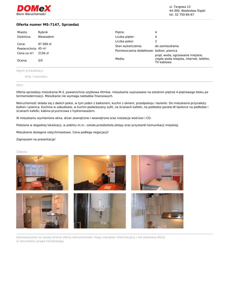 ul. Targowa 12 44-300, Wodzisław Śląski tel. 32 750-84-67 Oferta numer MS-7147, Sprzedaż Miasto: Rybnik Piętro: 4 Dzielnica: Niewiadom Liczba pięter: 4 Cena: 97 000 zł Liczba pokoi: 2 Stan wykończenia: do zamieszkania Powierzchnia: 45 m2 Cena za m2: Ocena: 2156 zł 5/5 Pomieszczenia dodatkowe: balkon, piwnica Media: prąd, woda, ogrzewanie miejskie, ciepła woda miejska, internet, telefon, TV kablowa Agent prowadzący: Imię i nazwisko: Opis: Oferta sprzedaży mieszkania M-3, powierzchnia użytkowa 45mkw. mieszkanie usytuowane na ostatnim piętrze 4-piętrowego bloku po termomodernizacji. Mieszkanie nie wymaga nakładów finansowych. Nieruchomość składa się z dwóch pokoi, w tym jeden z balkonem, kuchni z oknem, przedpokoju i łazienki. Do mieszkania przynależy balkon i piwnica. Kuchnia w zabudowie, w kuchni podwieszany sufit, na ścianach kafelki, na podłodze panele.W łazience na podłodze i ścianach kafelki, kabina prysznicowa z hydromasażem. W mieszkaniu wymienione okna, drzwi zewnętrzne i wewnętrzne oraz instalacje wod-kan i CO. Położone w dogodnej lokalizacji, w pobliżu m.in.: szkoła.przedszkole,sklepy oraz przystanki komunikacji miejskiej. Mieszkanie dostępne natychmiastowo. Cena podlega negocjacji! Zapraszam na prezentację! Zdjęcia: Zamieszczone na naszej stronie oferty nieruchomości mają charakter informacyjny i nie stanowią oferty w rozumieniu prawa handlowego.