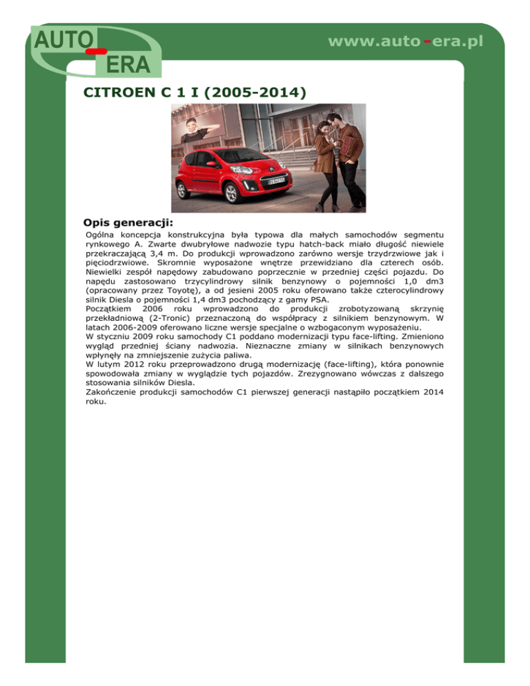 www.auto - era.pl CITROEN C 1 I (2005-2014) Opis generacji: Ogólna koncepcja konstrukcyjna była typowa dla małych samochodów segmentu rynkowego A. Zwarte dwubryłowe nadwozie typu hatch-back miało długość niewiele przekraczającą 3,4 m. Do produkcji wprowadzono zarówno wersje trzydrzwiowe jak i pięciodrzwiowe. Skromnie wyposażone wnętrze przewidziano dla czterech osób. Niewielki zespół napędowy zabudowano poprzecznie w przedniej części pojazdu. Do napędu zastosowano trzycylindrowy silnik benzynowy o pojemności 1,0 dm3 (opracowany przez Toyotę), a od jesieni 2005 roku oferowano także czterocylindrowy silnik Diesla o pojemności 1,4 dm3 pochodzący z gamy PSA. Początkiem 2006 roku wprowadzono do produkcji zrobotyzowaną skrzynię przekładniową (2-Tronic) przeznaczoną do współpracy z silnikiem benzynowym. W latach 2006-2009 oferowano liczne wersje specjalne o wzbogaconym wyposażeniu. W styczniu 2009 roku samochody C1 poddano modernizacji typu face-lifting. Zmieniono wygląd przedniej ściany nadwozia. Nieznaczne zmiany w silnikach benzynowych wpłynęły na zmniejszenie zużycia paliwa. W lutym 2012 roku przeprowadzono drugą modernizację (face-lifting), która ponownie spowodowała zmiany w wyglądzie tych pojazdów. Zrezygnowano wówczas z dalszego stosowania silników Diesla. Zakończenie produkcji samochodów C1 pierwszej generacji nastąpiło początkiem 2014 roku.