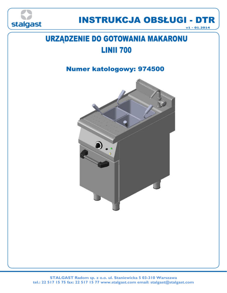 STALGAST Radom sp. z o.o. ul. Staniewicka 5 03-310 Warszawa tel.: 22 517 15 75 fax: 22 517 15 77 www.stalgast.com email: [email protected] 1. INSTRUKCJE BEZPIECZEŃSTWA……………………………………………………. 3 2. PRZEZNACZENIE URZĄDZENIA……………………………………………….……. 4 3. DANE TECHNICZNE……………………………………………………………………. 4 4. CHARAKTERYSTYKA BUDOWY URZĄDZENIA……………………………….... 5 5. INSTALACJA………………………………………………………….……………...….... 5 6. ZASADY BHP……………………………………………………….…………………….. 6 7. OBSŁUGA URZĄDZENIA……………………………………………….……………... 6 8. KONSERWACJA………………………………………….…………………………….... 7 9. PAKOWANIE, ŁADOWANIE I TRANSPORT……………………………….…….. 8 10. WYKAZ CZĘŚCI ZAMIENNYCH…………………………………………………….. 8 11. SCHEMAT ELEKTRYCZNY……………………………………………………………. 10 12. USUWANIE ZUŻYTYCH URZĄDZEŃ……………………………………………… 10 13. GWARANCJA………………………………………………….…………………....……. 10 2 STALGAST Radom sp. z o.o. ul. Staniewicka 5 03-310 Warszawa tel.: 22 517 15 75 fax: 22 517 15 77 www.stalgast.com email: [email protected] Dziękujemy Państwu za zakup naszego produktu. Przed pierwszym użyciem prosimy dokładnie zapoznać się z niniejszą instrukcją obsługi. Kopiowanie niniejszej instrukcji bez zgody producenta jest zabronione. Zdjęcia oraz rysunki mają charakter poglądowy i mogą różnić się od zakupionego urządzenia. UWAGA: Instrukcję należy przechowywać w bezpiecznym oraz dostępnym dla personelu miejscu. Producent zastrzega sobie prawo do zmiany parametrów technicznych urządzeń bez zapowiedzi. 1. INSTRUKCJE BEZPIECZEŃSTWA Uwaga! Jeżeli urządzenie do gotowania makaronu zostało uszkodzone podczas transportu nie wolno go podłączać do źródła zasilania! Nieprawidłowa obsługa i niewłaściwe użytkowanie może spowodować poważne uszkodzenie urządzenia lub zranienie osób. Urządzenie może być stosowane wyłącznie w celu, do którego zostało zaprojektowane. Producent nie ponosi żadnej odpowiedzialności za szkody spowodowane nieprawidłową obsługą i niewłaściwym użytkowaniem urządzenia. W czasie użytkowania zabezpiecz urządzenie i wtyczkę przewodu zasilającego przed kontaktem z wodą lub innymi płynami. W przypadku, gdyby przez nieuwagę urządzenie wpadło do wody lub zostało zalane wodą, należy natychmiast wyciągnąć wtyczkę z gniazda zasilającego, a następnie zlecić kontrolę urządzenia specjaliście. Nieprzestrzeganie tej instrukcji może spowodować zagrożenie życia. Nigdy nie otwieraj samodzielnie obudowy urządzenia. Nie wkładaj żadnych przedmiotów w otwory w obudowie urządzenia. Nie dotykaj wtyczki przewodu zasilającego wilgotnymi rękami. Regularnie kontroluj stan wtyczki i przewodu zasilającego. W przypadku wykrycia uszkodzenia wtyczki lub przewodu zasilającego, zleć naprawę w wyspecjalizowanym punkcie naprawczym. W przypadku, gdy urządzenie spadnie lub ulegnie uszkodzeniu w inny sposób, przed dalszym użytkowaniem zawsze zleć przeprowadzenie kontroli i ewentualną naprawę w wyspecjalizowanym punkcie naprawczym. Nigdy nie naprawiaj urządzenia samodzielnie - może to spowodować zagrożenie życia. Zabrania się dokonywania przeróbek i napraw przez osoby nie przeszkolone zawodowo. Chroń przewód zasilający przed kontaktem z ostrymi lub gorącymi przedmiotami, a także z dala od otwartego źródła ognia. Jeżeli chcesz odłączyć urządzenie z gniazda zasilającego, zawsze chwytaj za wtyczkę, nigdy nie ciągnij za przewód zasilający. Zabezpiecz przewód zasilający (lub przedłużacz), aby nikt przez omyłkę nie wyciągnął go z gniazda zasilającego lub się o niego nie potknął. Jeżeli przewód zasilający ulegnie uszkodzeniu to powinien być wymieniony. Przewód zasilający może być wymieniony tylko w specjalistycznych zakładach naprawczych lub przez wykwalifikowaną osobę. Kontroluj funkcjonowanie urządzenia w czasie użytkowania. Nie należy zezwalać na użytkowanie urządzenia przez osoby niepełnoletnie, osoby upośledzone fizycznie lub umysłowo oraz upośledzone pod względem zdolności ruchowej, a także osoby nieposiadające odpowiedniego doświadczenia i wiedzy dotyczącej właściwego użytkowania urządzenia. Wyżej wymienione osoby mogą obsługiwać urządzenie jedynie pod nadzorem osoby odpowiedzialnej za bezpieczeństwo. Jeżeli urządzenie nie jest w danej chwili użytkowane lub jest właśnie czyszczone, zawsze odłącz je od źródła zasilania, wyciągając wtyczkę z gniazda zasilającego. UWAGA: Jeżeli wtyczka przewodu zasilającego jest podłączona do gniazda zasilającego, urządzenie cały czas pozostaje pod napięciem. Niedozwolone jest włączanie urządzenia podczas gdy zbiornik jest pusty gdyż spowoduje to nieodwracalne i nagłe uszkodzenie zbiornika. Przed przystąpieniem do czyszczenia i konserwacji urządzenia upewnij się że nie jest gorące Wyłącz urządzenie, zanim wyciągniesz wtyczkę z gniazda zasilającego. Nigdy nie ciągnij urządzenia za przewód zasilający. Urządzenie po zainstalowaniu musi być widoczne i łatwo dostępne. Należy zapewnić łatwość dostępu do wyłączenia wtyczki przewodu zasilającego. 3 STALGAST Radom sp. z o.o. ul. Staniewicka 5 03-310 Warszawa tel.: 22 517 15 75 fax: 22 517 15 77 www.stalgast.com email: [email protected] 2. PRZEZNACZENIE URZĄDZENIA Elektryczne urządzenie do gotowania makaronu linii 700 model 974500 przeznaczone jest do profesjonalnego użytku w punktach zbiorowego żywienia, barach, restauracjach itp. Urządz