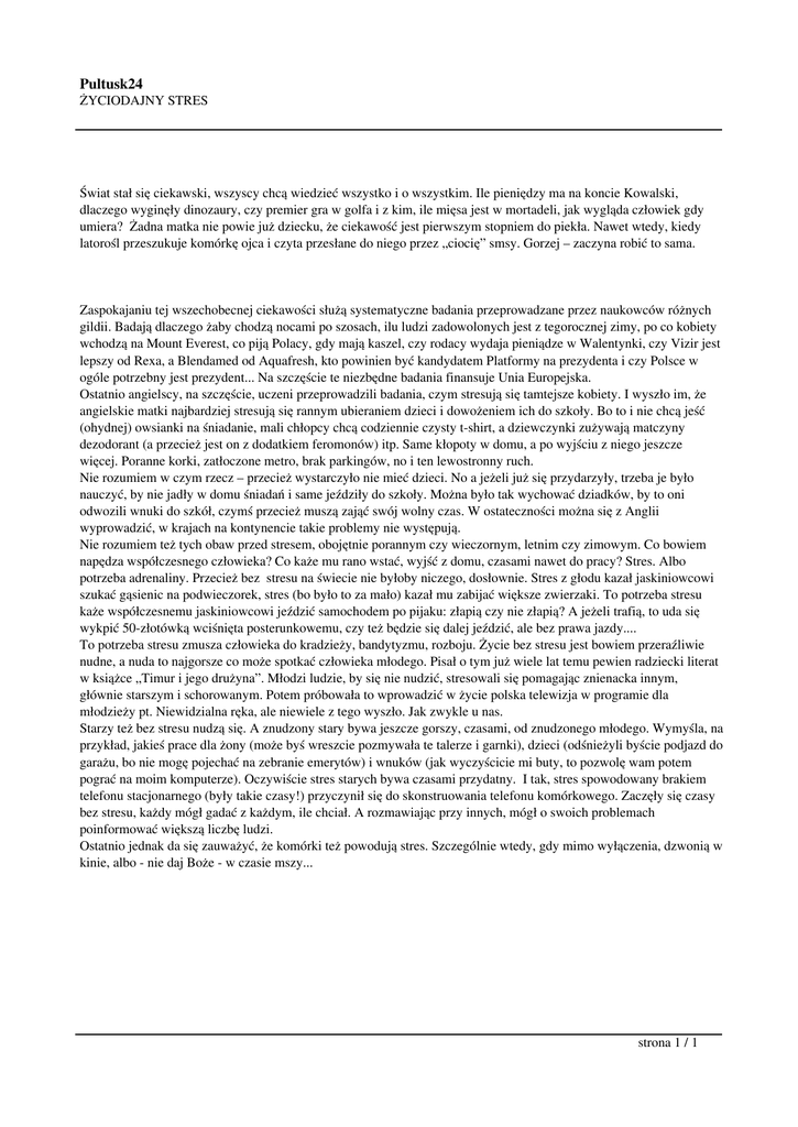 Pultusk24 ŻYCIODAJNY STRES Świat stał się ciekawski, wszyscy chcą wiedzieć wszystko i o wszystkim. Ile pieniędzy ma na koncie Kowalski, dlaczego wyginęły dinozaury, czy premier gra w golfa i z kim, ile mięsa jest w mortadeli, jak wygląda człowiek gdy umiera? Żadna matka nie powie już dziecku, że ciekawość jest pierwszym stopniem do piekła. Nawet wtedy, kiedy latorośl przeszukuje komórkę ojca i czyta przesłane do niego przez „ciocię” smsy. Gorzej – zaczyna robić to sama. Zaspokajaniu tej wszechobecnej ciekawości służą systematyczne badania przeprowadzane przez naukowców różnych gildii. Badają dlaczego żaby chodzą nocami po szosach, ilu ludzi zadowolonych jest z tegorocznej zimy, po co kobiety wchodzą na Mount Everest, co piją Polacy, gdy mają kaszel, czy rodacy wydaja pieniądze w Walentynki, czy Vizir jest lepszy od Rexa, a Blendamed od Aquafresh, kto powinien być kandydatem Platformy na prezydenta i czy Polsce w ogóle potrzebny jest prezydent... Na szczęście te niezbędne badania finansuje Unia Europejska. Ostatnio angielscy, na szczęście, uczeni przeprowadzili badania, czym stresują się tamtejsze kobiety. I wyszło im, że angielskie matki najbardziej stresują się rannym ubieraniem dzieci i dowożeniem ich do szkoły. Bo to i nie chcą jeść (ohydnej) owsianki na śniadanie, mali chłopcy chcą codziennie czysty t-shirt, a dziewczynki zużywają matczyny dezodorant (a przecież jest on z dodatkiem feromonów) itp. Same kłopoty w domu, a po wyjściu z niego jeszcze więcej. Poranne korki, zatłoczone metro, brak parkingów, no i ten lewostronny ruch. Nie rozumiem w czym rzecz – przecież wystarczyło nie mieć dzieci. No a jeżeli już się przydarzyły, trzeba je było nauczyć, by nie jadły w domu śniadań i same jeździły do szkoły. Można było tak wychować dziadków, by to oni odwozili wnuki do szkół, czymś przecież muszą zająć swój wolny czas. W ostateczności można się z Anglii wyprowadzić, w krajach na kontynencie takie problemy nie występują. Nie rozumiem też tych obaw przed stresem, obojętnie porannym czy wieczornym, letnim czy zimowym. Co bowiem napędza współczesnego człowieka? Co każe mu rano wstać, wyjść z domu, czasami nawet do pracy? Stres. Albo potrzeba adrenaliny. Przecież bez stresu na świecie nie byłoby niczego, dosłownie. Stres z głodu kazał jaskiniowcowi szukać gąsienic na podwieczorek, stres (bo było to za mało) kazał mu zabijać większe zwierzaki. To potrzeba stresu każe współczesnemu jaskiniowcowi jeździć samochodem po pijaku: złapią czy nie złapią? A jeżeli trafią, to uda się wykpić 50-złotówką wciśnięta posterunkowemu, czy też będzie się dalej jeździć, ale bez prawa jazdy.... To potrzeba stresu zmusza człowieka do kradzieży, bandytyzmu, rozboju. Życie bez stresu jest bowiem przeraźliwie nudne, a nuda to najgorsze co może spotkać człowieka młodego. Pisał o tym już wiele lat temu pewien radziecki literat w książce „Timur i jego drużyna”. Młodzi ludzie, by się nie nudzić, stresowali się pomagając znienacka innym, głównie starszym i schorowanym. Potem próbowała to wprowadzić w życie polska telewizja w programie dla młodzieży pt. Niewidzialna ręka, ale niewiele z tego wyszło. Jak zwykle u nas. Starzy też bez stresu nudzą się. A znudzony stary bywa jeszcze gorszy, czasami, od znudzonego młodego. Wymyśla, na przykład, jakieś prace dla żony (może byś wreszcie pozmywała te talerze i garnki), dzieci (odśnieżyli byście podjazd do garażu, bo nie mogę pojechać na zebranie emerytów) i wnuków (jak wyczyścicie mi buty, to pozwolę wam potem pograć na moim komputerze). Oczywiście stres starych bywa czasami przydatny. I tak, stres spowodowany brakiem telefonu stacjonarnego (były takie czasy!) przyczynił się do skonstruowania telefonu komórkowego. Zaczęły się czasy bez stresu, każdy mógł gadać z każdym, ile chciał. A rozmawiając przy innych, mógł o swoich problemach poinformować większą liczbę ludzi. Ostatnio jednak da się zauważyć, że komórki też powodują stres. Szczególnie wtedy, gdy mimo wyłączenia, dzwonią w kinie, albo - nie daj Boże - w czasie mszy... strona 1 / 1