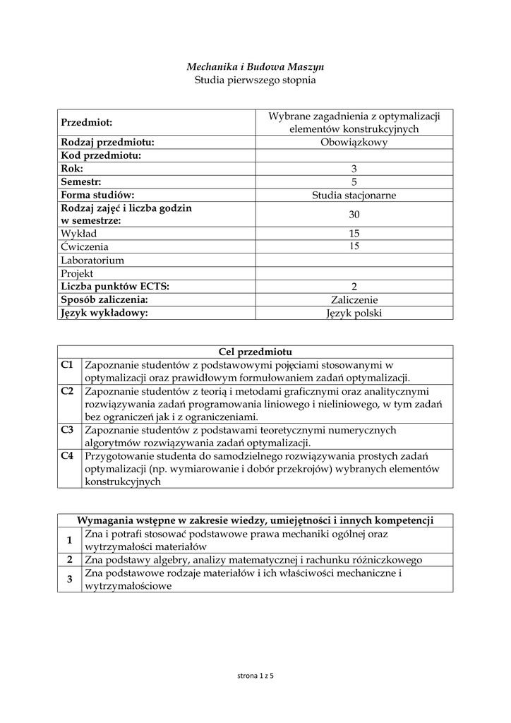 Mechanika i Budowa Maszyn Studia pierwszego stopnia Przedmiot: Rodzaj przedmiotu: Kod przedmiotu: Rok: Semestr: Forma studiów: Rodzaj zajęć i liczba godzin w semestrze: Wykład Ćwiczenia Laboratorium Projekt Liczba punktów ECTS: Sposób zaliczenia: Język wykładowy: C1 C2 C3 C4 Wybrane zagadnienia z optymalizacji elementów konstrukcyjnych Obowiązkowy 3 5 Studia stacjonarne 30 15 15 2 Zaliczenie Język polski Cel przedmiotu Zapoznanie studentów z podstawowymi pojęciami stosowanymi w optymalizacji oraz prawidłowym formułowaniem zadań optymalizacji. Zapoznanie studentów z teorią i metodami graficznymi oraz analitycznymi rozwiązywania zadań programowania liniowego i nieliniowego, w tym zadań bez ograniczeń jak i z ograniczeniami. Zapoznanie studentów z podstawami teoretycznymi numerycznych algorytmów rozwiązywania zadań optymalizacji. Przygotowanie studenta do samodzielnego rozwiązywania prostych zadań optymalizacji (np. wymiarowanie i dobór przekrojów) wybranych elementów konstrukcyjnych Wymagania wstępne w zakresie wiedzy, umiejętności i innych kompetencji Zna i potrafi stosować podstawowe prawa mechaniki ogólnej oraz 1 wytrzymałości materiałów 2 Zna podstawy algebry, analizy matematycznej i rachunku różniczkowego Zna podstawowe rodzaje materiałów i ich właściwości mechaniczne i 3 wytrzymałościowe strona 1 z 5 Efekty kształcenia W zakresie wiedzy: EK 1 Student zna podstawowe pojęcia teorii badań operacyjnych oraz rozróżnia podstawowe typy zadań optymalizacji EK 2 Zna podstawowe metody i algorytmy rozwiązywania zadań optymalizacji W zakresie umiejętności: EK 3 Potrafi sformułować zadanie optymalizacji matematycznej w odniesieniu do podstawowych elementów i zadań konstrukcyjnych EK 4 Potrafi rozwiązać proste zadanie optymalizacji elementów konstrukcyjnych w oparciu o poznane metody analityczne i numeryczne EK 5 Potrafi analizować i interpretować otrzymane wyniki obliczeń W zakresie kompetencji społecznych: EK 6 Student pracuje samodzielnie rozwiązując przedstawiony problem EK 7 Student dyskutuje w grupie dobór metody rozwiązania zagadnienia, uzasadniając dokonany wybór także w aspekcie pozatechnicznym Treści programowe przedmiotu W1 W2 W3 W4 W5 W6 W7 W8 W9 W10 W11 W12 Forma zajęć – wykłady Treści programowe Podstawowe definicje i pojęcia teorii optymalizacji. Przykłady zadań optymalizacji, klasyfikacje zadań optymalizacji. Własności wybranych zadań optymalizacyjnych. Rozwiązanie zadania optymalizacyjnego metodą graficzną. Analiza po-optymalizacyjna i badanie wyznaczonego rozwiązania optymalnego. Programowanie liniowe (LP). Formułowanie zadań programowania liniowego. Klasyfikacja zadań programowania liniowego. Metoda graficzna rozwiązywania zadań programowania liniowego. Programowanie liniowe (LP) c.d. Postać ogólna, standardowa i kanoniczna zadania programowania liniowego. Algorytm sympleks. Ocena rozwiązania. Programowanie liniowe w zbiorach dyskretnych – zadanie programowania całkowitoliczbowego, metody rozwiązań Przykłady zadań programowania liniowego w zbiorach dyskretnych Warunki optymalności Zadania programowania nieliniowego – zadanie bez ograniczeń – warunki konieczne i wystarczające; metody rozwiązań analitycznych Analityczne rozwiązywanie zadania programowania nieliniowego – zadanie z ograniczeniami równościowymi – metoda mnożników Lagrange'a Analityczne rozwiązywanie zadania programowania nieliniowego – zadanie z ograniczeniami równościowymi i nierównościowymi – warunki strona 2 z 5 W13 W14 W15 ĆW1 ĆW2 ĆW3 ĆW4 ĆW5 ĆW6 ĆW7 ĆW8 ĆW9 ĆW10 ĆW11 ĆW12 ĆW13 ĆW14 ĆW15 1 2 Kuhna-Tuckera Zadanie programowania nieliniowego z ograniczeniami równościowymi i nierównościowymi – warunki Kuhna-Tuckera c.d. Optymalizacja wielokryterialna Zaliczenie Forma zajęć – ćwiczenia Treści programowe Formułowanie zadań optymalizacji. Rozwiązywanie zadań programowania nieliniowego metodą graficzną Rozwiązywanie zadań programowania nieliniowego metodą graficzną c.d. Analiza po-optymalizacyjna, badanie rozwiązań zadania optymalizacyjnego Sformułowanie zadania programowania liniowego, zapis w postaci kanonicznej Rozwiązanie zadania programowania liniowego metodą Simplex. Ocena rozwiązania. Sformułowanie zadania programowania całkowitoliczbowego Rozwiązywanie zadania programowania całkowitoliczbowego na przykładzie zadania liniowego. Ocena rozwiązania. Sformułowanie zadania optymalizacji topologicznej w projektowaniu konstrukcji Zastosowanie optymalizacji topologicznej w projektowaniu konstrukcji c.d.. Ocena rozwiązania. Sformułowanie zadania programowania nieliniowego Analityczne rozwiązywanie zadania programowania nieliniowego Rozwiązanie zadania programowania nieliniowego na przykładzie optymalizacji konstrukcji kratownicowej Optymalizacji konstrukcji kratownicowej c.d. Ocena rozwiązania. Zaliczenie/Kolokwium Metody dydaktyczne Wykład informacyjny z wykorzystaniem środków audiowizualnych. Na zajęciach są omawiane treści teoretyczne oraz przykłady zastosowań. Ćwiczenia: rozwiązywanie zadań przez studentów pod kontrolą prowadzącego metodami graficznymi , a także z wykorzystaniem metod numerycznych i oprogramowania komputerowego. Praktyczne zastosowanie omawianych treści wykładowych; dyskusja wyników. Obciążenie pracą studenta Średnia liczba godzin na zrealizowanie Forma aktywności aktywności Godziny kontaktowe z wykładowcą, w tym: Godziny kontaktowe z prowadzącym, 15 strona 3 z 5 realizowane w formie zajęć audytoryjnych Godziny kontaktowe z prowadzącym, realizowane w formie zajęć rachunkowych Godziny kontaktowe z prowadzącym, realizowane w formie konsultacji Praca własna studenta, w tym: Przygotowanie się do zajęć wykładowych i rachunkowych Łączny czas pracy studenta Sumaryczna liczba punktów ECTS dla przedmiotu: Liczba punktów ECTS w ramach zajęć o charakterze praktycznym (ćwiczenia