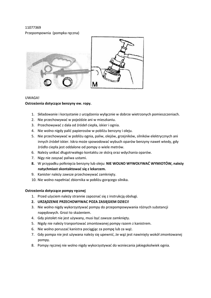 11077369 Przepompownia (pompka ręczna) UWAGA! Ostrzeżenia