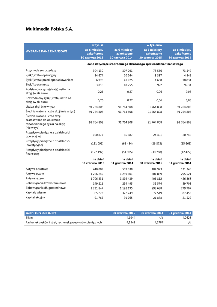 Multimedia Polska S.A. w tys. zł WYBRANE DANE FINANSOWE za 6 miesięcy zakończone 30 czerwca 2015 w tys. euro za 6 miesięcy zakończone 30 czerwca 2014 za 6 miesięcy zakończone 30 czerwca 2015 za 6 miesięcy zakończone 30 czerwca 2014 dane dotyczące śródrocznego skróconego sprawozdania finansowego Przychody ze sprzedaży 304 130 307 291 73 566 Zysk/(strata) operacyjny 34 674 20 244 8 387 4 845 Zysk/(strata) przed opodatkowaniem 6 978 41 925 1 688 10 034 Zysk/(strata) netto 73 542 3 810 40 255 922 9 634 Podstawowy zysk/(strata) netto na akcję (w zł/ euro) 0,26 0,27 0,06 0,06 Rozwodniony zysk/(strata) netto na akcję (w zł/ euro) 0,26 0,27 0,06 0,06 Liczba akcji (nie w tys.) 91 764 808 91 764 808 91 764 808 91 764 808 Średnia ważona liczba akcji (nie w tys.) 91 764 808 91 764 808 91 764 808 91 764 808 Średnia ważona liczba akcji zastosowana do obliczenia rozwodnionego zysku na akcję (nie w tys.) 91 764 808 91 764 808 91 764 808 91 764 808 Przepływy pieniężne z działalności operacyjnej 100 877 86 687 24 401 20 746 Przepływy pieniężne z działalności inwestycyjnej (111 096) (65 454) (26 873) (15 665) Przepływy pieniężne z działalności finansowej (127 197) (51 905) (30 768) (12 422) na dzień 31 grudnia 2014 na dzień 30 czerwca 2015 na dzień 31 grudnia 2014 na dzień 30 czerwca 2015 Aktywa obrotowe 440 089 559 838 104 923 131 346 Aktywa trwałe 1 266 242 1 259 601 301 889 295 521 Aktywa razem 1 706 331 1 819 439 406 812 426 868 Zobowiązania krótkoterminowe 149 211 254 495 35 574 59 708 Zobowiązania długoterminowe 1 231 847 1 192 195 293 688 279 707 Kapitały własne 325 273 372 749 77 549 87 453 Kapitał akcyjny 91 765 91 765 21 878 21 529 średni kurs EUR (NBP) 30 czerwca 2015 30 czerwca 2014 31 grudnia 2014 Bilans 4,1944 n/d 4,2623 Rachunek zysków i strat, rachunek przepływów pieniężnych 4,1341 4,1784 n/d MULTIMEDIA POLSKA S.A. Śródroczne skrócone sprawozdanie finansowe za okres 6 miesięcy zakończony dnia 30 czerwca 2015 roku wraz z raportem niezależnego Biegłego Rewidenta z przeglądu Multimedia Polska S.A. Śródroczne skrócone sprawozdanie finansowe za okres 6 miesięcy zakończony dnia 30 czerwca 2015 roku (w tysiącach PLN) Śródroczny Skrócony Rachunek Zysków i Strat………………………………………………………………………………………………………….3 Śródroczne Skrócone Sprawozdanie z Całkowitych Dochodów………………………………………………………………………………..4 Śródroczny Skrócony Bilans……………………………………………………………………………………………………………………………………….5 Śródroczny Skrócony Rachunek Przepływów Pieniężnych…………………………………………………………………………………………6 Śródroczne Skrócone Sprawozdanie ze Zmian w Kapitałach Własnych…………………………………………………………………….7 Śródroczne Skrócone Sprawozdanie ze Zmian w Kapitałach Własnych…………………………………………………………………….8 Dodatkowe noty objaśniające ............................................................................................................................................................................ 9 1. Informacje ogólne................................................................................................................................................................................. 9 2. Identyfikacja sprawozdania finansowego ................................................................................................................................... 9 3. Skład Zarządu Spółki ........................................................................................................................................................................... 9 4. Inwestycje Spółki ................................................................................................................................................................................ 10 5. Zatwierdzenie śródrocznego skróconego sprawozdania finansowego ...................................................................... 12 6. Podstawa sporządzenia śródrocznego skróconego sprawozdania finansowego .................................................. 12 7. Istotne zasady (polityka) rachunkowości ................................................................................................................................. 14 8. Nowe standardy i interpretacje, które zostały opublikowane, a nie weszły jeszcze w życie .............................. 14 9. Zmiana szacunków i korekty błędów ........................................................................................................................................ 15 10. Sezonowość działalności................................................................................................................................................................. 15 11. Przychody i koszty ............................................................................................................................................................................. 16 11.1. Przychody ze sprzedaży .................................................................................................................................................................. 16 11.2. Pozostałe przychody operacyjne ................................................................................................................................................. 16 11.3. Pozostałe koszty operacyjne ......................................................................................................................................................... 16 11.4. Przychody finansowe .....................................................................