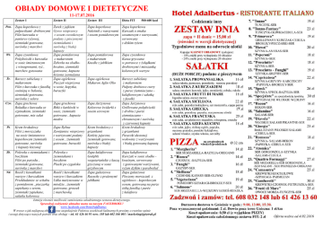 OBIADY DOMOWE I DIETETYCZNE 11-17.07.2016 Zestaw I Pon. Wt. Śr. Czw. Pt. Sb. Nd. Zestaw II Zupa koperkowa z pulpecikami drobiowymi Filet kurczaka w panierce ryŜowej, ziemniaki gotowane, surówka z marchwi śurek z jajkiem Gyros wieprzowy z sosem czosnkowym podany z pieczonymi ziemniakami i surówką z białej kapusty Zupa czosnkowa Zupa pomidorowa Polędwiczki z kurczaka z makaronem w sosie śmietanowym śeberka na słodkoz winogronami, ryŜ , kwaśno, ziemniaki marchew gotowana gotowane, kapusta kiszona zasmaŜana Barszcz zabielany z Zupa ogórkowa makaronem Pieczeń wieprzowa Filet z kurczaka z fasolką w sosie, kopytka, owiniętą w bekonie, buraczki ziemniaki gotowane, surówka z selera Zupa grochowa Zupa grochowa Roladka z kurczaka ze Bitki z karkówki w szpinakiem, ziemniaki sosie, ziemniaki gotowane, mix sałat gotowane , kapusta modra Krem brokułowy Filet z morszczuka na sosie śmietanowo koperkowym ziemniaki gotowane, surówka z kapusty kiszonej Polewka z ziemniakami i boczkiem Filet po parysku , ziemniaki gotowane, surówka z marchwi Rosół z kawałkami warzyw i kurczakiem Przekładaniec ze schabu z pomidorem , pieczarką zapiekany z serem, ziemniaki zapiekane, sałatka kolorowa Zupa Rybna Zawijaniec wieprzowy z warzywami podany z sosem , ziemniaki gotowane, buraczki Polewka z ziemniakami i boczkiem Placki po cygańsku Rosół z kawałkami warzyw i kurczakiem Udka marynowane w miodzie , ziemniaki gotowane, groszek z marchewką Zestaw III Dieta FIT Zupa koperkowa Naleśnik z warzywami i sosem pomidorowym Zupa koperkowa Kurczak o smaku sezamowym z warzywami, serwowany z dzikim ryŜem Zupa pomidorowa z makaronem Knedle z jabłkiem Zupa czosnkowa Kasza gryczana w potrawce z Ŝołądkami drobiowymi i mieszanką kolorowych warzyw Zupa ogórkowa Makaron Aglio Olio Barszcz zabielany z makaronem Pulpety drobiowe curry z puree ziemniaczano kalafiorowym i sałatką z fasolki Zupa Jarzynowa Grillowane polędwiczki z drobiu z purée ziemniaczano chrzanowym i surówką z czerwonej kapusty Krem brokułowy z grzankami Paseczki duszonej wołowiny z warzywami i białą gotowaną kapustą Zupa Jarzynowa Kolorowe świderki z sosem serowym Krem brokułowy z grzankami Kotlety jajeczne, ziemniaki gotowane, surówka z białej kapusty Zupa kalafiorowa Gołąbki wegetariańskie z kaszą gryczaną w sosie grzybowym Zupa gulaszowa Racuchy z praŜonymi jabłkami 500-600 kcal Zupa kalafiorowa Kurczak w sosie słodko kwaśnym, serwowany z gotowanymi warzywami, ryŜem dzikim i paraboiled Zupa gulaszowa Pieczony morszczuk z ogórkowo - koperkowym sosem, gotowaną na parze Ŝółtą fasolką i purée z kalafiora Istnieje równieŜ moŜliwość zamówienia całodziennego zestawu dietetycznego. Sprawdzaj codziennie aktualne menu na naszym FACEBOOKU! www.facebook.com/HotelAdalbertus W trosce o jak najlepszą obsługę oraz zaspokojenie Państwa oczekiwań kulinarnych prosimy o rzetelne opinie i uwagi dotyczące naszych potraw oraz obsługi – tel. 61 426 46 91 wew. 105 lub 602 366 001 / [email protected]