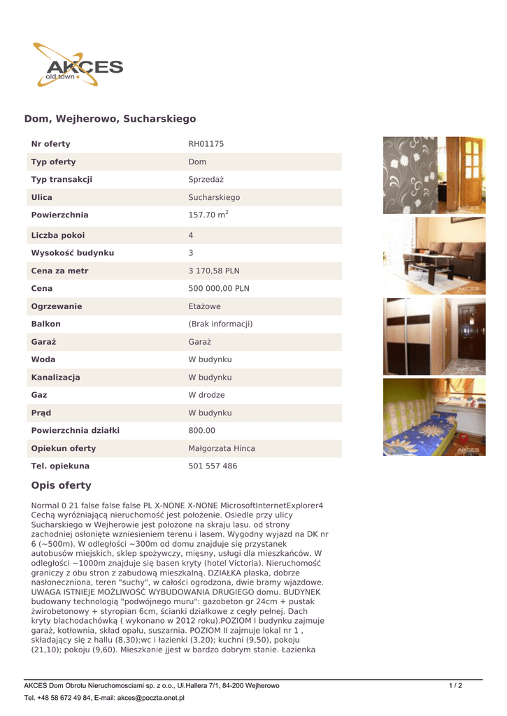Dom, Wejherowo, Sucharskiego Nr oferty RH01175 Typ oferty Dom Typ transakcji Sprzedaż Ulica Sucharskiego Powierzchnia 157.70 m2 Liczba pokoi 4 Wysokość budynku 3 Cena za metr 3 170,58 PLN Cena 500 000,00 PLN Ogrzewanie Etażowe Balkon (Brak informacji) Garaż Garaż Woda W budynku Kanalizacja W budynku Gaz W drodze Prąd W budynku Powierzchnia działki 800.00 Opiekun oferty Małgorzata Hinca Tel. opiekuna 501 557 486 Opis oferty Normal 0 21 false false false PL X-NONE X-NONE MicrosoftInternetExplorer4 Cechą wyróżniającą nieruchomość jest położenie. Osiedle przy ulicy Sucharskiego w Wejherowie jest położone na skraju lasu. od strony zachodniej osłonięte wzniesieniem terenu i lasem. Wygodny wyjazd na DK nr 6 (~500m). W odległości ~300m od domu znajduje się przystanek autobusów miejskich, sklep spożywczy, mięsny, usługi dla mieszkańców. W odległości ~1000m znajduje się basen kryty (hotel Victoria). Nieruchomość graniczy z obu stron z zabudową mieszkalną. DZIAŁKA płaska, dobrze nasłoneczniona, teren "suchy", w całości ogrodzona, dwie bramy wjazdowe. UWAGA ISTNIEJE MOŻLIWOŚĆ WYBUDOWANIA DRUGIEGO domu. BUDYNEK budowany technologią "podwójnego muru": gazobeton gr 24cm + pustak żwirobetonowy + styropian 6cm, ścianki działkowe z cegły pełnej. Dach kryty blachodachówką ( wykonano w 2012 roku).POZIOM I budynku zajmuje garaż, kotłownia, skład opału, suszarnia. POZIOM II zajmuje lokal nr 1 , składający się z hallu (8,30);wc i łazienki (3,20); kuchni (9,50), pokoju (21,10); pokoju (9,60). Mieszkanie jjest w bardzo dobrym stanie. Łazienka AKCES Dom Obrotu Nieruchomosciami sp. z o.o., Ul.Hallera 7/1, 84-200 Wejherowo Tel. +48 58 672 49 84, E-mail: [email protected] 1/2 wykończona glazurą. W pokojach panele, ściany gładzone, malowane. POZIOM III zajmuje mieszkanie nr 2 posiadające analogiczny układ pomieszczeń jak lokal nr 1. Mieszkanie to również jest w bardzo dobrym stanie. MIESZKANIA posiadają odrębne wejścia. Podsumowując, bardzo atrakcyjne położenie, układ dwóch mieszkań, dobry stan techniczny całości, umiarkowana cena to niewątpliwe atuty nieruchomości. ZAPRASZAMY AKCES Dom Obrotu Nieruchomosciami sp. z o.o., Ul.Hallera 7/1, 84-200 Wejherowo Tel. +48 58 672 49 84, E-mail: [email protected] 2/2
