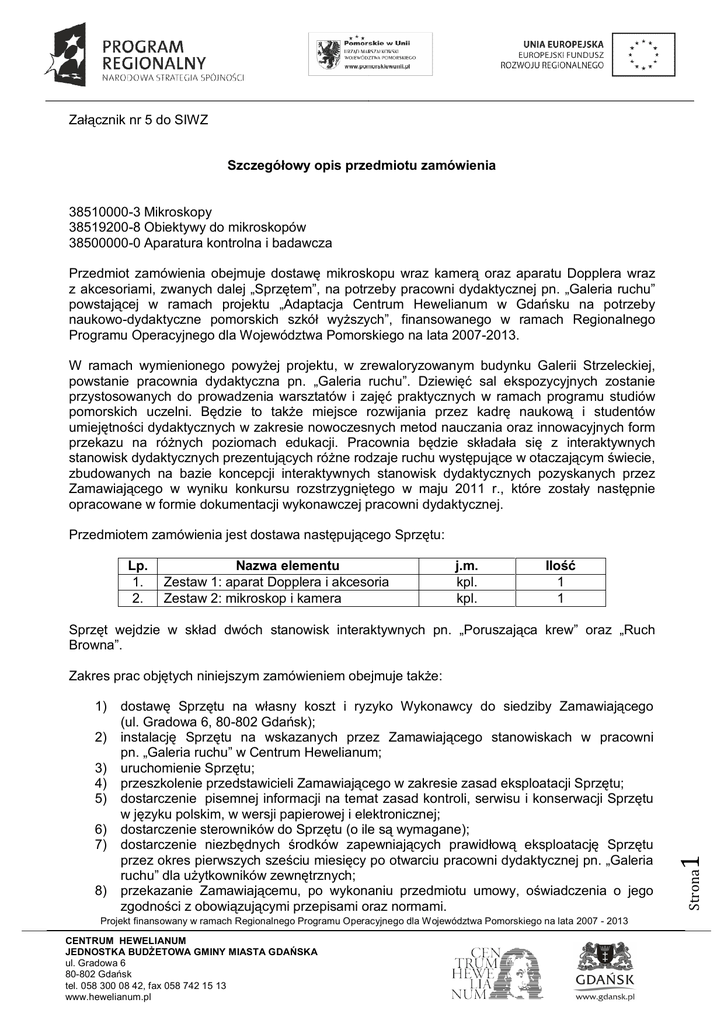 Załącznik nr 5 do SIWZ Szczegółowy opis przedmiotu zamówienia 38510000-3 Mikroskopy 38519200-8 Obiektywy do mikroskopów 38500000-0 Aparatura kontrolna i badawcza Przedmiot zamówienia obejmuje dostawę mikroskopu wraz kamerą oraz aparatu Dopplera wraz z akcesoriami, zwanych dalej „Sprzętem”, na potrzeby pracowni dydaktycznej pn. „Galeria ruchu” powstającej w ramach projektu „Adaptacja Centrum Hewelianum w Gdańsku na potrzeby naukowo-dydaktyczne pomorskich szkół wyższych”, finansowanego w ramach Regionalnego Programu Operacyjnego dla Województwa Pomorskiego na lata 2007-2013. W ramach wymienionego powyżej projektu, w zrewaloryzowanym budynku Galerii Strzeleckiej, powstanie pracownia dydaktyczna pn. „Galeria ruchu”. Dziewięć sal ekspozycyjnych zostanie przystosowanych do prowadzenia warsztatów i zajęć praktycznych w ramach programu studiów pomorskich uczelni. Będzie to także miejsce rozwijania przez kadrę naukową i studentów umiejętności dydaktycznych w zakresie nowoczesnych metod nauczania oraz innowacyjnych form przekazu na różnych poziomach edukacji. Pracownia będzie składała się z interaktywnych stanowisk dydaktycznych prezentujących różne rodzaje ruchu występujące w otaczającym świecie, zbudowanych na bazie koncepcji interaktywnych stanowisk dydaktycznych pozyskanych przez Zamawiającego w wyniku konkursu rozstrzygniętego w maju 2011 r., które zostały następnie opracowane w formie dokumentacji wykonawczej pracowni dydaktycznej. Przedmiotem zamówienia jest dostawa następującego Sprzętu: Lp. 1. 2. Nazwa elementu Zestaw 1: aparat Dopplera i akcesoria Zestaw 2: mikroskop i kamera j.m. kpl. kpl. Ilość 1 1 Sprzęt wejdzie w skład dwóch stanowisk interaktywnych pn. „Poruszająca krew” oraz „Ruch Browna”. 2) 3) 4) 5) 6) 7) 8) dostawę Sprzętu na własny koszt i ryzyko Wykonawcy do siedziby Zamawiającego (ul. Gradowa 6, 80-802 Gdańsk); instalację Sprzętu na wskazanych przez Zamawiającego stanowiskach w pracowni pn. „Galeria ruchu” w Centrum Hewelianum; uruchomienie Sprzętu; przeszkolenie przedstawicieli Zamawiającego w zakresie zasad eksploatacji Sprzętu; dostarczenie pisemnej informacji na temat zasad kontroli, serwisu i konserwacji Sprzętu w języku polskim, w wersji papierowej i elektronicznej; dostarczenie sterowników do Sprzętu (o ile są wymagane); dostarczenie niezbędnych środków zapewniających prawidłową eksploatację Sprzętu przez okres pierwszych sześciu miesięcy po otwarciu pracowni dydaktycznej pn. „Galeria ruchu” dla użytkowników zewnętrznych; przekazanie Zamawiającemu, po wykonaniu przedmiotu umowy, oświadczenia o jego zgodności z obowiązującymi przepisami oraz normami. Projekt finansowany w ramach Regionalnego Programu Operacyjnego dla Województwa Pomorskiego na lata 2007 - 2013 CENTRUM HEWELIANUM JEDNOSTKA BUDŻETOWA GMINY MIASTA GDAŃSKA ul. Gradowa 6 80-802 Gdańsk tel. 058 300 08 42, fax 058 742 15 13 www.hewelianum.pl Strona 1) 1 Zakres prac objętych niniejszym zamówieniem obejmuje także: Dostarczony Sprzęt musi być fabrycznie nowy. Wszelkie urządzenia zasilane napięciem 230V muszą spełniać wymogi dyrektyw „Nowego Podejścia” UE poprzez posiadanie oznaczenia CE. Sprzęt musi być kompatybilny z zasilaniem AC~230V (50-60Hz). Oferowany Sprzęt musi spełniać wszystkie normy stawiane takim towarom przez prawo polskie oraz posiadać odpowiednie pozwolenia dopuszczające do obrotu na terytorium Polski. Dostarczony Sprzęt powinien być wykonany tak, aby przebywanie koło niego lub w strefie z nim sąsiadującej nie narażało zwiedzających na jakiekolwiek niebezpieczeństwo. W celu potwierdzenia, iż oferowany Sprzęt odpowiada wymaganiom określonym przez Zamawiającego, Wykonawca zobowiązuje się złożyć odpowiednią dokumentację techniczną, czyli specyfikacje techniczne udostępnione przez producentów i dystrybutorów lub własne opisy i informacje sporządzone przez Wykonawcę na temat oferowanego Sprzętu z podaniem producenta, modelu, oznaczeń. Dokumentacja techniczna musi potwierdzić wszystkie wymagane cechy wyszczególnione w niniejszym opisie przedmiotu zamówienia. Wykonawca przekaże Zamawiającemu wszelkie dokumenty, niezbędne do prawidłowego korzystania ze Sprzętu, w szczególności instrukcje obsługi w języku polskim lub wraz z tłumaczeniem na język polski, opieczętowane karty gwarancyjne oraz niezbędne deklaracje zgodności. Wykonawca przeprowadzi szkolenie dla 5 osób spośród personelu Zamawiającego oraz innych użytkowników Sprzętu w zakresie jego obsługi i eksploatacji. W przypadku ewentualnego wskazania w opisie przedmiotu zamówienia nazw własnych, patentów pochodzenia lub parametrów technicznych wskazujących na produkt konkretnego producenta Zamawiający zgodnie z treścią art. 29 ust. 3 Ustawy Prawo zamówień publicznych, dopuszcza składanie ofert równoważnych. 1. Zestaw 1: Aparat Dopplera i akcesoria Aparat Dopplera będzie stanowił element stanowiska pn. „Poruszająca krew”, którego ideą jest wyjaśnienie efektu Dopplera. Celem doświadczenia wykonywanego na stanowisku jest badanie szybkości przepływu krwi w fantomie ręki. Doświadczenie polega na analizie zmian częstotliwości fali odbitej podczas przepływu cieczy fantomowej (sztuczna krew) przez model ręki człowieka za pomocą profesjonalnego dopplerowskiego analizatora prędkości przepływu krwi. Projekt finansowany w ramach Regionalnego Programu Operacyjnego dla Województwa Pomorskiego na lata 2007 - 2013 CENTRUM HEWELIANUM JEDNOSTKA BUDŻETOWA GMINY MIASTA GDAŃSKA ul. Gradowa 6 80-802 Gdańsk tel. 058 300 08 42, fax 058 742 15 13 www.hewelianum.pl Strona 1. Dwukierunkowy aparat Dopplera: wyświetlanie fal w czasie rzeczywistym, bezpośredni odczyt kierunku siły i prędkości przepływu i pulsu, zamrażanie fali i danych liczbowych, zasilanie: bateryjne lub za pomocą zasilacza, aparat wyposażony w sondę pozwalającą na 