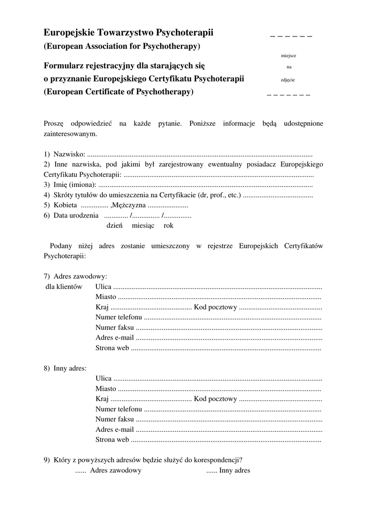 Europejskie Towarzystwo Psychoterapii _ _ _ _ _ _ (European Association for Psychotherapy) miejsce Formularz rejestracyjny dla starających się na o przyznanie Europejskiego Certyfikatu Psychoterapii zdjęcie (European Certificate of Psychotherapy) _ _ _ _ _ _ _ Proszę odpowiedzieć na każde pytanie. Poniższe informacje będą udostępnione zainteresowanym. 1) Nazwisko: .......................................................................................................................... 2) Inne nazwiska, pod jakimi był zarejestrowany ewentualny posiadacz Europejskiego Certyfikatu Psychoterapii: ....................................................................................................... 3) Imię (imiona): .................................................................................................................... 4) Skróty tytułów do umieszczenia na Certyfikacie (dr, prof., etc.) ...................................... 5) Kobieta ............... ,Mężczyzna ...................... 6) Data urodzenia ............. /............... /............... dzień miesiąc rok Podany niżej adres zostanie umieszczony w rejestrze Europejskich Certyfikatów Psychoterapii: 7) Adres zawodowy: dla klientów Ulica ................................................................................................................. Miasto .............................................................................................................. Kraj ............................................ Kod pocztowy ............................................. Numer telefonu ................................................................................................ Numer faksu ..................................................................................................... Adres email ..................................................................................................... Strona web ....................................................................................................... 8) Inny adres: Ulica ................................................................................................................. Miasto .............................................................................................................. Kraj ............................................ Kod pocztowy ............................................. Numer telefonu ................................................................................................ Numer faksu ..................................................................................................... Adres email ..................................................................................................... Strona web ....................................................................................................... 9) Który z powyższych adresów będzie służyć do korespondencji? ...... Adres zawodowy ...... Inny adres 10) Jeśli już uzyskał Pan/Pani Europejski Certyfikat Psychoterapii od akredytowanej organizacji szkoleniowej, proszę podać jej nazwę. .............................................................................................................................. 11) Proszę podać nazwę narodowej organizacji przyznającej (NAO) rekomendującej Pana/Panią do uzyskania Europejskiego Certyfikatu Psychoterapii. ....................................................................................................................................................... 12) W jakim kraju Pan/Pani obecnie praktykuje? ................................................................................. 13) Proszę podać nazwę organizacji NAO, w której jest Pan/Pani zarejestrowany i do której można składać zażalenia lub rozwiązywać kwestie dyscyplinarne związane z prowadzoną przez Pana/Panią praktyką. ....................................................................................................................................................... Jeśli jest to inna organizacja przyznająca niż ta podana w punkcie 11, proszę wyjaśnić dlaczego: ....................................................................................................................................................... ....................................................................................................................................................... ....................................................................................................................................................... 14). Proszę podać nazwę modalności terapeutycznej (jednej bądź kilku jeśli to Pana/Pani dotyczy) wyszczególnionych przy Pana/Pani nazwisku w rejestrze organizacji przyznającej: ....................................................................................................................................................... ....................................................................................................................................................... ....................................................................................................................................................... 15). Proszę podać nazwę organizacji (EWAO), w której jest Pan/Pani aktualnie zarejestrowany i do której można składać zażalenia lub rozwiązywać kwestie dyscyplinarne związane z prowadzoną przez Pana/Panią praktyką. ................................................................................................................................................... Jeśli jest to inna EWAO niż ta, podana w punkcie 14, proszę wyjaśnić dlaczego ....................................................................................................................................................... ....................................................................................................................................................... .