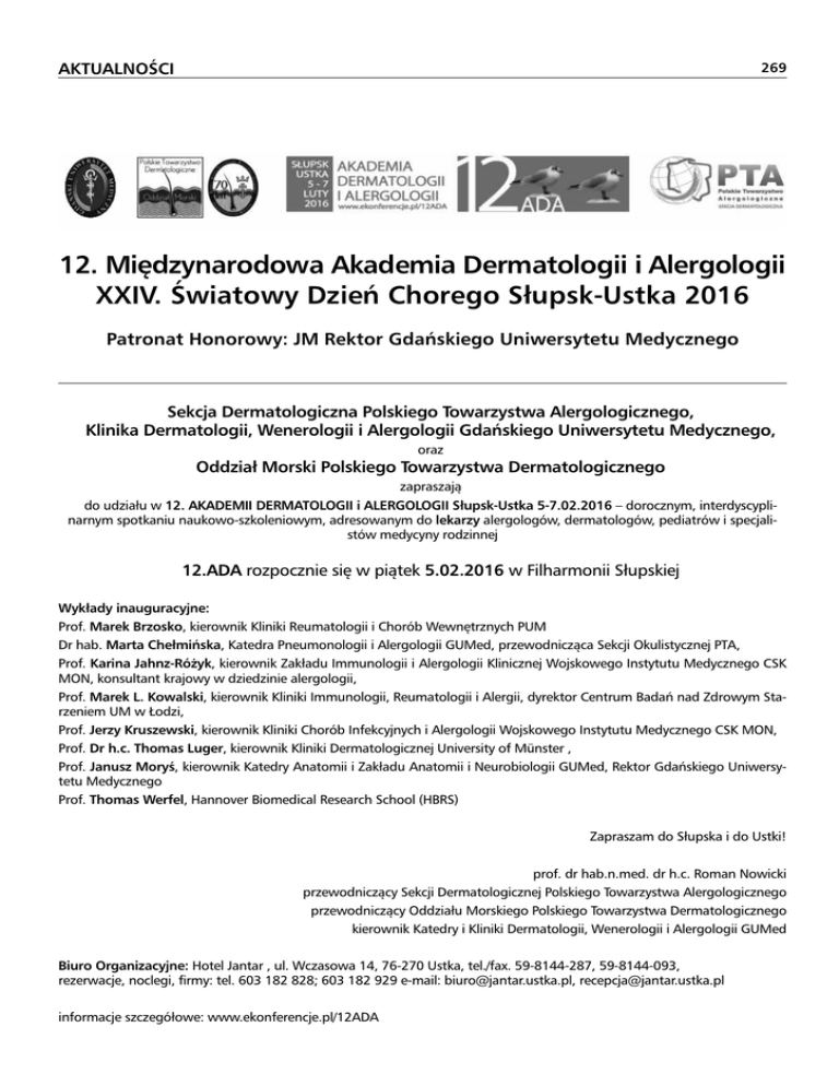 AKTUALNOŚCI 269 12. Międzynarodowa Akademia Dermatologii i Alergologii XXIV. Światowy Dzień Chorego Słupsk-Ustka 2016 Patronat Honorowy: JM Rektor Gdańskiego Uniwersytetu Medycznego Sekcja Dermatologiczna Polskiego Towarzystwa Alergologicznego, Klinika Dermatologii, Wenerologii i Alergologii Gdańskiego Uniwersytetu Medycznego, oraz Oddział Morski Polskiego Towarzystwa Dermatologicznego zapraszają do udziału w 12. AKADEMII DERMATOLOGII i ALERGOLOGII Słupsk-Ustka 5-7.02.2016 – dorocznym, interdyscyplinarnym spotkaniu naukowo-szkoleniowym, adresowanym do lekarzy alergologów, dermatologów, pediatrów i specjalistów medycyny rodzinnej 12.ADA rozpocznie się w piątek 5.02.2016 w Filharmonii Słupskiej Wykłady inauguracyjne: Prof. Marek Brzosko, kierownik Kliniki Reumatologii i Chorób Wewnętrznych PUM Dr hab. Marta Chełmińska, Katedra Pneumonologii i Alergologii GUMed, przewodnicząca Sekcji Okulistycznej PTA, Prof. Karina Jahnz-Różyk, kierownik Zakładu Immunologii i Alergologii Klinicznej Wojskowego Instytutu Medycznego CSK MON, konsultant krajowy w dziedzinie alergologii, Prof. Marek L. Kowalski, kierownik Kliniki Immunologii, Reumatologii i Alergii, dyrektor Centrum Badań nad Zdrowym Starzeniem UM w Łodzi, Prof. Jerzy Kruszewski, kierownik Kliniki Chorób Infekcyjnych i Alergologii Wojskowego Instytutu Medycznego CSK MON, Prof. Dr h.c. Thomas Luger, kierownik Kliniki Dermatologicznej University of Münster , Prof. Janusz Moryś, kierownik Katedry Anatomii i Zakładu Anatomii i Neurobiologii GUMed, Rektor Gdańskiego Uniwersytetu Medycznego Prof. Thomas Werfel, Hannover Biomedical Research School (HBRS) Zapraszam do Słupska i do Ustki! prof. dr hab.n.med. dr h.c. Roman Nowicki przewodniczący Sekcji Dermatologicznej Polskiego Towarzystwa Alergologicznego przewodniczący Oddziału Morskiego Polskiego Towarzystwa Dermatologicznego kierownik Katedry i Kliniki Dermatologii, Wenerologii i Alergologii GUMed Biuro Organizacyjne: Hotel Jantar , ul. Wczasowa 14, 76-270 Ustka, tel./fax. 59-8144-287, 59-8144-093, rezerwacje, noclegi, firmy: tel. 603 182 828; 603 182 929 e-mail: [email protected], [email protected] informacje szczegółowe: www.ekonferencje.pl/12ADA