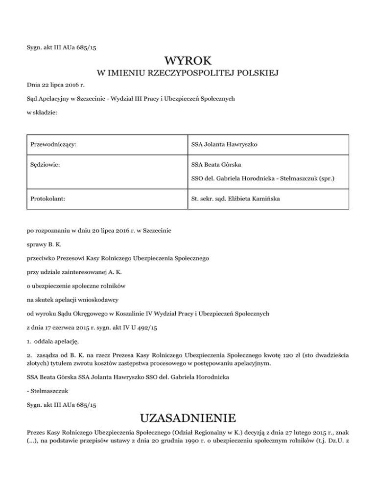 Sygn. akt III AUa 685/15 WYROK W IMIENIU RZECZYPOSPOLITEJ POLSKIEJ Dnia 22 lipca 2016 r. Sąd Apelacyjny w Szczecinie - Wydział III Pracy i Ubezpieczeń Społecznych w składzie: Przewodniczący: SSA Jolanta Hawryszko Sędziowie: SSA Beata Górska SSO del. Gabriela Horodnicka - Stelmaszczuk (spr.) Protokolant: St. sekr. sąd. Elżbieta Kamińska po rozpoznaniu w dniu 20 lipca 2016 r. w Szczecinie sprawy B. K. przeciwko Prezesowi Kasy Rolniczego Ubezpieczenia Społecznego przy udziale zainteresowanej A. K. o ubezpieczenie społeczne rolników na skutek apelacji wnioskodawcy od wyroku Sądu Okręgowego w Koszalinie IV Wydział Pracy i Ubezpieczeń Społecznych z dnia 17 czerwca 2015 r. sygn. akt IV U 492/15 1. oddala apelację, 2. zasądza od B. K. na rzecz Prezesa Kasy Rolniczego Ubezpieczenia Społecznego kwotę 120 zł (sto dwadzieścia złotych) tytułem zwrotu kosztów zastępstwa procesowego w postępowaniu apelacyjnym. SSA Beata Górska SSA Jolanta Hawryszko SSO del. Gabriela Horodnicka - Stelmaszczuk Sygn. akt III AUa 685/15 UZASADNIENIE Prezes Kasy Rolniczego Ubezpieczenia Społecznego (Odział Regionalny w K.) decyzją z dnia 27 lutego 2015 r., znak (...), na podstawie przepisów ustawy z dnia 20 grudnia 1990 r. o ubezpieczeniu społecznym rolników (t.j. Dz.U. z 2013r., poz. 1403 z późn. zm.), ustawy z dnia 13 października 1998 r. o systemie ubezpieczeń społecznych (t.j. Dz.U. z 2013 r., poz. 1403 z późn.zm.) oraz art. 151 § 1 pkt 2 k.p.a.: - uchylił decyzję stwierdzającą podleganie ubezpieczeniu społecznemu rolników z dnia 10 czerwca 2005 r., znak: (...) (...), - uchylił decyzję stwierdzającą ustanie ubezpieczeniu społecznemu rolników z dnia 10 sierpnia 2005 r., znak: (...) (...), - uchylił decyzję stwierdzającą podleganie ubezpieczeniu społecznemu rolników z dnia 22 stycznia 2008 r., znak: (...) (...), - uchylił decyzję stwierdzającą ustanie ubezpieczeniu społecznemu rolników z dnia 12 lutego 2009 r., znak: (...) (...), - uchylił decyzję stwierdzającą podleganie ubezpieczeniu społecznemu rolników z dnia 21 czerwca 2012 r., znak: (...) (...). W uzasadnieniu wskazano, że w toku postępowania sądowego przed Sądem Okręgowym w Koszalinie w sprawie o sygn. IV U 969/14 małżeństwo B. i A. K. zgodnie oświadczyli, że pomimo posiadania gruntów rolnych (odziedziczonych), faktycznie od 2004 r. działalności gospodarczej nie prowadzą a posiadane grunty rolne mają służyć w przyszłości ich dzieciom. Zgodnie zaś z przepisami prawa, ubezpieczeniu społecznemu rolników podlega osoba, która gospodarstwo rolne efektywnie prowadzi a nie jedynie posiada do niego prawo własności. Wobec powyższego organ rentowy stwierdził, że A. K. podlegała ubezpieczeniu społecznemu rolników jedynie w okresie od 20 maja 1997 r. do 30 czerwca 2002 r. Od powyższej decyzji ubezpieczony B. K. złożył odwołanie, w którym domagał się ustalenia, że A. K., jako małżonka (domownik) rolnika po dniu 30 czerwca 2002 r. podlegała ubezpieczeniu społecznemu rolników. Ubezpieczony podtrzymał, że co prawda od zakończenia sezonu rolniczego w 2004 r. nie prowadzi działalności rolniczej, jakkolwiek wywiązuje z obowiązku opłacania składek na to ubezpieczenie, stąd winien on i jego małżonka podlegać temu ubezpieczeniu. W odpowiedzi, Prezes Kasy Rolniczego Ubezpieczenia Społecznego (Oddział Regionalny w K.) wniósł o oddalenie odwołania w całości. Organ rentowy podniósł, że sam fakt opłacania składki ubezpieczeniowej nie ma znaczenia dla sprawy, gdyż ubezpieczeniu społecznemu rolników podlega wyłącznie rolnik, który efektywnie prowadzi działalność rolniczą. Wyrokiem z dnia 17 czerwca 2015 r. Sąd Okręgowy w Koszalinie IV Wydział Pracy i Ubezpieczeń Społecznych oddalił odwołanie i zasądził od ubezpieczonego B. K. na rzecz organu rentowego kwotę 120,00 zł tytułem zwrotu kosztów zastępstwa procesowego. Sąd Okręgowy oparł swoje rozstrzygnięcie na następujących ustaleniach faktycznych i rozważaniach prawnych: Ubezpieczony B. K. (ur. (...)) w dniu 15 listopada 2002 r. wraz z małżonką kupili nieruchomość rolną w miejscowości N. (gmina M.) o powierzchni 2,32 hektarów fizycznych. Ponadto, w wyniku dziedziczenia, w 2006 r., posiadał on udział do 3/16 części w gruntach o pow. 6,87 ha fizycznych oraz udział 3/32 części w gruntach o pow. 1,34 ha fizycznych. W wyniku podziału spadku, B. K., otrzymał nieruchomość zabudowaną domem wolnostojącym, zaś niezabudowane działki rolne otrzymało pozostałe rodzeństwo. Z tego tytułu B. K. i jego małżonka (jako domownik rolnika) podlegali ubezpieczeniu społecznemu rolników z mocy ustawy, z wyłączeniem okresów, za jaki przysługiwał im inny tytuł ubezpieczenia. W dniu 28 grudnia 2004 r. ubezpieczony B. K. uległ wypadkowi komunikacyjnemu, w wyniku którego był długotrwale leczony i rehabilitowany, m.in. okresowo poruszał się z użyciem wózka inwalidzkiego. Z tego tytułu od 2006 r. otrzymuje on świadczenie rentowe z ubezpieczenia społecznego rolników. Po 2004 r. A. K. przede wszystkim zajmowała się wychowaniem dwójki dzieci (ur. 1995 r. i 1999 r.) oraz prowadzeniem domu, w tym przydomowego ogródka. Okresowo podejmowała ona pracę zarobkową. Od 2004 r. A. i B. K. nie prowadzą działalności rolniczej. Jedynie zamieszkują w domu na terenie byłego gospodarstwa rodziców ubezpieczonego i prowadzą przydomowy ogródek. Utrzymują się ze świadczeń rentowych B. K. oraz wyprzedaży majątku (nieużywanych maszyn rolniczych). Wobec sprzecznych oświadczeń ubezpieczonego i jego małżonki co do faktu prowadzenia działalności rolniczej, organ rentowy wszczął postępowanie wyjaśniające. W konsekwencji, Prezes Kasy Rolniczego Ubezpieczenia Społecznego (Odział Regionalny w K.) w dniu 17 lipca 2014 r. wydał decyzję, na mocy której ponownie ustalił ubezpieczonemu prawo do renty bezterminowo, jednakże wypłatę świadczenia obniżył
