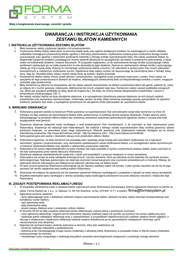 Blaty z konglomeratu kwarcowego, ceramiki i granitu GWARANCJA I INSTRUKCJA UŻYTKOWANIA ZESTAWU BLATÓW KAMIENNYCH I. INSTRUKCJA UŻYTKOWANIA ZESTAWU BLATÓW 1. 2. 3. 4. 5. Blaty kamienne należy użytkować zgodnie z ich przeznaczeniem. Czyszczenia blatów należy dokonywać za pomocą ciepłej wody oraz ogólnie dostępnych środków nie zawierających w swoim składzie materiałów ścierających powierzchnię blatów zgodnie z instrukcją zastosowania i użytkowania wydaną przez producenta danego środka czyszczącego oraz zgodnie z zaleceniami producenta materiału z którego zostały wyprodukowane blaty. Nie należy wystawiać blatów na długotrwałe narażenie środkami posiadającymi mocne składniki alkaliczne (w szczególności dla blatów o powierzchni polerowanej), a także nawet na krótkotrwałe działanie kwasów fluorowych. W przypadku wątpliwości, co do zastosowania danego środka czyszczącego należy spróbować zastosować go na małej powierzchni w celu sprawdzenia jego działania. Zawsze po zastosowaniu takiego środka czyszczącego należy go zmyć czystą wodą. Dotyczy to normalnego użytkowania blatów w kuchni i ich zabrudzeń w postaci plam oraz innych zabrudzeń powszechnych w codziennym użytkowaniu kuchni. Zaplamione blaty należy czyścić nie dopuszczając do zaschnięcia plam z herbaty, kawy, wina, oleju itp. Wszelkie plamy należy czyścić wtedy kiedy są świeże i dopiero powstałe. Powierzchnie blatów należy chronić przed obiciem i porysowaniem, szczególnie przez przedmioty wykonane z metalu. Kroić należy na specjalnie do tego przeznaczonych deskach do krojenia, oddzielających powierzchnię blatu od bezpośredniego kontaktu z nożem, mogącym uszkodzić jego powierzchnię. Blaty kamienne są odporne na temperaturę, ale nie należy stawiać bezpośrednio na blatach przedmiotów takich jak garnki, patelnie itp. zaraz po zdjęciu ich z kuchni gazowej, indukcyjnej, elektrycznej lub innych urządzeń tego typu. Koniecznie należy używać podkładek izolujących (np. takich jak specjalne podkładki na blaty, deski do krojenia itp.). Na blaty nie można stawiać bezpośrednio przedmiotów i naczyń o temperaturze przekraczającej 120° C. Nie należy narażać blatów na duże obciążenia statyczne, a w szczególności dynamiczne poprzez kładzenie na nich dużych ciężkich przedmiotów oraz wywieranie mechanicznego i zmiennego nacisku na blaty (blaty kamienne posiadają wysoką wytrzymałość na zginanie i ściskanie, jednakże zbyt duże, a szczególnie dynamiczne ich obciążanie może doprowadzić do uszkodzenia blatów. II. WARUNKI GWARANCJI 1. Wykonawca gwarant udziela na terytorium Polski gwarancji na wyprodukowane i/lub zamontowane swoje blaty kamienne na okres 24 miesięcy od daty wydania lub zamontowania blatów (data uwidoczniona na ostatniej stronie wydanej Gwarancji). Podpis złożony przez Zamawiającego na protokole odbioru blatów bez wniesienia zastrzeżeń potwierdza jednoznacznie zgodność towaru z umową oraz brak występowania wad jawnych. 2. Gwarancja obejmuje wyłącznie wady wynikające z wad produkcyjnych i/lub montażowych, o ile czynności te były wykonywane przez Wykonawcę. Gwarancja nie obejmuje wad materiałowych. Na materiał z którego zostały wyprodukowane blaty osobnej gwarancji udziela producent materiału, na warunkach przez niego zastrzeżonych. Warunki gwarancji oraz użytkowania materiału dostępne są na stronie internetowej producenta: http://www.technistone.com/pl/ , http://pl.silestone.com/ , http://www.thesize.es/neolith/pl/ Karta gwarancyjna jest ważna z dowodem zakupu oraz protokołem odbioru blatów. 3. 4. 5. 6. 7. 8. Wykonawca zapewnia, że blaty kamienne nie posiadają wad i spełniają swoją funkcję pod warunkiem użytkowania ich w typowych warunkach, zgodnie z przeznaczeniem, przy zachowaniu podstawowych zasad użytkowania blatów, a w szczególności zasad wymienionych w Instrukcji Użytkowania Blatów oraz zgodnie z zaleceniami producenta materiału. Wykonawca nie ponosi odpowiedzialności za wady montażu lub wady powstałe w wyniku uruchomienia zestawu blatów, jeżeli czynności te nie były wykonywane przez serwis fabryczny Wykonawcy. Gwarancja obejmuje odpowiedzialność wyłącznie z tytułu wad powstałych z przyczyn tkwiących w rzeczy sprzedanej. Wykonawca nie uznaje za wady odstępstw kolorystycznych i rysunku kamienia, które są naturalną cechą materiału lub wynikiem procesu technologicznego. Naprawa gwarancyjna nie obejmuje czynności konserwacyjnych oraz czynności przewidzianych w Instrukcji Obsługi, do wykonania których zobowiązany jest Nabywca we własnym zakresie oraz na własny koszt. W razie uznania gwarancji Wykonawca zobowiązuje się do naprawy wadliwej części lub wyrobu, a jeśli wyrobu naprawić się nie da do jego wymiany lub zwrotu zapłaconej ceny według wyboru Wykonawcy. 9. Gwarancja nie wyłącza nie ogranicza ani nie zawiesza uprawnień Nabywcy wynikających z przepisów o rękojmi za wady rzeczy sprzedanej. 10. Wszelkie ewentualne spory wynikające z umowy sprzedaży będą rozstrzygane polubownie lub przez właściwy rzeczowo i miejscowo Sąd Wykonawcy. III. ZASADY POSTĘPOWANIA REKLAMACYJNEGO 1. 2. 3. 4. W przypadku stwierdzenia wady w zestawie blatów wykonanych przez Wykonawcę Zamawiający dokona zgłoszenia reklamacji na piśmie na adres: Forma System sp. z o.o., ul. Stalowa 14, 58-100 Świdnica, na fax: 074 640 13 71, e-mailem: [email protected] Zgłoszenie powinno zawierać: - dane zgłaszającego wraz z dokładnym adresem miejsca zamontowania blatów, adresem na który należy kierować korespondencję oraz kontaktowy numer telefonu - opis ujawnionej wady - datę stwierdzenia wady - dowód zakupu (faktura) wraz z protokołem odbioru blatów W terminie 30 dni od daty przyjęcia reklamacji serwis reklamacyjny wykona jedną z poniższych czynności: - uzna zgłoszoną reklamację i uzgodni termin dokonania naprawy wadliwej części lu