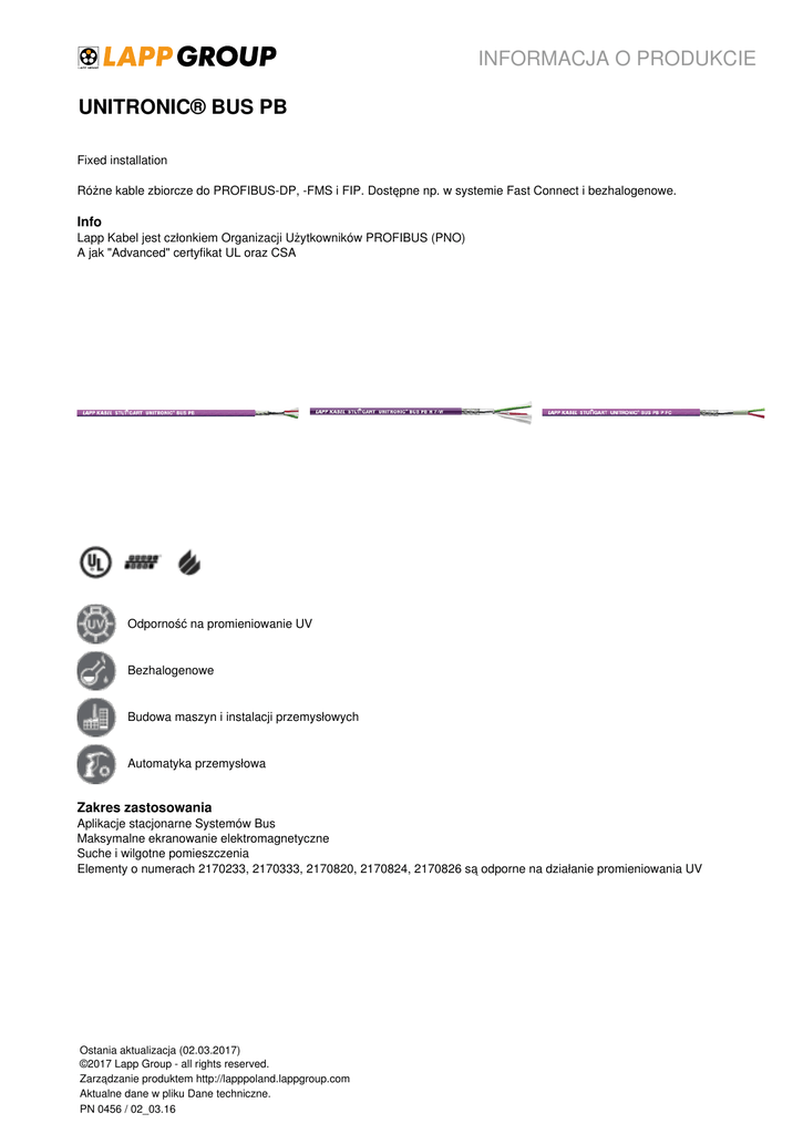 INFORMACJA O PRODUKCIE UNITRONIC® BUS PB Fixed installation Różne kable zbiorcze do PROFIBUS-DP, -FMS i FIP. Dostępne np. w systemie Fast Connect i bezhalogenowe. Info Lapp Kabel jest członkiem Organizacji Użytkowników PROFIBUS (PNO) A jak "Advanced" certyfikat UL oraz CSA Odporność na promieniowanie UV Bezhalogenowe Budowa maszyn i instalacji przemysłowych Automatyka przemysłowa Zakres zastosowania Aplikacje stacjonarne Systemów Bus Maksymalne ekranowanie elektromagnetyczne Suche i wilgotne pomieszczenia Elementy o numerach 2170233, 2170333, 2170820, 2170824, 2170826 są odporne na działanie promieniowania UV Ostania aktualizacja (02.03.2017) ©2017 Lapp Group - all rights reserved. Zarządzanie produktem http://lapppoland.lappgroup.com Aktualne dane w pliku Dane techniczne. PN 0456 / 02_03.16 INFORMACJA O PRODUKCIE UNITRONIC® BUS PB Cechy produktu Te przewody bus mogą być używane w standardzie PROFIBUS-DP oraz równie dobrze w PROFIBUS-FMS i FIP W oparciu o wyszczególnioną szybkość transmisji, zgodnie ze specyfikacjami PNO, mają zastosowanie następujące maksymalne długości przewodów w odniesieniu do segmentu magistrali (przewód typu A, PROFIBUS-DP): 93,75 kbit/s = 1200 m 187,5 kbit/s = 1000 m 500 kbit/s = 400 m 1,5 Mbit/s = 200 m 12,0 Mbit/s = 100 m Normy i aprobaty Zgodnie z DIN 19245 i EN 50170, np. do SIEMENS SIMATIC NET, również pasuje do FIP (Factory Instrumentation Protocol) Typy z certyfikatem UL - patrz poniżej Budowa produktu Wykonanie w standardzie Fast Connect (FC) P: poliuretan H: bezhalogenowy PE: polietylen, czarny płaszcz zewnętrzny np. do przemysłu spożywczego i produkcji napojów 7-W: 7-drutowy, np. w przypadku występowania wibracji COMBI: Transmisja danych i zasilanie w jednym przewodzie Dane techniczne Klasyfikacja: ETIM 5.0 Class-ID: EC000830 Opis klasy ETIM 5.0: Przewody do transmisji danych Pojemność robocza: (800 Hz): maks. 30 nF/km Szczytowe napięcie robocze: (nie do zastosowań silnoprądowych) 250 V Rezystancja żyły: (pętla): maks. 186 Om/km Patrz dane techniczne Minimalny promień gięcia: Połączenia nieruchome: patrz specyfikacja techniczna Napięcie próbne: Żyła/żyła: 1500 V rms Impedancja falowa: 150 ± 15 Om Wskazówka Wszystkie podane wartości dotyczące produktów są wartościami nominalnymi (o ile nie wskazano inaczej). Inne wartości, takie jak np. tolerancje mogą być przedstawione na zamówienie (jeżeli są dostępne i przeznaczone do publikacji). Standardowe odcinki proszę sprawdzić na: www.lapppolska.pl Rodzaj opakowania: krążek ≤ 30 kg lub ≤ 250 m, w przeciwnym razie bęben Prosimy określić wielkość opakowania (np. 1 x 500 m bęben lub 5 x 100 m krążek) SIMATIC NET® jest zastrzeżoną marką Siemens AG LAPPKABEL jest członkiem organizacji użytkowników PROFIBUS (PNO) Fotografie nie mogą być używane do wymiarowania oraz nie stanowią szczegółowego odwzorowania przedstawionych produktów. * Podane ceny to ceny netto bez podatku VAT i dodatkowych opłat. Sprzedaż klientom biznesowym. Ostania aktualizacja (02.03.2017) ©2017 Lapp Group - all rights reserved. Zarządzanie produktem http://lapppoland.lappgroup.com Aktualne dane w pliku Dane techniczne. PN 0456 / 02_03.16 Powered by TCPDF (www.tcpdf.org) Oznaczenie wyrobu Liczba par i średnica żyły [mm] Średnica zewnętrzna [mm] Indeks miedzi [kg/km] Waga [kg/km] Dla połączeń nieruchomych - konwencjonalny montaż przewodów 2170220 UNITRONIC® BUS PB 1 x 2 x 0,64 8 30,1 74 2170233 UNITRONIC® PB PE 1 x 2 x 0,64 8 30,1 57 2170226 UNITRONIC® BUS PB H 7-W 1 x 2 x 0,64 8 30,1 55 2170225 UNITRONIC® BUS PB COMBI 7-W 1 x 2 x 0,64 Ø + 3 x 1,0 mm² 9,8 59 92 1 x 2 x 0,64 8 30,1 57 1 x 2 x 0,64 8 30,1 55 1 x 2 x 0,64 8 26 67 UNITRONIC® BUS PB P FC 1 x 2 x 0,64 8 26 71 Dla połączeń nieruchomych - certyfikaty UL/CSA CMX 2170219 UNITRONIC® BUS PB A Dla połączeń nieruchomych - certyfikaty UL/CSA CMG 2170824 UNITRONIC® BUS PB 7-W A UNITRONIC® BUS PB Ostania aktualizacja (02.03.2017) ©2017 Lapp Group - all rights reserved. Zarządzanie produktem http://lapppoland.lappgroup.com Aktualne dane w pliku Dane techniczne. PN 0456 / 02_03.16 Numer katalogowy Dla połączeń nieruchomych - montaż przewodów Fast Connect 2170333 UNITRONIC® BUS PB PE FC Dla połączeń nieruchomych - certyfikaty UL/CSA CMX 2170330 Dla połączeń nieruchomych - montaż przewodu Fast Connect - certyfikaty UL/CSA CMG UNITRONIC® BUS PB FC 1 x 2 x 0,64 8 26 84 2170826 UNITRONIC® BUS PB 7-W FC 1 x 2 x 0,64 8 26 67 2170326 UNITRONIC® BUS PB-H FC 1 x 2 x 0,64 8 26 72 INFORMACJA O PRODUKCIE 2170820 Powered by TCPDF (www.tcpdf.org) INFORMACJA O PRODUKCIE UNITRONIC® BUS PB Ostania aktualizacja (02.03.2017) ©2017 Lapp Group - all rights reserved. Zarządzanie produktem http://lapppoland.lappgroup.com Aktualne dane w pliku Dane techniczne. PN 0456 / 02_03.16