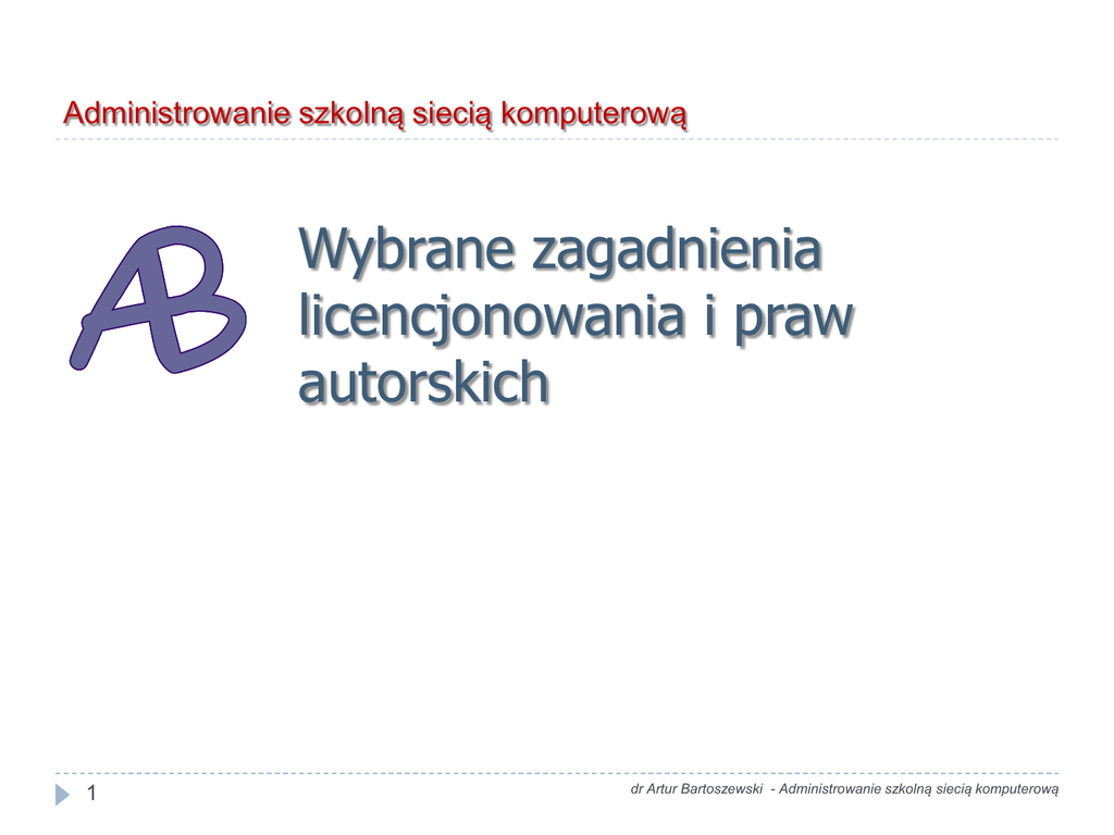 Administrowanie szkolną siecią komputerową Wybrane zagadnienia licencjonowania i praw autorskich 1 dr Artur Bartoszewski - Administrowanie szkolną siecią komputerową I. Licencjonowanie Licencja Licencja na oprogramowanie to umowa na korzystanie z utworu jakim jest aplikacja komputerowa, zawierana pomiędzy podmiotem, któremu przysługują majątkowe prawa autorskie do utworu, a osobą, która zamierza z danej aplikacji korzystać. Umowa taka powinna określać przede wszystkim warunki na jakich licencjobiorca jest uprawniony do korzystania z programu. Ustawa o prawie autorskim i prawach pokrewnych wskazuje tu: • zakres, • miejsce i czas korzystania z utworu, Strony umowy mogą dowolnie kształtować charakter licencji (biorąc jednak pod uwagę treść przepisów ustawowych, których strony nie mogą modyfikować). Źródło: www.pl.wikipedia.org 2 dr Artur Bartoszewski - Administrowanie szkolną siecią komputerową I. Licencjonowanie Domena publiczna Domena publiczna (ang.: public domain) – ogół twórczości (m.in. tekstów, zdjęć, muzyki, dzieł sztuki, oprogramowania itp.), do której wygasły prawa autorskie i która jest przez to dostępna dla wszystkich i do dowolnych zastosowań lub która od samego początku jej powstania nie była objęta tymi prawami (np. teksty ustaw). Domena publiczna to zbiór wiedzy i twórczości stanowiący wspólny dorobek kulturowy i intelektualny ludzkości. Źródło: www.pl.wikipedia.org 3 dr Artur Bartoszewski - Administrowanie szkolną siecią komputerową I. Licencjonowanie Rodzaje licencji Abandonware - oprogramowanie, którego twórca już nie sprzedaje i nie zapewnia dla niego obsługi. Spotyka się również użycie tego określenia w stosunku do oprogramowania, którego twórca świadomie zaprzestał rozwoju i wsparcia produktu. Ponieważ wiele z tych programów, a szczególnie gier, nadal jest chętnie używanych, powstały w Internecie miejsca pozwalające je uzyskać. W stosunku do prawa większości państw jest to nielegalne, ponieważ żaden program komputerowy nie jest tak stary, żeby wygasły jego prawa autorskie. Jednak ponieważ część firm już nie istnieje, a innym nie zależy na ochronie praw do tych konkretnych programów, to administratorzy takich serwerów mogą się spodziewać, że nie będą ścigani. Źródło: www.pl.wikipedia.org 4 dr Artur Bartoszewski - Administrowanie szkolną siecią komputerową I. Licencjonowanie Licencja Źródło: http://jakilinux.org/gnu/rodzaje-licencji-oprogramowania/ 5 dr Artur Bartoszewski - Administrowanie szkolną siecią komputerową I. Licencjonowanie FLOSS FLOSS - Wolne oprogramowanie; Otwarte oprogramowanie: wolność uruchamiania programu w dowolnym celu (wolność 0) wolność analizowania, jak program działa i dostosowywania go do swoich potrzeb (wolność 1) wolność rozpowszechniania niezmodyfikowanej kopii programu (wolność 2) wolność udoskonalania programu i publicznego rozpowszechniania własnych ulepszeń, dzięki czemu może z nich skorzystać cała społeczność (wolność 3). Jeżeli program nie gwarantuje użytkownikowi chociaż jednej z powyższych wolności, wówczas, według FSF, nie może być uznany za Wolne Oprogramowanie. Źródło: www.pl.wikipedia.org 6 dr Artur Bartoszewski - Administrowanie szkolną siecią komputerową I. Licencjonowanie Idea wolnego oprogramowania Free Software Foundation (Fundacja Wolnego Oprogramowania) – najważniejsza instytucja sponsorująca Projekt GNU, założona w 1985 roku przez Richarda Stallmana. Misją FSF jest tworzenie, ochrona i promocja wolności użytkowania, kopiowania, modyfikowania i rozprowadzania programów komputerowych oraz obronę praw użytkowników Wolnego Oprogramowania. FSF wspiera wolność wypowiedzi, publikacji i zrzeszania się w Internecie, prawo do używania oprogramowania do szyfrowania prywatnej korespondencji i połączeń sieciowych oraz prawo do tworzenia oprogramowania, nienaruszalne przez prywatne monopole. Źródło: www.pl.wikipedia.org 7 dr Artur Bartoszewski - Administrowanie szkolną siecią komputerową I. Licencjonowanie Rodzaje licencji Powszechna Licencja Publiczna GNU (GNU General Public License) - jedna z licencji wolnego oprogramowania, która została sformułowana w 1983 przez Richarda Stallmana i Ebena Moglena na potrzeby Projektu GNU, na podstawie wcześniejszej Emacs General Public License. GPL jest obecnie najpopularniejszą licencją wolnodostępnego oprogramowania. 8 dr Artur Bartoszewski - Administrowanie szkolną siecią komputerową I. Licencjonowanie EULA Pojęcie „EULA” (ang. End-User License Agreement – licencja użytkownika końcowego) oznacza standardowy typ licencji, na której jest dystrybuowane oprogramowanie własnościowe. Termin ten dotyczy zarówno licencji dla użytkowników indywidualnych, jak i korporacyjnych. Licencje oprogramowania komercyjnego różnią się między sobą, ale można między nimi zauważyć pewne cechy wspólne. Każda licencja typu EULA zastrzega wszelkie prawa dla producenta oprogramowania. Użytkownik otrzymuje tylko ściśle określony, wąski zakres uprawnień. Źródło: http://jakilinux.org/gnu/rodzaje-licencji-oprogramowania/ 9 dr Artur Bartoszewski - Administrowanie szkolną siecią komputerową I. Licencjonowanie Rodzaje licencji Źródło: http://jakilinux.org/gnu/rodzaje-licencji-oprogramowania/ 10 dr Artur Bartoszewski - Administrowanie szkolną siecią komputerową I. Licencjonowanie Rodzaje licencji shareware, freeware, adware, trial Pojęcia te są blisko ze sobą związane, często się przenikają. 11 dr Artur Bartoszewski - Administrowanie szkolną siecią komputerową I. Licencjonowanie Rodzaje licencji Adware - jest oprogramowaniem rozpowszechnianym za darmo, ale zawiera funkcję wyświetlającą reklamy, zwykle w postaci bannerów. Wydawca oprogramowania zarabia właśnie na tych reklamach. Zwykle jest też możliwość nabycia wersji programu bez reklam za opłatą. Dobrym przykładem je