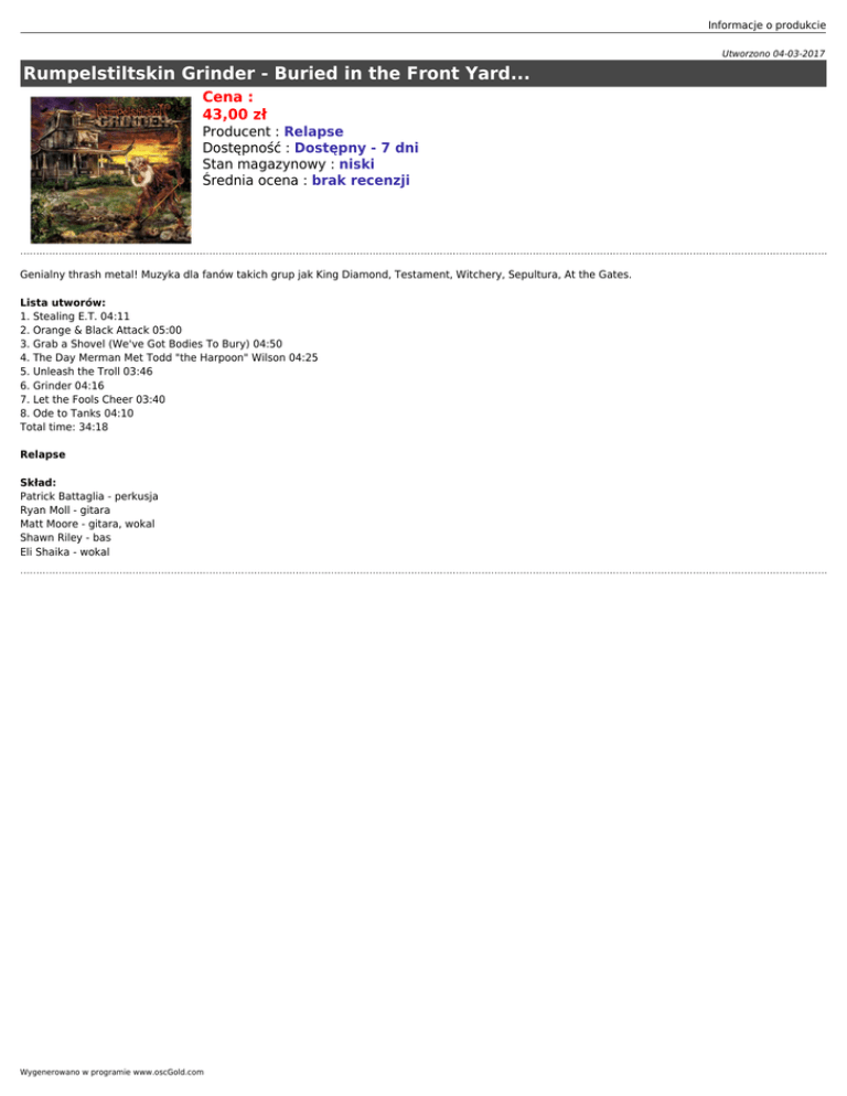 Informacje o produkcie Utworzono 04-03-2017 Rumpelstiltskin Grinder - Buried in the Front Yard... Cena : 43,00 zł Producent : Relapse Dostępność : Dostępny - 7 dni Stan magazynowy : niski Średnia ocena : brak recenzji Genialny thrash metal! Muzyka dla fanów takich grup jak King Diamond, Testament, Witchery, Sepultura, At the Gates. Lista utworów: 1. Stealing E.T. 04:11 2. Orange & Black Attack 05:00 3. Grab a Shovel (We've Got Bodies To Bury) 04:50 4. The Day Merman Met Todd "the Harpoon" Wilson 04:25 5. Unleash the Troll 03:46 6. Grinder 04:16 7. Let the Fools Cheer 03:40 8. Ode to Tanks 04:10 Total time: 34:18 Relapse Skład: Patrick Battaglia - perkusja Ryan Moll - gitara Matt Moore - gitara, wokal Shawn Riley - bas Eli Shaika - wokal Wygenerowano w programie www.oscGold.com