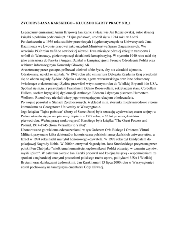 ŻYCIORYS JANA KARSKIEGO – KLUCZ DO KARTY PRACY NR_1 Legendarny emisariusz Armii Krajowej Jan Karski (właściwie Jan Kozielewski), autor słynnej książki o polskim podziemiu pt. "Tajne państwo", urodził się w 1914 roku w Łodzi. Po ukończeniu w 1936 roku studiów prawniczych i dyplomatycznych na Uniwersytecie Jana Kazimierza we Lwowie pracował jako urzędnik Ministerstwa Spraw Zagranicznych. We wrześniu 1939 roku trafił do sowieckiej niewoli. Dwa miesiące później zbiegł z transportu i wrócił do Warszawy, gdzie rozpoczął działalność konspiracyjną. W styczniu 1940 roku udał się jako emisariusz do Paryża i Angers. Działał w konspiracyjnym Froncie Odrodzenia Polski oraz w biurze informacyjnym Komendy Głównej AK. Aresztowany przez gestapo, próbował odebrać sobie życie, aby nie zdradzić tajemnic. Odratowany, uciekł ze szpitala. W 1942 roku jako emisariusz Delegata Rządu na Kraj przedostał się do obozu zagłady Żydów. Zdjęcia z obozu, z getta warszawskiego oraz inne dokumenty świadczące o eksterminacji Żydów przewiózł w tym samym roku do Wielkiej Brytanii i do USA. Spotkał się m.in. z prezydentem Franklinem Delano Rooseveltem, sekretarzem stanu Cordellem Hullem, szefem brytyjskiej dyplomacji Anthonym Edenem i słynnym pisarzem Herbertem Wellsem. Rozmówcy nie dali wiary jego wstrząsającym relacjom o holocauście. Po wojnie pozostał w Stanach Zjednoczonych. Wykładał m.in. stosunki międzynarodowe i teorię komunizmu na Georgetown University w Waszyngtonie. Jego książka "Tajne państwo" (Story of Secret State) była sensacją wydawniczą czasu wojny; w Polsce ukazała się po raz pierwszy dopiero w 1999 roku, w 55 lat po amerykańskim pierwodruku. Ważną pracą naukową prof. Karskiego była książka "The Great Powers and Poland, 1914-1945 (from Versailles to Yalta)". Uhonorowano go wieloma odznaczeniami, w tym Orderem Orła Białego i Orderem Virtuti Militari, przyznano kilka doktoratów honoris causa polskich i amerykańskich uniwersytetów, a Izrael w 1994 roku nadał mu tytuł honorowego obywatela. W 1998 roku był kandydatem do pokojowej Nagrody Nobla. W 2000 r. otrzymał Nagrodę im. Jana Strzeleckiego przyznaną przez polski Pen Club jako "wielkiemu humaniście, orędownikowi Polski otwartej, w uznaniu czynów, myśli i pism". W ostatnim okresie Jan Karski pracował nad kolejną książką - wspomnieniami ze spotkań z najbardziej znanymi postaciami polskiego ruchu oporu, politykami USA i Wielkiej Brytanii oraz działaczami żydowskimi. Jan Karski zmarł 13 lipca 2000 roku w Waszyngtonie i został pochowany na tamtejszym cmentarzu Góry Oliwnej.