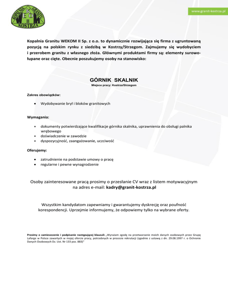 Kopalnia Granitu WEKOM II Sp. z o.o. to dynamicznie rozwijająca się firma z ugruntowaną pozycją na polskim rynku z siedzibą w Kostrzy/Strzegom. Zajmujemy się wydobyciem i przerobem granitu z własnego złoża. Głównymi produktami firmy są: elementy surowołupane oraz cięte. Obecnie poszukujemy osoby na stanowisko: GÓRNIK SKALNIK Miejsce pracy: Kostrza/Strzegom Zakres obowiązków: Wydobywanie brył i bloków granitowych Wymagania: dokumenty potwierdzające kwalifikacje górnika skalnika, uprawnienia do obsługi palnika wrębowego doświadczenie w zawodzie dyspozycyjność, zaangażowanie, uczciwość Oferujemy: zatrudnienie na podstawie umowy o pracę regularne i pewne wynagrodzenie Osoby zainteresowane pracą prosimy o przesłanie CV wraz z listem motywacyjnym na adres e-mail: [email protected] Wszystkim kandydatom zapewniamy i gwarantujemy dyskrecję oraz poufność korespondencji. Uprzejmie informujemy, że odpowiemy tylko na wybrane oferty. Prosimy o zamieszczenie i podpisanie następującej klauzuli: „Wyrażam zgodę na przetwarzanie moich danych osobowych przez Grupę Lafarge w Polsce zawartych w mojej ofercie pracy, potrzebnych w procesie rekrutacji (zgodnie z ustawą z dn. 29.08.1997 r. o Ochronie Danych Osobowych Dz. Ust. Nr 133 poz. 883)"