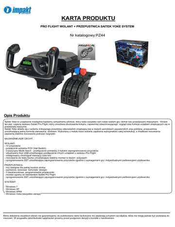 KARTA PRODUKTU PRO FLIGHT WOLANT + PRZEPUSTNICA SAITEK YOKE SYSTEM Nr katalogowy:PZ44 Opis Produktu Saitek Yoke to urządzenie niezbędne każdemu wirtualnemu pilotowi, który nade wszystko ceni sobie realizm gry i klimat lotu prawdziwymi maszynami. Wolant ten jest częścią zestawu Saitek Pro Flight, który umożliwia zbudowanie kokpitu, najwierniej odwzorowującego wygląd oraz funkcje urządzeń znajdujących się w prawdziwej maszynie. Saitek Yoke składa się z wolantu imitującego prawdziwy odpowiednik znajdujący się w dużych samolotach pasażerskich oraz potrójną przepustnicę umożliwiającą pełną kontrolę sterowania silnikiem. Wykonany z metalu trzon wolantu zapewnia wytrzymałość całej konstrukcji, a imadłowe mocowania zapewnią stabilne mocowanie podczas rozgrywki. NAJWAŻNIEJSZE CECHY: WOLANT: - 14 przycisków - przełącznik widoków POV (Hat Switch) - 3-pozycyjny Mode Swich - przełączanie pomiędzy 3 trybami zaprogramowania przycisków - wbudowany Hub USB umożliwiający podłączenie innych urządzeń z zestawu Pro Flight - zintegrowany chronograf mierzący czas lotu - mocowanie do blatu biurka umożliwiające stabilny montaż w dwóch pozycjach - oprogramowanie SST umożliwiające zaprogramowanie przycisków zgodnie z wymaganiami gry i indywidualnymi preferencjami użytkownika PRZEPUSTNICA: - trzy dźwignie dla pełnej kontroli silnika - wymienne, kolorowe końcówki dźwigni - 3 dwukierunkowe, programowalne przełączniki - montaż zgodny ze standardem Saitek Pro Flight - oprogramowanie SST umożliwiające zaprogramowanie przycisków zgodnie z wymaganiami gry i indywidualnymi preferencjami użytkownika SYSTEMY: - Windows 7 - Windows XP - Windows XP64 - Windows Vista (wszystkie wersje) Mimo dołożenia wszelkich starań nie gwarantujemy, że publikowane dane techniczne nie zawierają uchybień lub błędów, które nie mogą jednak być podstawą do roszczeń. W przypadku jakichkolwiek wątpliwości prosimy przed podjęciem decyzji o kontakt z handlowcem. Cechy produktu Obsługiwane systemy operacyjne Win. XP; Win. Vista; Win. Vista 64bit; Win. 7; Win. 7 64bit Złącze USB 2.0 Komunikacja Przewodowa Liczba przycisków 14,00 Platforma PC Wyświetlacz LCD Nie Dane logistyczne EAN 021165106994 Szerokość sztuki [cm] 47,80 Wysokość sztuki [cm] 39,70 Długość sztuki [cm] 22,00 Waga sztuki [kg] 4.27000 EAN kartonu 10021165106991 Ilość w kartonie [szt] 2.000 Szerokość kartonu [cm] 45,70 Wysokość kartonu [cm] 43,00 Długość kartonu [cm] 49,50 Waga kartonu [kg] 9.38800 Mimo dołożenia wszelkich starań nie gwarantujemy, że publikowane dane techniczne nie zawierają uchybień lub błędów, które nie mogą jednak być podstawą do roszczeń. W przypadku jakichkolwiek wątpliwości prosimy przed podjęciem decyzji o kontakt z handlowcem.
