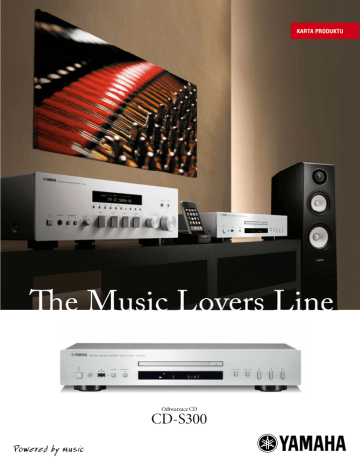 KARTA PRODUKTU Odtwarzacz CD CD-S300 Odtwarzacz CD CD-S300 KARTA PRODUKTU Odtwarzacz oferujący wysoką jakość brzmienia, łatwość obsługi oraz zaawansowane funkcje takie jak tryb Pure Direct, Intelligent Digital Servo, kompatybilność z iPodem, odtwarzanie plików MP3 i WMA oraz wbudowane złącze USB. Wysoka jakość dźwięku Zaawansowane funkcje • Tryb Pure Pure • Niezwykle zaawansowana technologia układów i obwodów elektrycznych • Krótka ścieżka sygnału • Wysokiej jakości części • Wysokiej jakości przetworniki C/A dla wysokiej jakości konwersji i niskich szumów • “Pływający” mechanizm lasera • Intelligent Digital Servo • Kompatybilność z plikami MP3 i WMA • Port USB znajdujący się na panelu przednim pozwala na podłączenie iPoda lub innego urządzenia • Kompatybilność z iPodem • Odtwarzanie płyt CD-R / RW • Szereg wygodnych funkcji odtwarzania Pasmo przenoszenia Zniekształcenia harmoniczne + szum CD CD 2 Hz–20 kHz 0.003% Stosunek sygnału do szumu Zakres dynamiki CD CD 105 dB 96 dB Poziom wyjścia Wymiary CD (1 kHz, O dB ) (S x W x G) 2 ± 0.3 V 435 x 86 x 260 mm Waga 3.5 kg Dostępny również w wykończeniu czarnym Odtwarzacz CD KARTA PRODUKTU CD-S300 WYSOKA JAKOŚĆ DŹWIĘKU Zaprojektowany aby odtworzyć najwyższej jakości dźwięk. Stosując szereg rozwiązań wykorzystanych uprzednio w komponentach serii S2000/S1000, ten odtwarzacz CD oferuje brzmienie, które usatysfakcjonuje nawet najbardziej wymagających miłośników muzyki. Poza wysokiej jakości odtwarzaczem CD, oferuje również możliwość odtwarzania plików muzycznych zapisanych na iPodach, czy przenośnych pamięciach USB, poprzez bezpośrednie podłączenie tych urządzeń do gniazda USB na panelu przednim. Tryb Pure Direct CD-S300 posiada funkcję Pure Direct – tę samą, która wykorzystywana jest w amplitunerach oraz wzmacniaczach Yamaha. Aktywowanie funkcji za pomocą pilota lub przycisku znajdującego się na panelu głównym, wyłącza cyfrowe wyjście audio oraz wyświetlacz. W efekcie, uzyskujemy najniższe możliwe zakłócenia, a co za tym idzie najwyższą jakość brzmienia analogowego wyjścia audio. Niezwykle zaawansowana technologia układów i obwodów elektrycznych Technicy z firmy Yamaha poświęcili wiele czasu i wysiłku, aby zaprojektować ogólny wewnętrzny układ części oraz obwodów elektrycznych, które znacząco wpływają na jakość dźwięku. W rezultacie zasilanie, wyświetlacz i sekcja USB, a także cyfrowe i analogowe sekcje, są odizolowane, eliminując przy tym zakłócenia elektromagnetyczne zachodzące między nimi. Aby osiągnąć idealny balans wpływający na stabilną pracę urządzenia, mechanizm napędowy znajduje się w centrum urządzenia. Krótka ścieżka sygnału Wewnętrzny układ części i obwodów elektrycznych odtwarzacza CD-S300, jest bardzo logiczny i symetryczny. Ścieżki sygnałowe rozmieszczone zostały w taki sposób, aby były tak krótkie jak to tylko możliwe, natomiast ścieżki sygnału pomiędzy sekcjami są proste i krótkie (nie łatwe do osiągnięcia), aby zminimalizować ryzyko utraty sygnału lub interferencji. Doskonale dopasowane, wysokiej jakości częsci Ciesz się maksymalnej jakości muzyką z iPoda Każdy z elementów w odtwarzaczu CD-S300, wpływa na wysoką jakość dźwięku. Dlaczego firma Yamaha poświęciła wiele czasu i wysiłku na wybór oraz dopasowanie odpowiednich części i materiałów. Rezultatem są wysokiej jakości kondensatory, wzmacniacze operacyjne o jeszcze bardziej obniżonym poziomie szumów, szerokim paśmie przenoszonych częstotliwości oraz dużym zakresie wzmocnienia. Także zastosowanie materiałów tłumiących pod transformatorem i w okolicach kabla sygnałowego, tworzy wyrafinowaną wewnętrznie konstrukcję odtwarzacza CD która jest na poziomie, zarezerwowanym zazwyczaj na modele znacznie droższe. Przy użyciu kabla USB, możesz podłączyć swojego iPoda do odtwarzacza CD-S300. Dzięki temu możesz cieszyć się muzyką zapisaną w Twoim przenośnym systemie muzycznym. Ponieważ połączenie jest cyfrowe, sygnał muzyczny z iPoda w pełni wykorzystuje wysokiej jakości obwody audio odtwarzacza CD. W efekcie, usłyszysz muzykę w najlepszej możliwej jakości. Możesz używać komend pilota zdalnego sterowania do uruchamiania odtwarzania, wstrzymywania, wyboru ścieżki, regulacji głośności oraz zmiany ścieżki. Kompatybilne iPody to iPod classic (również 120GB classic), iPod nano (2, 3 i 4 generacja) oraz iPod touch (1 oraz 2 generacji). Gdy włączone jest zasilanie i wybrany został tryb USB, iPod ładuje się automatycznie. System przetworników C/A wysokiej jakości Wysokiej jakości system konwersji C/A, który w pełni wykorzystuje zalety technologii cyfrowej opracowanej przez firmę Yamaha, gwarantuje doskonałą precyzję przetwarzania, niski stosunek sygnału do szumu oraz duży zakres dynamiki. Intelligent Digital Servo Tradycyjne układy serwo nie radzą sobie całkowicie z błędami spowodowanymi przez wadliwe płyty CD, zarysowania, kurz i tym podobne. Inteligentny system użyty w niniejszym urządzeniu wykorzystuje układy DSP (Digital Signal Processor), w celu monitorowania sygnału, dostrojenia pracy lasera oraz dostosowania prędkości napędu, w celu eliminacji potencjalnych problemów. ZAAWANSOWANE FUNKCJE Ciesz się muzyką z plików MP3 oraz WMA Gniazdo USB na panelu przednim pozwala cieszyć się wysokiej jakości dźwiękiem, pochodzącym z plików MP3 oraz WMA, zapisanych na odtwarzaczach USB oraz przenośnych pamięciach, jak również na kartach pamięci umieszczonych w czytnikach kart USB. A dodatkowo masz możliwość odtwarzania utworów nagranych na płytach CD-R oraz CD-RW. 3 tryby wyświetlania CD Text CD Text pozwala na wyświetlenie informacji tekstowych na temat aktualnie odtwarzanej płyty CD na wyświetlaczu odtwarzacza. Wyświetlone informacje obejmują tytuł płyty, nazwę artysty oraz tyt