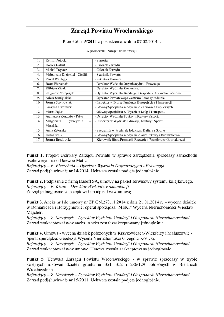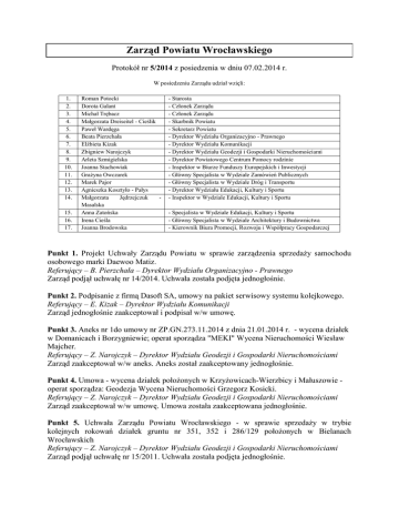 Zarząd Powiatu Wrocławskiego Protokół nr 5/2014 z posiedzenia w dniu 07.02.2014 r. W posiedzeniu Zarządu udział wzięli: 1. 2. 3. 4. 5. 6. 7. 8. 9. 10. 11. 12. 13. 14. 15. 16. 17. Roman Potocki Dorota Galant Michał Trębacz Małgorzata Dreiseitel - Cieślik Paweł Wardęga Beata Pierzchała Elżbieta Kizak Zbigniew Narojczyk Arleta Szmigielska Joanna Stachowiak Grażyna Owczarek Marek Pajor Agnieszka Kosztyło - Pałys Małgorzata Jędrzejczuk Masalska Anna Zatońska Irena Cieśla Joanna Brodowska - Starosta - Członek Zarządu - Członek Zarządu - Skarbnik Powiatu - Sekretarz Powiatu - Dyrektor Wydziału Organizacyjno - Prawnego - Dyrektor Wydziału Komunikacji - Dyrektor Wydziału Geodezji i Gospodarki Nieruchomościami - Dyrektor Powiatowego Centrum Pomocy rodzinie - Inspektor w Biurze Funduszy Europejskich i Inwestycji - Główny Specjalista w Wydziale Zamówień Publicznych - Główny Specjalista w Wydziale Dróg i Transportu - Dyrektor Wydziału Edukacji, Kultury i Sportu - Inspektor w Wydziale Edukacji, Kultury i Sportu - Specjalista w Wydziale Edukacji, Kultury i Sportu - Główny Specjalista w Wydziale Architektury i Budownictwa - Kierownik Biura Promocji, Rozwoju i Współpracy Gospodarczej Punkt 1. Projekt Uchwały Zarządu Powiatu w sprawie zarządzenia sprzedaży samochodu osobowego marki Daewoo Matiz. Referujący – B. Pierzchała – Dyrektor Wydziału Organizacyjno - Prawnego Zarząd podjął uchwałę nr 14/2014. Uchwała została podjęta jednogłośnie. Punkt 2. Podpisanie z firmą Dasoft SA, umowy na pakiet serwisowy systemu kolejkowego. Referujący – E. Kizak – Dyrektor Wydziału Komunikacji Zarząd jednogłośnie zaakceptował i podpisał w/w umowę. Punkt 3. Aneks nr 1do umowy nr ZP.GN.273.11.2014 z dnia 21.01.2014 r. - wycena działek w Domanicach i Borzygniewie; operat sporządza "MEKI" Wycena Nieruchomości Wiesław Majcher. Referujący – Z. Narojczyk – Dyrektor Wydziału Geodezji i Gospodarki Nieruchomościami Zarząd zaakceptował w/w aneks. Aneks został zaakceptowany jednogłośnie. Punkt 4. Umowa - wycena działek położonych w Krzyżowicach-Wierzbicy i Małuszowie operat sporządza: Geodezja Wycena Nieruchomości Grzegorz Kosicki. Referujący – Z. Narojczyk – Dyrektor Wydziału Geodezji i Gospodarki Nieruchomościami Zarząd zaakceptował w/w umowę. Umowa została zaakceptowana jednogłośnie. Punkt 5. Uchwała Zarządu Powiatu Wrocławskiego - w sprawie sprzedaży w trybie kolejnych rokowań działek gruntu nr 351, 352 i 286/129 położonych w Bielanach Wrocławskich Referujący – Z. Narojczyk – Dyrektor Wydziału Geodezji i Gospodarki Nieruchomościami Zarząd podjął uchwałę nr 15/2011. Uchwała została podjęta jednogłośnie. Punkt 6. Umowa - aktualizacja operatu szacunkowego (operat z dnia 14.02.2013 r.) do celów sprzedaży dla działki nr 71 obręb Sobótka - usługę wykona rzeczoznawca majątkowy Narcyz Malinowski. Referujący – Z. Narojczyk – Dyrektor Wydziału Geodezji i Gospodarki Nieruchomościami Zarząd zaakceptował w/w umowę. Umowa została zaakceptowana jednogłośnie. Punkt 7. Porozumienie zawierane pomiędzy Powiatem Wrocławskim a Miastem Wrocław w sprawie ponoszenia wydatków na utrzymanie dziecka umieszczonego w rodzinie zastępczej (dotyczy: K.W., ur. 14.07.1996 r.). Referujący – A. Szmigielska – Dyrektor Powiatowego Centrum Pomocy Rodzinie Zarząd zaakceptował w/w porozumienie. Porozumienie zostało zaakceptowane jednogłośnie. Punkt 8. Porozumienie zawierane pomiędzy Miastem Wrocław a Powiatem Wrocławskim w sprawie ponoszenia wydatków na utrzymanie dziecka przebywającego w rodzinie zastępczej (dotyczy: J.S., ur. 08.07.2006 r.). Referujący – A. Szmigielska – Dyrektor Powiatowego Centrum Pomocy Rodzinie Zarząd zaakceptował w/w porozumienie. Porozumienie zostało zaakceptowane jednogłośnie. Punkt 9. Porozumienie zawierane pomiędzy Powiatem Trzebnickim w Powiatem Wrocławskim w sprawie ponoszenia wydatków na opiekę i wychowanie dziecka przebywającego w rodzinie zastępczej (dotyczy: A.S., ur. 24.02.2000 r.). Referujący – A. Szmigielska – Dyrektor Powiatowego Centrum Pomocy Rodzinie Zarząd zaakceptował w/w porozumienie. Porozumienie zostało zaakceptowane jednogłośnie. Punkt 10. Wystąpienie realizatora programu o przyznanie środków PFRON na realizację pilotażowego programu „Aktywny samorząd” w 2014 roku. Referujący – A. Szmigielska – Dyrektor Powiatowego Centrum Pomocy Rodzinie Zarząd jednogłośnie zaakceptował w/w wystąpienie realizatora programu o przyznanie środków PFRON na realizację pilotażowego programu „Aktywny samorząd” w 2014 roku. Punkt 11. Projekt uchwały Zarządu Powiatu Wrocławskiego w sprawie udzielenia upoważnienia do składania oświadczeń woli dotyczących Pilotażowego programu „Aktywny samorząd”. Referujący – A. Szmigielska – Dyrektor Powiatowego Centrum Pomocy Rodzinie Zarząd podjął uchwałę nr 16/2014. Uchwała została podjęta jednogłośnie. Punkt 12. Projekt uchwały Zarządu Powiatu Wrocławskiego w sprawie udzielenia upoważnienia do składania oświadczeń woli dotyczących przyznawania dofinansowań ze środków Państwowego Funduszu Rehabilitacji Osób Niepełnosprawnych. Referujący – A. Szmigielska – Dyrektor Powiatowego Centrum Pomocy Rodzinie Zarząd podjął uchwałę nr 17/2014. Uchwała została podjęta jednogłośnie. Punkt 13. Zatwierdzenie sprawozdania do Prezesa Urzędu Zamówień Publicznych za rok 2013 o udzielonych zamówieniach publicznych. Referujący – G. Owczarek – Główny. Specjalista w Wydziale Zamówień Publicznych Zarząd jednogłośnie zatwierdził w/w sprawozdanie. Punkt 14. Aktualizacja wniosku o dofinansowanie projektu pn.: „Nasz rozwój naszą szansą” realizowanego w ramach Programu Operacyjnego Kapitał Ludzki na lata 2007-2013, Priorytet IX Rozwój wykształcenia i kompetencji w regionach, Działanie 9.5 Oddolne inicjatywy edukacyjne na obszarac