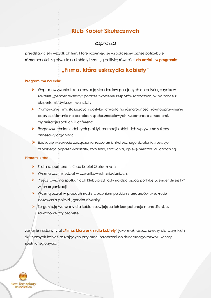 Klub Kobiet Skutecznych zaprasza przedstawicielki wszystkich firm, które rozumieją że współczesny biznes potrzebuje różnorodności, są otwarte na kobiety i szanują politykę równości, do udziału w programie: „Firma, która uskrzydla kobiety” Program ma na celu: Wypracowywanie i popularyzację standardów pasujących do polskiego rynku w zakresie „gender diversity” poprzez tworzenie zespołów roboczych, współpracę z ekspertami, dyskusje i warsztaty Promowanie firm, stosujących politykę otwartą na różnorodność i równouprawnienie poprzez działania na portalach społecznościowych, współpracę z mediami, organizację spotkań i konferencji Rozpowszechnianie dobrych praktyk promocji kobiet i ich wpływu na sukces biznesowy organizacji Edukację w zakresie zarządzania zespołami, skutecznego działania, rozwoju osobistego poprzez warsztaty, szkolenia, spotkania, opiekę mentorską i coaching. Firmom, które: Zostaną partnerem Klubu Kobiet Skutecznych Wezmą czynny udział w czwartkowych śniadaniach, Przedstawią na spotkaniach Klubu przykłady na działającą politykę „gender diversity” w ich organizacji Wezmą udział w pracach nad stworzeniem polskich standardów w zakresie stosowania polityki „gender diversity”, Zorganizują warsztaty dla kobiet rozwijające ich kompetencje menadżerskie, zawodowe czy osobiste, zostanie nadany tytuł „Firma, która uskrzydla kobiety” jako znak rozpoznawczy dla wszystkich skutecznych kobiet, szukających przyjaznej przestrzeni do skutecznego rozwoju kariery i spełnionego życia. Program „Firma, która uskrzydla kobiety” Firmom , które przystąpią do programu Klub Kobiet Skutecznych oferuje: Możliwość zapraszania swoich partnerów biznesowych na spotkania klubowe i pełną obsługę logistyczną zaproszeń wraz z follow up’em telefonicznym, Umieszczenie loga firmy we wszystkich publikacjach i wydarzeniach organizowanych i związanych z Klubem Rolę gospodarza jednego śniadania, w czasie którego firma ma możliwość przedstawienia siebie i swojej polityki „gender diversity” Promocję firmy na stronie FB „Klub Kobiet Skutecznych” poprzez publikację co najmniej 3 postów tygodniowo na temat polityki wobec kobiet w firmie, Możliwość komunikacji elektronicznej z członkami Klubu, poprzez udostępnianie miejsca w elektronicznym biuletynie „Bardziej skutecznie” 8 bezpłatnych biletów na śniadanie, Specjalne ceny na szkolenia i warsztaty organizowane przez Klub Kobiet Skutecznych Rabaty i specjalną ofertę od firm współpracujących z Klubem, na usługi dla kobiet np. (ośrodki fizjoterapii, rozwoju czy sklepy internetowe), Koszt udziału firmy w programie „Firma, która uskrzydla kobiety” – 7 000 zł netto miesięcznie.