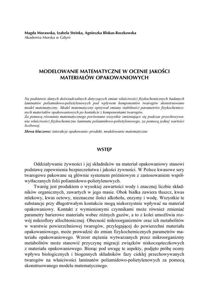 Magda Morawska, Izabela Steinka, Agnieszka Blokus-Roszkowska Akademia Morska w Gdyni MODELOWANIE MATEMATYCZNE W OCENIE JAKOŚCI MATERIAŁÓW OPAKOWANIOWYCH Na podstawie danych doświadczalnych dotyczących zmian właściwości fizykochemicznych badanych laminatów poliamidowo-polietylenowych pod wpływem komponentów twarogów skonstruowano model matematyczny. Model matematyczny opisywał zmiany stabilności parametrów fizykochemicznych materiałów opakowaniowych po kontakcie z komponentami twarogów. Za pomocą równania matematycznego porównano wszystkie zmieniające się podczas przechowywania właściwości fizykochemiczne laminatu poliamidowo-polietylenowego, za pomocą jednej wartości liczbowej. Słowa kluczowe: interakcje opakowanie–produkt, modelowanie matematyczne WSTĘP Oddziaływanie żywności i jej składników na materiał opakowaniowy stanowi podstawę zapewnienia bezpieczeństwa i jakości żywności. W Polsce kwasowe sery twarogowe pakowane są głównie systemem próżniowym z zastosowaniem współwytłaczanych folii poliamidowo-polietylenowych. Twaróg jest produktem o wysokiej zawartości wody i znacznej liczbie składników organicznych, zawartych w jego masie. Obok białka zawiera tłuszcz, kwas mlekowy, kwas octowy, nieznaczne ilości alkoholu, enzymy i wodę. Wszystkie te substancje przy długotrwałym kontakcie mogą niekorzystnie wpływać na materiał opakowaniowy. Kontakt z wymienionymi czynnikami może również zmieniać parametry barierowe materiału wobec różnych gazów, a to z kolei umożliwia rozwój mikroflory allochtonicznej. Obecność mikroorganizmów oraz ich metabolitów w warstwie powierzchniowej twarogów, przylegającej do powierzchni materiału opakowaniowego, może prowadzić do zmian fizykochemicznych parametrów materiału opakowaniowego. Wzrost stężenia wytwarzanych przez mikroorganizmy metabolitów może stanowić przyczynę migracji związków niskocząsteczkowych z materiału opakowaniowego. Biorąc pod uwagę te aspekty, podjęto próbę oceny wpływu biologicznych i biogennych składników fazy ciekłej przechowywanych twarogów na właściwości laminatów poliamidowo-polietylenowych za pomocą skonstruowanego modelu matematycznego. 6 ZESZYTY NAUKOWE AKADEMII MORSKIEJ W GDYNI, nr 80, listopad 2013 MATERIAŁ I METODY Badaniom poddano laminaty poliamidowo-polietylenowe (PA/PE) powszechnie stosowane do pakowania próżniowego kwasowych serów twarogowych, produkowane przez Klöckner Pentaplast. Folie PA/PE o grubości 70 µm i gramaturze 0,681 g/dm2 charakteryzowały się przepuszczalnością pary wodnej rzędu 2 g/(m2·24 h) [23oC, 75% RH1], przepuszczalnością tlenu 70 cm3/(m2·24 h) [23°C, 50% RH] oraz przepuszczalnością dwutlenku węgla 213 cm3/(m2·24 h) [23°C, 50% RH]. Grubość warstwy poliamidowej wynosiła 15 µm, zaś polietylenowej 55 µm. Obie warstwy zostały połączone za pomocą żywicy adhezyjnej, o nazwie handlowej Bynel®. Opakowania, w postaci torebek, wypełniano płynami imitującymi składniki twarogów: • wodnym roztworem kwasu mlekowego, o wartości pH odpowiadającej pH twarogu, czyli 4,7; • serwatką kwasową po produkcji twarogu, otrzymaną ze Spółdzielni Mleczarskiej Maćkowy w Gdańsku; • skrzepem, otrzymanym poprzez ukwaszenie 2-procentowego mleka pasteryzowanego przy użyciu zakwasu zawierającego liofilizat bakterii kwasu mlekowego (Lactococcus lactis spp. cremoris, L. lactis spp. lactis, L. lactis spp. lactis var. diacetylactis, Leuconostoc mesenteroides spp. cremoris). W torebkach wykonanych z PA/PE wewnętrzną warstwę stykającą się z komponentami twarogów stanowiła folia PE. Torebki wykonane z badanych folii, wypełnione roztworem kwasu mlekowego, skrzepem twarogowym i serwatką, zamykano za pomocą zgrzewarki do opakowań firmy Severin (FolienSchneidgerät). Maksymalny czas przechowywania w warunkach chłodniczych wyznaczono na podstawie wytycznych producentów twarogów. Próbki do badań pobierano po 4, 7, 14, oraz 21 dniach przechowywania w temperaturze 6 ±2°C. Na podstawie danych doświadczalnych dotyczących zmian właściwości fizykochemicznych badanych laminatów poliamidowo-polietylenowych pod wpływem komponentów twarogów skonstruowano model matematyczny. Model matematyczny opisywał zmiany stabilności parametrów fizykochemicznych materiałów opakowaniowych po kontakcie z komponentami twarogów. Wartości funkcji stabilności materiału opakowaniowego wyliczono, korzystając z programu MS Excel 2007. 1 RH – relative humidity – wilgotność względna. M. Morawska, I. Steinka, A. Blokus-Roszkowska, Modelowanie matematyczne w ocenie jakości materiałów... 7 WYNIKI I DYSKUSJA Funkcja, opracowana na podstawie danych empirycznych, pozwoliła na porównanie wszystkich zmieniających się podczas przechowywania właściwości fizykochemicznych laminatu poliamidowo-polietylenowego za pomocą jednej wartości liczbowej. Wartość liczbową określaną jako „stabilność” cech materiału opakowaniowego w czasie przechowywania S(t) wykorzystano w celu porównania wpływu oddziaływania komponentów twarogu na badany materiał opakowaniowy, co można wyrazić wzorem: S (t ) = T (t ) + P (t ) + D (t ) + B (t ), (1) gdzie: T(t) – funkcja składowa opisująca trwałość opakowania, P(t) – funkcja składowa opisująca przepuszczalność opakowania, D(t) – funkcja składowa opisująca degradację materiału poprzez zmiany masy oraz migrację związków niskocząsteczkowych z materiału opakowaniowego, B(t) – funkcja składowa opisująca właściwości biostatyczne opakowania, oznaczone liczbą mikroorganizmów po określonym czasie interakcji z materiałem opakowaniowym. Całkowita wartość S(t) stanowi sumę kilku funkcji składowych, których znajomość jest niezbędna do oceny materiału opakowaniowego. Funkcje składowe funkcji S(t) były prognozowane na podstawie danych empirycznych otrzymanych po 4, 7, 14 i 21 dniach przechowywania. Funkcje skła