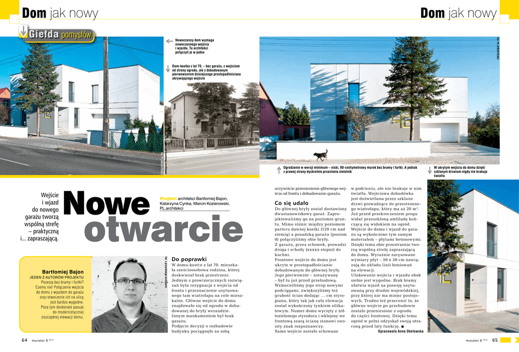 Dom jak nowy Dom jak nowy fot. PL.architekci Giełda pomysłów Nowoczesny dom wymaga nowoczesnego wejścia i wjazdu. Tu architekci połączyli je w jedno Dom-kostka z lat 70. – bez garażu, z wejściem od strony ogrodu, ale z dobudowanym pierwowzorem dzisiejszego prostopadłościanu ukrywającego wejście fot. PL.architekci Nowe 2013 Do poprawki W domu-kostce z lat 70. mieszkała sześcioosobowa rodzina, której doskwierał brak przestrzeni. Jednym z prowizorycznych rozwiązań była rezygnacja z wejścia od frontu i przeznaczenie usytuowanego tam wiatrołapu na cele mieszkalne. Główne wejście do domu znajdowało się od ogrodu w dobudowanej do bryły werandzie. Innym mankamentem był brak garażu. Podjęcie decyzji o rozbudowie budynku pociągnęło za sobą Co się udało Do głównej bryły został dostawiony dwustanowiskowy garaż. Zaprojektowaliśmy go na poziomie gruntu. Mimo różnic między poziomem parteru dawnej kostki (120 cm nad ziemią) a posadzką garażu (poziom 0) połączyliśmy obie bryły. Z garażu, przez schowek, prowadzi droga i schody (xxxxx stopni) do kuchni. Frontowe wejście do domu jest ukryte w prostopadłościanie dobudowanym do głównej bryły. Jego pierwowzór – nieużywany – był tu już przed przebudową. Wzmocniliśmy jego strop nowymi podciągami, zwiększyliśmy też grubość ścian dodając … cm styropianu, który tak jak cała elewacja został wykończony tynkiem silikatowym. Numer domu wycięty z żółtozielonego styroduru i wklejony we frontową szarą ścianę stanowi swoisty znak rozpoznawczy. Samo wejście zostało schowane w podcieniu, ale nie brakuje w nim światła. Wejściowa dobudówka jest doświetlana przez szklane drzwi prowadzące do przestronnego wiatrołapu, który ma aż 20 m 2 . Już przed przekroczeniem progu widać przeszkloną amfiladę kończącą się widokiem na ogród. Wejście do domu i wjazd do garażu są wykończone tym samym materiałem – płytami betonowymi. Dzięki temu obie przestrzenie tworzą wspólną strefę zapraszającą do domu. Wyraźnie zarysowane wymiary płyt – 50 x 50 cm nawiązują do układu linii boniowań na elewacji. Ulukowanie wejścia i wjazdu obok siebie jest wygodne. Brak bramy ułatwia wjazd na posesję usytuowaną przy drodze wojewódzkiej, przy której nie ma miejsc postojowych. Trudno też przecenić to, że główne wejście po przebudowie zostało przeniesione z ogrodu do części frontowej. Dzięki temu ogród w pełni odzyskał swoją utraconą przed laty funkcję. r Opracowała Anna Okołowska W ukrytym wejściu do domu dzięki szklanym drzwiom nigdy nie brakuje światła fot. PL.architekci murator 8 Projekt architekci Bartłomiej Bajon, Katarzyna Cynka, Marcin Kozierowski, PL.architekci fot. z prywatnego archiwum Posesja bez bramy i furtki? Czemu nie! Połączenie wejścia do domu z wjazdem do garażu oraz otworzenie ich na ulicę jest bardzo wygodne. Poza tym doskonale pasuje do modernistycznej oszczędnej elewacji domu. 64 oczywiście przeniesienie głównego wejścia od frontu i dobudowanie garażu. otwarcie Bartłomiej Bajon JEDEN Z AUTORÓW PROJEKTU fot. z prywatnego archiwum Wejście i wjazd do nowego garażu tworzą wspólną strefę – praktyczną i... zapraszającą. Ogrodzenie w wersji minimum – niski, 90-centymetrowy murek bez bramy i furtki. A jednak z prawej strony dyskretnie przesłania śmietnik murator 8 2013 65