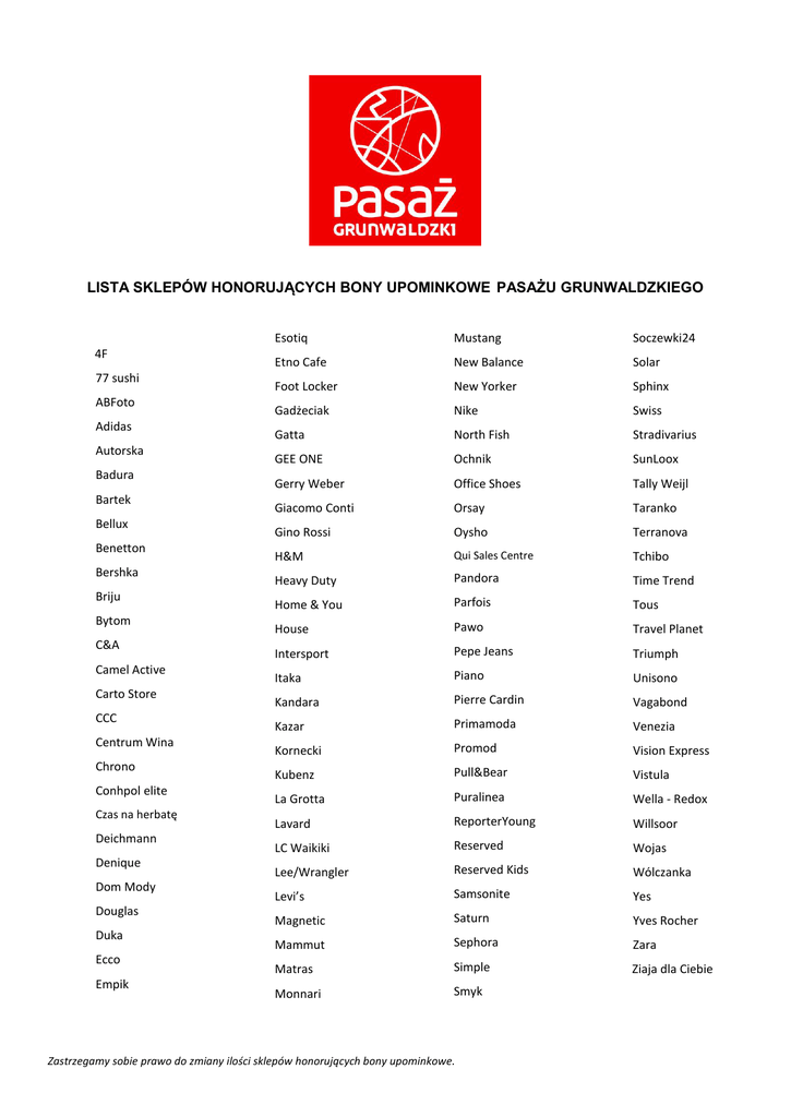 LISTA SKLEPÓW HONORUJĄCYCH BONY UPOMINKOWE PASAŻU GRUNWALDZKIEGO 4F 77 sushi ABFoto Adidas Autorska Badura Bartek Bellux Benetton Bershka Briju Bytom C&A Camel Active Carto Store CCC Centrum Wina Chrono Conhpol elite Czas na herbatę Deichmann Denique Dom Mody Douglas Duka Ecco Empik Esotiq Mustang Soczewki24 Etno Cafe New Balance Solar Foot Locker New Yorker Sphinx Gadżeciak Nike Swiss Gatta North Fish Stradivarius GEE ONE Ochnik SunLoox Gerry Weber Office Shoes Tally Weijl Giacomo Conti Orsay Taranko Gino Rossi Oysho Terranova H&M Qui Sales Centre Tchibo Heavy Duty Pandora Time Trend Home & You Parfois Tous House Pawo Travel Planet Intersport Pepe Jeans Triumph Itaka Piano Unisono Kandara Pierre Cardin Vagabond Kazar Primamoda Venezia Kornecki Promod Vision Express Kubenz Pull&Bear Vistula La Grotta Puralinea Wella - Redox Lavard ReporterYoung Willsoor LC Waikiki Reserved Wojas Lee/Wrangler Reserved Kids Wólczanka Levi’s Samsonite Yes Magnetic Saturn Yves Rocher Mammut Sephora Zara Matras Simple Ziaja dla Ciebie Monnari Smyk Zastrzegamy sobie prawo do zmiany ilości sklepów honorujących bony upominkowe.