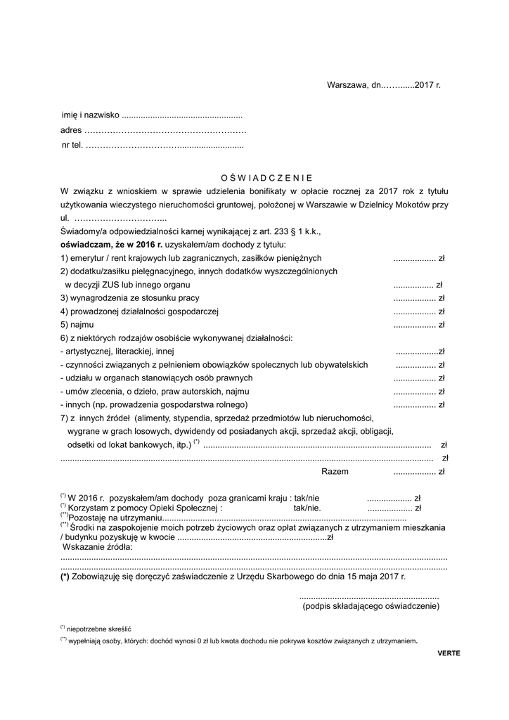 Warszawa, dn.……......2017 r. imię i nazwisko ................................................... adres ………………………………………………… nr tel. ……………………………........................... O ŚW IAD C Z EN I E W związku z wnioskiem w sprawie udzielenia bonifikaty w opłacie rocznej za 2017 rok z tytułu użytkowania wieczystego nieruchomości gruntowej, położonej w Warszawie w Dzielnicy Mokotów przy ul. …………………………... Świadomy/a odpowiedzialności karnej wynikającej z art. 233 § 1 k.k., oświadczam, że w 2016 r. uzyskałem/am dochody z tytułu: 1) emerytur / rent krajowych lub zagranicznych, zasiłków pieniężnych .................. zł 2) dodatku/zasiłku pielęgnacyjnego, innych dodatków wyszczególnionych w decyzji ZUS lub innego organu ................. zł 3) wynagrodzenia ze stosunku pracy .................. zł 4) prowadzonej działalności gospodarczej .................. zł 5) najmu .................. zł 6) z niektórych rodzajów osobiście wykonywanej działalności: - artystycznej, literackiej, innej ..................zł - czynności związanych z pełnieniem obowiązków społecznych lub obywatelskich ................. zł - udziału w organach stanowiących osób prawnych .................. zł - umów zlecenia, o dzieło, praw autorskich, najmu .................. zł - innych (np. prowadzenia gospodarstwa rolnego) .................. zł 7) z innych źródeł (alimenty, stypendia, sprzedaż przedmiotów lub nieruchomości, wygrane w grach losowych, dywidendy od posiadanych akcji, sprzedaż akcji, obligacji, (*) ................................................................................................ zł ............................................................................................................................................................. zł odsetki od lokat bankowych, itp.) Razem .................. zł (*) W 2016 r. pozyskałem/am dochody poza granicami kraju : tak/nie ................... zł Korzystam z pomocy Opieki Społecznej : tak/nie. ................... zł (**) Pozostaję na utrzymaniu....................................................................................................... (**) Środki na zaspokojenie moich potrzeb życiowych oraz opłat związanych z utrzymaniem mieszkania / budynku pozyskuję w kwocie ...............................................................zł Wskazanie źródła: ................................................................................................................................................................... ................................................................................................................................................................... (*) Zobowiązuję się doręczyć zaświadczenie z Urzędu Skarbowego do dnia 15 maja 2017 r. (*) ........................................................... (podpis składającego oświadczenie) (*) (**) niepotrzebne skreślić wypełniają osoby, których: dochód wynosi 0 zł lub kwota dochodu nie pokrywa kosztów związanych z utrzymaniem. VERTE