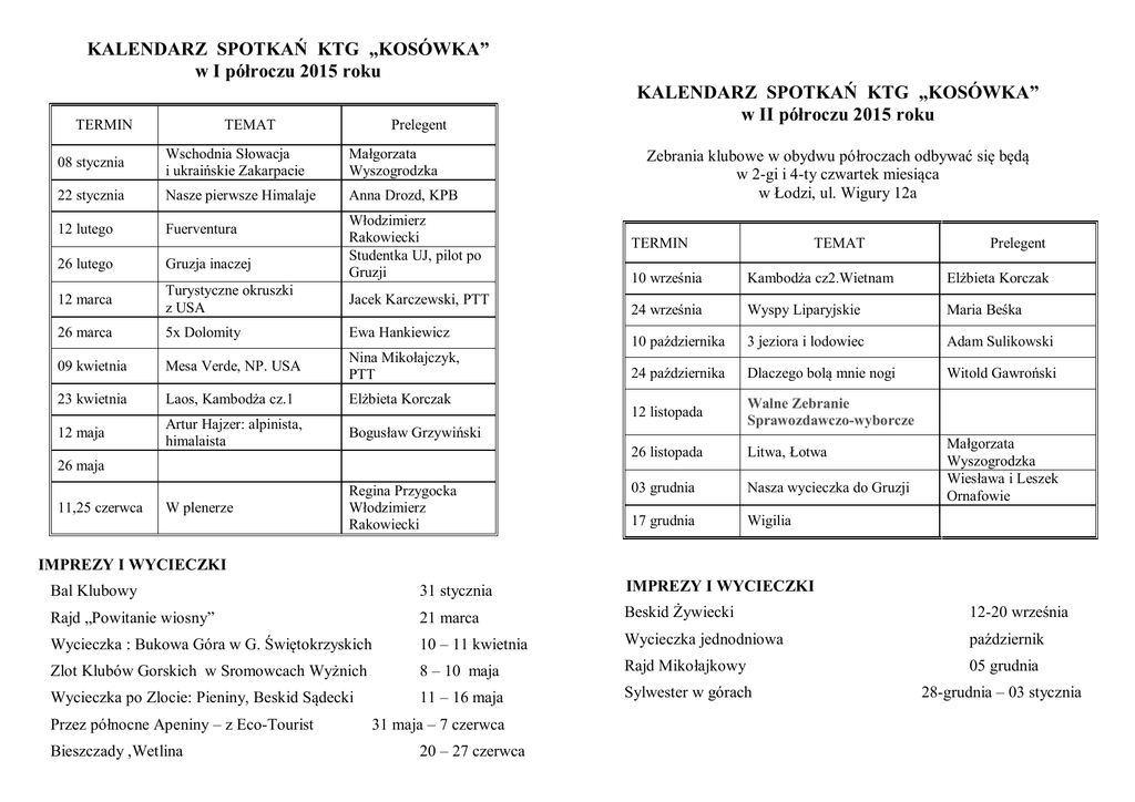 KALENDARZ SPOTKAŃ KTG „KOSÓWKA” w I półroczu 2015 roku TERMIN TEMAT Prelegent 08 stycznia Wschodnia Słowacja i ukraińskie Zakarpacie Małgorzata Wyszogrodzka 22 stycznia Nasze pierwsze Himalaje Anna Drozd, KPB 12 lutego Fuerventura Włodzimierz Rakowiecki Studentka UJ, pilot po Gruzji 26 lutego Gruzja inaczej 12 marca Turystyczne okruszki z USA Jacek Karczewski, PTT 26 marca 5x Dolomity Ewa Hankiewicz 09 kwietnia Mesa Verde, NP. USA Nina Mikołajczyk, PTT 23 kwietnia Laos, Kambodża cz.1 Elżbieta Korczak 12 maja Artur Hajzer: alpinista, himalaista Bogusław Grzywiński W plenerze Regina Przygocka Włodzimierz Rakowiecki KALENDARZ SPOTKAŃ KTG „KOSÓWKA” w II półroczu 2015 roku Zebrania klubowe w obydwu półroczach odbywać się będą w 2-gi i 4-ty czwartek miesiąca w Łodzi, ul. Wigury 12a TERMIN TEMAT 10 września Kambodża cz2.Wietnam Elżbieta Korczak 24 września Wyspy Liparyjskie Maria Beśka 10 października 3 jeziora i lodowiec Adam Sulikowski 24 października Dlaczego bolą mnie nogi Witold Gawroński 12 listopada Walne Zebranie Sprawozdawczo-wyborcze 26 listopada Litwa, Łotwa 03 grudnia Nasza wycieczka do Gruzji 17 grudnia Wigilia 26 maja 11,25 czerwca Prelegent Małgorzata Wyszogrodzka Wiesława i Leszek Ornafowie IMPREZY I WYCIECZKI Bal Klubowy 31 stycznia IMPREZY I WYCIECZKI Rajd „Powitanie wiosny” 21 marca Beskid Żywiecki 12-20 września Wycieczka : Bukowa Góra w G. Świętokrzyskich 10 – 11 kwietnia Wycieczka jednodniowa październik Zlot Klubów Gorskich w Sromowcach Wyżnich 8 – 10 maja Rajd Mikołajkowy 05 grudnia Wycieczka po Zlocie: Pieniny, Beskid Sądecki 11 – 16 maja Sylwester w górach 28-grudnia – 03 stycznia Przez północne Apeniny – z Eco-Tourist Bieszczady ,Wetlina 31 maja – 7 czerwca 20 – 27 czerwca