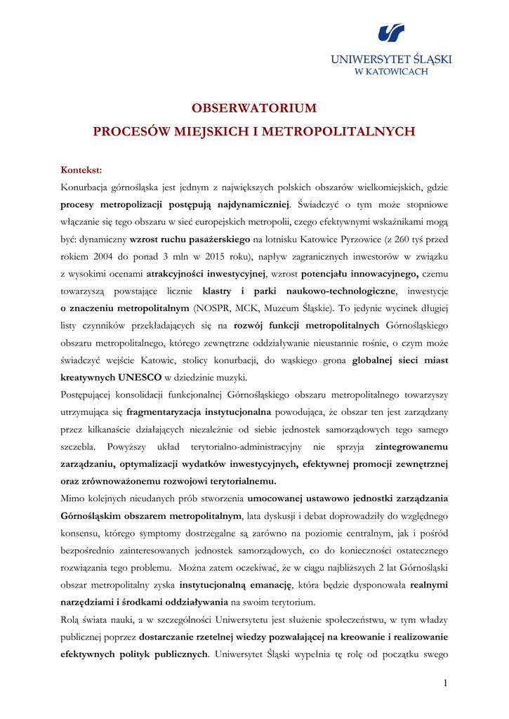 OBSERWATORIUM PROCESÓW MIEJSKICH I METROPOLITALNYCH Kontekst: Konurbacja górnośląska jest jednym z największych polskich obszarów wielkomiejskich, gdzie procesy metropolizacji postępują najdynamiczniej. Świadczyć o tym może stopniowe włączanie się tego obszaru w sieć europejskich metropolii, czego efektywnymi wskaźnikami mogą być: dynamiczny wzrost ruchu pasażerskiego na lotnisku Katowice Pyrzowice (z 260 tyś przed rokiem 2004 do ponad 3 mln w 2015 roku), napływ zagranicznych inwestorów w związku z wysokimi ocenami atrakcyjności inwestycyjnej, wzrost potencjału innowacyjnego, czemu towarzyszą powstające licznie klastry i parki naukowo-technologiczne, inwestycje o znaczeniu metropolitalnym (NOSPR, MCK, Muzeum Śląskie). To jedynie wycinek długiej listy czynników przekładających się na rozwój funkcji metropolitalnych Górnośląskiego obszaru metropolitalnego, którego zewnętrzne oddziaływanie nieustannie rośnie, o czym może świadczyć wejście Katowic, stolicy konurbacji, do wąskiego grona globalnej sieci miast kreatywnych UNESCO w dziedzinie muzyki. Postępującej konsolidacji funkcjonalnej Górnośląskiego obszaru metropolitalnego towarzyszy utrzymująca się fragmentaryzacja instytucjonalna powodująca, że obszar ten jest zarządzany przez kilkanaście działających niezależnie od siebie jednostek samorządowych tego samego szczebla. Powyższy układ terytorialno-administracyjny nie sprzyja zintegrowanemu zarządzaniu, optymalizacji wydatków inwestycyjnych, efektywnej promocji zewnętrznej oraz zrównoważonemu rozwojowi terytorialnemu. Mimo kolejnych nieudanych prób stworzenia umocowanej ustawowo jednostki zarządzania Górnośląskim obszarem metropolitalnym, lata dyskusji i debat doprowadziły do względnego konsensu, którego symptomy dostrzegalne są zarówno na poziomie centralnym, jak i pośród bezpośrednio zainteresowanych jednostek samorządowych, co do konieczności ostatecznego rozwiązania tego problemu. Można zatem oczekiwać, że w ciągu najbliższych 2 lat Górnośląski obszar metropolitalny zyska instytucjonalną emanację, która będzie dysponowała realnymi narzędziami i środkami oddziaływania na swoim terytorium. Rolą świata nauki, a w szczególności Uniwersytetu jest służenie społeczeństwu, w tym władzy publicznej poprzez dostarczanie rzetelnej wiedzy pozwalającej na kreowanie i realizowanie efektywnych polityk publicznych. Uniwersytet Śląski wypełnia tę rolę od początku swego 1 istnienia, starając się aktywnie reagować i antycypować nadchodzące zmiany. Mając poczucie tej misji Uniwersytet Śląski powołał w ramach swoich struktur OBSERWATORIUM PROCESÓW MIEJSKICH I METROPOLITALNYCH, którego prace przyczynią się do dynamicznego, a jednocześnie zrównoważonego rozwoju Górnośląskiego obszaru metropolitalnego. Trudno bowiem sobie wyobrazić zarządzanie tak złożonym i zróżnicowanym organizmem miejskim, bez dostępu do rzetelnych danych, badań i wiedzy w zakresie procesów występujących w skali ponad miejskiej i metropolitalnej. Forma organizacyjna: Inicjatywa została utworzona przy Uniwersytecie Śląskim i jest przez niego koordynowana. Do współpracy zaproszone będą inne uczelnie i jednostki naukowe, gospodarcze etc. Przy Obserwatorium funkcjonować będzie Rada Programowa składająca się z przedstawicieli JST, NGO i środowisk gospodarczych. Zadania: 1. Oferowanie usług eksperckich na zamówienie JST; 2. Analiza procesów SMART-CITY; 3. Gromadzenie informacji i poszerzanie wiedzy w zakresie zachodzących na obszarze konurbacji śląskiej procesów, ze szczególnym uwzględnieniem procesów społecznych, kulturowych, politycznych i gospodarczych; 4. Podejmowanie badań związanych z procesami metropolizacyjnymi, o jakich mowa w punkcie 3 oraz tych wynikających z bezpośredniego zapotrzebowania zainteresowanych jednostek samorządu terytorialnego; 5. Popularyzowanie wiedzy w zakresie badanych procesów i zjawisk w społeczeństwie ze szczególnym uwzględnieniem środowiska naukowego oraz miejskich, regionalnych i państwowych struktur instytucjonalnych; 6. Wzbogacanie debaty publicznej w zakresie wyzwań, szans i zagrożeń stających przed śląską konurbacją, w perspektywie jej zrównoważonego rozwoju; 7. Tworzenie płaszczyzny wymiany informacji i doświadczeń pomiędzy osobami i instytucjami zainteresowanymi problematyką śląskiej konurbacji; 8. Organizowanie spotkań, prelekcji, i.in.; 9. Prowadzenie działalności wydawniczej; 10. Współpraca z wszelkimi osobami i instytucjami, które mogą przyczynić się do realizacji celów Obserwatorium; 11. Wspieranie działań innych podmiotów sprzyjających realizacji celów Obserwatorium. 2 Analizy i badania: Jednym z pierwszych działań Obserwatorium będzie zbadanie potrzeb i luk w wiedzy jednostek samorządowych i innych podmiotów (GZM, KZK GOP, Związek Gmin i Powiatów Subregionu Centralnego, itd.) działających na terenie Górnośląskiego obszaru metropolitalnego. Dokonanie inwentaryzacji potrzeb i deficytów wiedzy pozwoli na zdefiniowanie priorytetowych projektów badawczych, które zespół Obserwatorium powinien przeprowadzić w pierwszej kolejności. Przykładowe problemy badawcze stanowiące przedmiot prac Obserwatorium: potrzeby JST w zakresie usług podmiotów eksperckich, wyzwania i kierunki rozwoju Górnośląskiego obszaru metropolitalnego (GOM), ruch wahadłowy ze szczególnym uwzględnieniem dojazdów do pracy na terenie GOM, diagnoza metropolitalnego współrządzenia na terenie GOM. Zaangażowanie środowisk gospodarczych, organizacji pozarządowych, jednostek badawczych w kształtowanie polityk metropolitalnych, spójność społeczna i terytorialna w kontekście zrównoważonego rozwoju w GOM, opinie mieszkańców na temat procesu integracji GOM, jego funkcjonowania w perspektywie kształtowania się tożsamości metropolitalnej . Analizy i badania sektorowe, m.in.: Transport publiczny