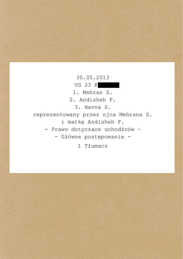 30.05.2013 VG 23 K --1. Mehran S. 2. Andisheh F. 3. Havva S. reprezentowany przez ojca Mehrana S. i matkę Andisheh F. - Prawo dotyczące uchodźców – - Główne postępowanie 1 Tłumacz Andisheh F., rok urodzenia 1983. Młoda kobieta z Iranu uciekła w roku 2011 ze swoim mężem i córką do Niemiec. W Teheranie pracowała jako sekretarka w przychodni lekarskiej. Po wyborach prezydenckich w roku 2009 opiekowano się w tej przychodni pacjentami politycznymi. Były to osoby z więzień, w których były często torturowane. Dokumentacja tych pacjentów była przechowywana na laptopie. Andisheh brała ten laptop dobrowolnie do domu, nie informując o tym swego męża. W roku 2011 został przeszukany ich dom, rodzina uciekła. W sali sądowej znajdują się: Sędzia, oskarżona (Andisheh F.), jej adwokatka i tłumacz. Koło godziny 12 zostaje przesłuchany jej mąż, Mehran S.. Jest tłumaczone z perskiego na niemiecki. Poprzednia sekretarka obawiała się zajmować politycznie aktywnymi pacjentami po oficjalnych godzinach przyjęć. Dlatego zwolniła się z pracy. Nad tymi pacjentami znęcano się w więzieniu. Dlaczego poprzednia sekretarka zwolniła się z pracy w przychodni? Andisheh: Poprzednia sekretarka obawiała się zajmować politycznie aktywnymi pacjentami po oficjalnych godzinach przyjęć. Dlatego zwolniła się z pracy. Nad tymi pacjentami znęcano się w więzieniu. Sędzia: Czy uczestniczyła Pani w demonstracjach po wyborach prezydenckich w Iranie w roku 2009? Andisheh: Nieregularnie. Dwukrotnie uczestniczyłam w demonstracji. Sędzia: Powiedziała Pani, że się Pani nie angażuje politycznie, ale brała Pani udział w demonstracjach. Andisheh: Miałam na myśli, że nie jestem członkinią partii czy organizacji politycznej. Sama zaoferowałam wzięcie laptopa do siebie do domu. Na nim były zapisane dane politycznie aktywnych pacjentów. Mniej więcej 22 osób. Niech mi Pani wytłumaczy, dlaczego taka mądra kobieta z mężem i dzieckiem podejmuje takie ryzyko. Mogło to się zdarzyć każdemu, także mojemu ojcu. Moim obowiązkiem była pomoc tym ludziom. Chciałam to uczynić dla mojego kraju, dla demokracji. Mam „miękkie serce“. Moje uczucia wygrały z rozsądkiem. Mój mąż nie wiedział, że laptop z tymi danymi leży u nas w domu. Nie opowiedziałam mu nic o tym. Ciężko w to uwierzyć! Sędzia: Były też dokumenty w wersji papierowej? Latem 2011 otrzymał jeden z lekarzy telefon z groźbami. Po tym telefonie przestaliśmy zajmować się politycznie aktywnymi pacjentami. Myślałam, że nic mi się nie stanie. Jestem tylko sekretarką. I nie obawiała się Pani niczego? W Iranie ciągle towarzyszy nam lęk. To zaczyna już się w kwestii odzieży. Dorastamy w strachu. Mam dziś zły dzień. Po angielsku mówi się „bad hair day”, ja mam dziś natomiast „bad speech day”. Mam trudność w formułowaniu myśli. Pani historia jest w wielu momentach niejasna. Jest w niej wiele niewyjaśnionych kwestii. Aczkolwiek nie mogę sobie wyobrazić, żeby była ona zmyślona. O 12:35 pojawia się mąż. Nie jestem członkiem partii. Jednakże jestem niezadowolony z sytuacji w moim kraju. W perskim pojęciu nie rozróżnia się między płcią. W Pana zeznaniach wobec Urzędu są sprzeczności. Został Pan ostrzeżony przez sąsiada czy sasiadkę? Czy Pana zdaniem żona postąpiła właściwie? Gdy o tym teraz myślę, nie było to właściwe. Musieliśmy zrezygnować z całego naszego życia w Iranie i teraz jesteśmy tutaj, w tej sytuacji. Nasze życie zmieniło się. Mam czterdzieści lat, co mam tutaj robić? Co mam jeszcze powiedzieć? Wierzę Panu. Jako Sędzia mam jednak trudność to wszysko przyjąć w ten sposób do wiadomości. Proszę mi pomóc. To jedna z najbardziej nietypowych historii, z jakimi się tutaj spotkałam. Wiele z tego brzmi nielogicznie. Dlatego wierzę, że nie jest to wszystko wymyślone. Ktoś, kto zmyśla, opowiedziałby logiczną historię. W Iranie nigdy nie byliśmy wolni. Od kiedy jestesmy w Niemczech, rozwinęłam poczucie, jak może myśleć wolna kobieta. Dlatego rozumiem, dlaczego Wysoki Sąd mnie nie rozumie. Wyrosła Pani w innych warunkach. W domu dla starających się o status uchodźcy nie mamy internetu. Gdyby było inaczej, znalazłbym te informacje i przyniósł tutaj. Tego nie musi Pan robić. To jest moje zadanie. My, jako sędziowie, mamy zawsze bardzo mało czasu na poznanie osób. Musimy szukać odpowiedzi, wyjaśnienia. Muszę wierzyć w Pani historię. W innym razie, nie mogę udzielić prawa do azylu. Ciężko mi uwierzyć, że Pana żona przechowywała w domu dokumenty, które mogły całą rodzinę narazić na ryzyko. Mówi, że była w swoim przekonaniu nieistotną sekretarką, której nic złego by się nie mogło przytrafić. Jak Pan to widzi? W internecie czytałam o represjach aktywistów politycznych. Jest wiele informacji o torturach, nawet po angielsku. Dlaczego ochrona danych na tym laptopie była taka ważna? Termin podjęcia decyzji przesunę na przyszły tydzień. Proszę wierzyć, że nie będzie to łatwa decyzja, niezależnie w jakim kierunku zostanie podjęta. 03.06.2013 Godzina: 12:00 Orzeczenie wyroku Sędzia dyktuje wyrok na dyktafon. Wniosek zostaje odrzucony. Jestem z nią sama w pomieszczeniu. Rozmawiamy. Sędzia zwraca moją uwagę na to, że rozmawia teraz ze mną jako osoba prywatna, a nie przestawicielka sądu. Rozmawiamy o tej rodzinie. Sędzia mówi, że ta historia jest bardzo nietypowa. Rodzina ta pozostawiła na niej sympatyczne wrażenie. Mimo to miała wątpliwości i nie mogła wielu rzeczy zrozumieć i w nie uwierzyć. Dlaczego Iranka wzięła do domu laptop i wierzyła, że nic nie może jej się stać? Bo była nieistotną sekretarką? Jednak lekarze musieli darzyć ją ogromnym zaufaniem. Rozmawiamy o samoświadomości kobiet. Pozycja kobiet tu i tam nie jest taka sama. Mówię, że doskonale mogę zrozumieć, dlaczego młoda Iranka zabrała laptop do domu zapominaj