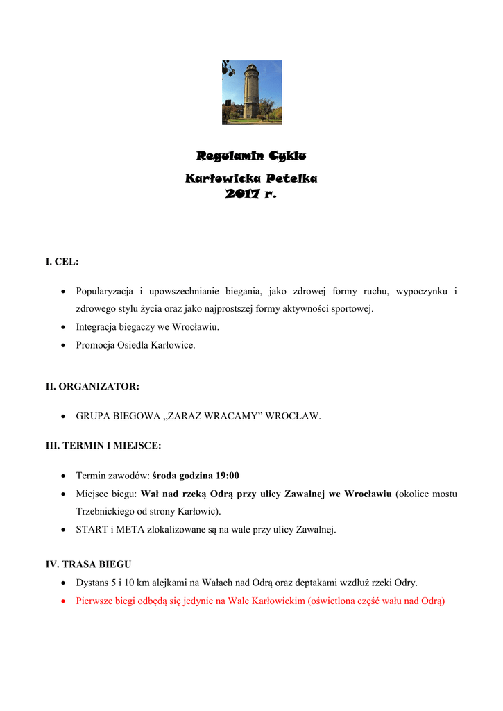 Regulamin Cyklu Karłowicka Petelka 2017 r. I. CEL: Popularyzacja i upowszechnianie biegania, jako zdrowej formy ruchu, wypoczynku i zdrowego stylu życia oraz jako najprostszej formy aktywności sportowej. Integracja biegaczy we Wrocławiu. Promocja Osiedla Karłowice. II. ORGANIZATOR: GRUPA BIEGOWA „ZARAZ WRACAMY” WROCŁAW. III. TERMIN I MIEJSCE: Termin zawodów: środa godzina 19:00 Miejsce biegu: Wał nad rzeką Odrą przy ulicy Zawalnej we Wrocławiu (okolice mostu Trzebnickiego od strony Karłowic). START i META zlokalizowane są na wale przy ulicy Zawalnej. IV. TRASA BIEGU Dystans 5 i 10 km alejkami na Wałach nad Odrą oraz deptakami wzdłuż rzeki Odry. Pierwsze biegi odbędą się jedynie na Wale Karłowickim (oświetlona część wału nad Odrą) UWAGA w okresie (od 1 listopada do 15 marca) uczestnicy biegu powinni być zaopatrzeni dla własnego bezpieczeństwa w latarki czołowe ze względu na to że część trasy jest nieoświetlona. V. UCZESTNICTWO: W biegach mogą wziąć udział osoby, które mają ukończone 14 lat (jednakże osoby do 18 roku życia mogą brać udział w biegach za pisemną zgodą rodziców lub opiekunów). VI. ZGŁOSZENIA: Drogą elektroniczną pod linkiem: (link) Wszelkie informacje pod nr telefonu: 604-317-570 VII. KLASYFIKACJE: BIEG z pomiarem czasu na 5 i 10 KM Kategorie wiekowe dla kobiet i mężczyzn K i M 18 (15-19 lat) K i M 20 (20-29 lat) K i M 30 (30-39 lat) K i M 40 (40-49 lat) K i M 50 (50-59 lat) K i M 60 lat i więcej VIII. SPRAWY FINANSOWE: Udział w biegach jest bezpłatny. IX. POSTANOWIENIA KOŃCOWE Podczas biegu wszyscy zawodnicy muszą posiadać numer startowy przypięty do koszulki z przodu na klatce piersiowej. Przyjęcie numeru startowego jest równoznaczne z akceptacją Regulaminu. Biegi będą odbywać się zgodnie z harmonogramem. W razie zmian zamieszczona zostanie informacja na stronie internetowej biegów (Facebook). Uczestnicy biegu wyrażają zgodę na przetwarzanie ich danych osobowych dla potrzeb wewnętrznych organizatora, a także wyrażają zgodę na wykorzystanie ich wizerunku w materiałach informacyjnych i reklamowych cyklu biegowego. Organizator cyklu biegowego zapewnia ochronę danych osobowych zawodników zgodnie z wymogami Ustawy z dnia 29.08.1997 r. o ochronie danych osobowych. Organizator zastrzega sobie prawo do zmian w regulaminie, o których zobowiązuje się poinformować wszystkich uczestników przed rozpoczęciem imprezy. Interpretacja niniejszego regulaminu należy do Organizatora. Zabrania się startu zawodnikom będącym pod wpływem alkoholu lub innych środków odurzających. Organizator nie zapewnia opieki medycznej i ubezpieczenia od następstw nieszczęśliwych wypadków. Każdy uczestnik bierze udział w biegu wyłącznie na własną odpowiedzialność. Zaleca się przeprowadzenie odpowiednich profilaktycznych badań lekarskich oraz ubezpieczenie się we własnym zakresie. W celu zapewnienia bezpieczeństwa, wszystkich zawodników obowiązuje bezwzględne stosowanie się do zaleceń wolontariuszy oraz Organizatora biegu. Organizator zastrzega sobie ostateczne prawo wiążącej interpretacji Regulaminu. W sprawach nieujętych Regulaminem rozstrzyga Organizator. Dyrektor biegu: Marcin Syperek