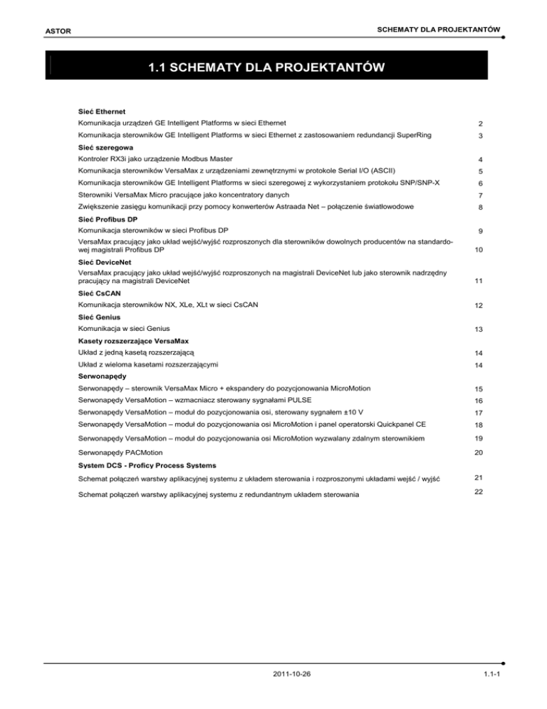 SCHEMATY DLA PROJEKTANTÓW ASTOR 1.1 SCHEMATY DLA PROJEKTANTÓW Sieć Ethernet Komunikacja urządzeń GE Intelligent Platforms w sieci Ethernet 2 Komunikacja sterowników GE Intelligent Platforms w sieci Ethernet z zastosowaniem redundancji SuperRing 3 Sieć szeregowa Kontroler RX3i jako urządzenie Modbus Master 4 Komunikacja sterowników VersaMax z urządzeniami zewnętrznymi w protokole Serial I/O (ASCII) 5 Komunikacja sterowników GE Intelligent Platforms w sieci szeregowej z wykorzystaniem protokołu SNP/SNP-X 6 Sterowniki VersaMax Micro pracujące jako koncentratory danych 7 Zwiększenie zasięgu komunikacji przy pomocy konwerterów Astraada Net – połączenie światłowodowe 8 Sieć Profibus DP Komunikacja sterowników w sieci Profibus DP 9 VersaMax pracujący jako układ wejść/wyjść rozproszonych dla sterowników dowolnych producentów na standardowej magistrali Profibus DP 10 Sieć DeviceNet VersaMax pracujący jako układ wejść/wyjść rozproszonych na magistrali DeviceNet lub jako sterownik nadrzędny pracujący na magistrali DeviceNet 11 Sieć CsCAN Komunikacja sterowników NX, XLe, XLt w sieci CsCAN 12 Sieć Genius Komunikacja w sieci Genius 13 Kasety rozszerzające VersaMax Układ z jedną kasetą rozszerzającą 14 Układ z wieloma kasetami rozszerzającymi 14 Serwonapędy Serwonapędy – sterownik VersaMax Micro + ekspandery do pozycjonowania MicroMotion 15 Serwonapędy VersaMotion – wzmacniacz sterowany sygnałami PULSE 16 Serwonapędy VersaMotion – moduł do pozycjonowania osi, sterowany sygnałem ±10 V 17 Serwonapędy VersaMotion – moduł do pozycjonowania osi MicroMotion i panel operatorski Quickpanel CE 18 Serwonapędy VersaMotion – moduł do pozycjonowania osi MicroMotion wyzwalany zdalnym sterownikiem 19 Serwonapędy PACMotion 20 System DCS - Proficy Process Systems Schemat połączeń warstwy aplikacyjnej systemu z układem sterowania i rozproszonymi układami wejść / wyjść 21 Schemat połączeń warstwy aplikacyjnej systemu z redundantnym układem sterowania 22 2011-10-26 1.1-1 SCHEMATY DLA PROJEKTANTÓW ASTOR Komunikacja urządzeń GE Intelligent Platforms w sieci Ethernet Ethernet SRTP max 100 m opcjonalnie PC + system wizualizacji + narzędzie do programowania sterowników (Proficy ME) sterownik VersaMax Micro 64pkt. np. IC200UDR164 moduł komunikacyjny IC200UEM001 1 Ethernet switch SRTP (serwer) lub ModbusTCP (serwer) JetNet-3008 max 100 m Ethernet SRTP max 100 m Ethernet SRTP lub ModbusTCP (klient/serwer) lub EGD max 100 m Ethernet SRTP lub EGD max 100 m ETM001 panel operatorski QuickPanel CE np. IC754VGI06STD CPUE05 1 1 kontroler RX3i moduł komunikacyjny IC695ETM001 1 1.1-2 sterownik VersaMax IC200CPUE05 port RJ-45 skonfigurowany do pracy w sieci Ethernet 2011-10-26 SCHEMATY DLA PROJEKTANTÓW ASTOR Komunikacja sterowników GE Intelligent Platforms w sieci Ethernet z zastosowaniem redundancji Super Ring system wizualizacji (opcjonalnie) + narzędzie do wizualizacji (Cimplicity, iFIX lub InTouch) Ethernet SRTP max 100 m switch SRTP max 100 m panel operatorski QuickPanel CE np. IC754VGI06STD Ethernet max 100 m Ethernet sterownik VersaMax Micro 64pkt. IC200UDR164 moduł komunikacyjny IC200UEM001 SRTP(serwer) lub ModbusTCP(serwer) stanowisko inŜynierskie opcjonalnie PC + narzędzie do programowania sterowników (Proficy ME) Ethernet SRTP max 100 m JetNet-5010G Ethernet SRTP lub EGD lub ModbusTCP (klient/serwer) max 100 m Super Ring Ethernet połączenie awaryjne SRTP lub EGD lub ModbusTCP (klient/serwer) max 100 m switch JetNet-5010G JetNet-5010G ETM001 Ethernet sterownik VersaMax IC200CPUE05 ETM001 kontroler RX3i dowolne CPU (np. IC695CPU320) moduł komunikacyjny IC695ETM001 max 100 m CPUE05 Ethernet kontroler RX3i jako układ wejść/wyjść interfejs komunikacyjny IC695NIU001 moduł komunikacyjny IC695ETM001 EGD lub ModbusTCP (serwer) CPU320 SRTP(serwer) lub EGD max 100 m NIU001 switch EBI001 układ wejść/wyjść VersaMax I/O interfejs komunikacyjny IC200EBI001 2011-10-26 1.1-3 SCHEMATY DLA PROJEKTANTÓW ASTOR Kontroler RX3i jako urządzenie Modbus Master CMM004 kontroler RX3i moduł komunikacyjny IC695CMM002 (2-porty) lub IC695CMM004 (4-porty) moduły zapewniają optoizolację (MASTER) 1 1 RS232 ModbusRTU max 15 m terminowanie magistrali (rezystor 120Ω) RS485 RS485 ModbusRTU max 1200 m ModbusRTU max 1200 m 3 2 sterownik VersaMax Nano 10pkt. IC200NDD101 (SLAVE) sterownik VersaMax Micro 28 pkt. IC200UDR006 (SLAVE) terminowanie magistrali (rezystor 120Ω) RS485 ModbusRTU max 1200 m Konwerter RS485/RS232 np.. JetCon-2201-i-w RS232 ModbusRTU max 15 m CPU001 2 sterownik VersaMax Nano 10pkt. IC200NDD101 (SLAVE) 3 sterownik VersaMax np. IC200CPU001 (SLAVE) 1 port RJ-45 skonfigurowany do pracy w protokole ModbusRTU (Master) 2 port RJ-45 skonfigurowany do pracy w protokole ModbusRTU (Slave) 3 port DB-15 skonfigurowany do pracy w protokole ModbusRTU (Slave) Kabel do komunikacji w sieci szeregowej: Belden 9842 (4-przewodowy), Belden 3105A (2-przewodowy) 1.1-4 2011-10-26 SCHEMATY DLA PROJEKTANTÓW ASTOR Komunikacja sterowników VersaMax z urządzeniami zewnętrznymi w protokole Serial I/O (ASCII) sterownik VersaMax np. IC200CPU001 Urządzenie obsługujące Serial I/O np. czytnik kodów kreskowych, czytnik kart magnetycznych, itp. 1 1 port DB-15 skonfigurowany do pracy w protokole Serial I/O RS485 2 port RJ-45 skonfigurowany Serial I/O (ASCII) max 1200 m sterownik VersaMax Micro (2 porty) np. IC200UDR006 1 do pracy w protokole Serial I/O Urządzenie obsługujące Serial I/O np. czytnik kodów kreskowych, czytnik kart magnetycznych, itp. RS485 Serial I/O (ASCII) max 1200 m sterownik VersaMax Micro (1 port) np. IC200UDR001 Urządzenie obsługujące Serial I/O np. czytnik kodów kreskowych, czytnik kart magnetycznych, itp. 2 RS232 Serial I/O (ASCII) max 15 m 2011-10-26 1.1-5 SCHEMATY DLA PROJEKTANTÓW ASTOR Komunikacja sterowników GE Intelligent Platforms w sieci szeregowej z wykorzystaniem protokołu SNP/SNP-X 1 CPU315 kontroler RX3i dowolne CPU(