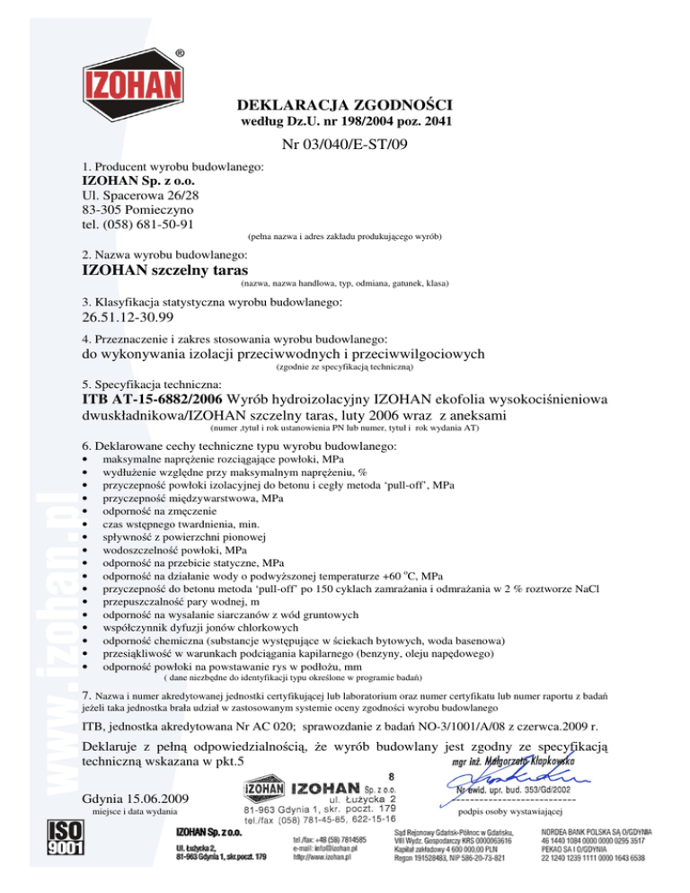 DEKLARACJA ZGODNOŚCI według Dz.U. nr 198/2004 poz. 2041 Nr 03/040/E-ST/09 1. Producent wyrobu budowlanego: IZOHAN Sp. z o.o. Ul. Spacerowa 26/28 83-305 Pomieczyno tel. (058) 681-50-91 (pełna nazwa i adres zakładu produkującego wyrób) 2. Nazwa wyrobu budowlanego: IZOHAN szczelny taras (nazwa, nazwa handlowa, typ, odmiana, gatunek, klasa) 3. Klasyfikacja statystyczna wyrobu budowlanego: 26.51.12-30.99 4. Przeznaczenie i zakres stosowania wyrobu budowlanego: do wykonywania izolacji przeciwwodnych i przeciwwilgociowych (zgodnie ze specyfikacją techniczną) 5. Specyfikacja techniczna: ITB AT-15-6882/2006 Wyrób hydroizolacyjny IZOHAN ekofolia wysokociśnieniowa dwuskładnikowa/IZOHAN szczelny taras, luty 2006 wraz z aneksami (numer ,tytuł i rok ustanowienia PN lub numer, tytuł i rok wydania AT) 6. Deklarowane cechy techniczne typu wyrobu budowlanego: • • • • • • • • • • • • • • • • • maksymalne naprężenie rozciągające powłoki, MPa wydłużenie względne przy maksymalnym naprężeniu, % przyczepność powłoki izolacyjnej do betonu i cegły metoda ‘pull-off’, MPa przyczepność międzywarstwowa, MPa odporność na zmęczenie czas wstępnego twardnienia, min. spływność z powierzchni pionowej wodoszczelność powłoki, MPa odporność na przebicie statyczne, MPa odporność na działanie wody o podwyższonej temperaturze +60 oC, MPa przyczepność do betonu metoda ‘pull-off’ po 150 cyklach zamrażania i odmrażania w 2 % roztworze NaCl przepuszczalność pary wodnej, m odporność na wysalanie siarczanów z wód gruntowych współczynnik dyfuzji jonów chlorkowych odporność chemiczna (substancje występujące w ściekach bytowych, woda basenowa) przesiąkliwość w warunkach podciągania kapilarnego (benzyny, oleju napędowego) odporność powłoki na powstawanie rys w podłożu, mm ( dane niezbędne do identyfikacji typu określone w programie badań) 7. Nazwa i numer akredytowanej jednostki certyfikującej lub laboratorium oraz numer certyfikatu lub numer raportu z badań jeżeli taka jednostka brała udział w zastosowanym systemie oceny zgodności wyrobu budowlanego ITB, jednostka akredytowana Nr AC 020; sprawozdanie z badań NO-3/1001/A/08 z czerwca.2009 r. Deklaruje z pełną odpowiedzialnością, że wyrób budowlany jest zgodny ze specyfikacją techniczną wskazana w pkt.5 Gdynia 15.06.2009 miejsce i data wydania --------------------------podpis osoby wystawiającej