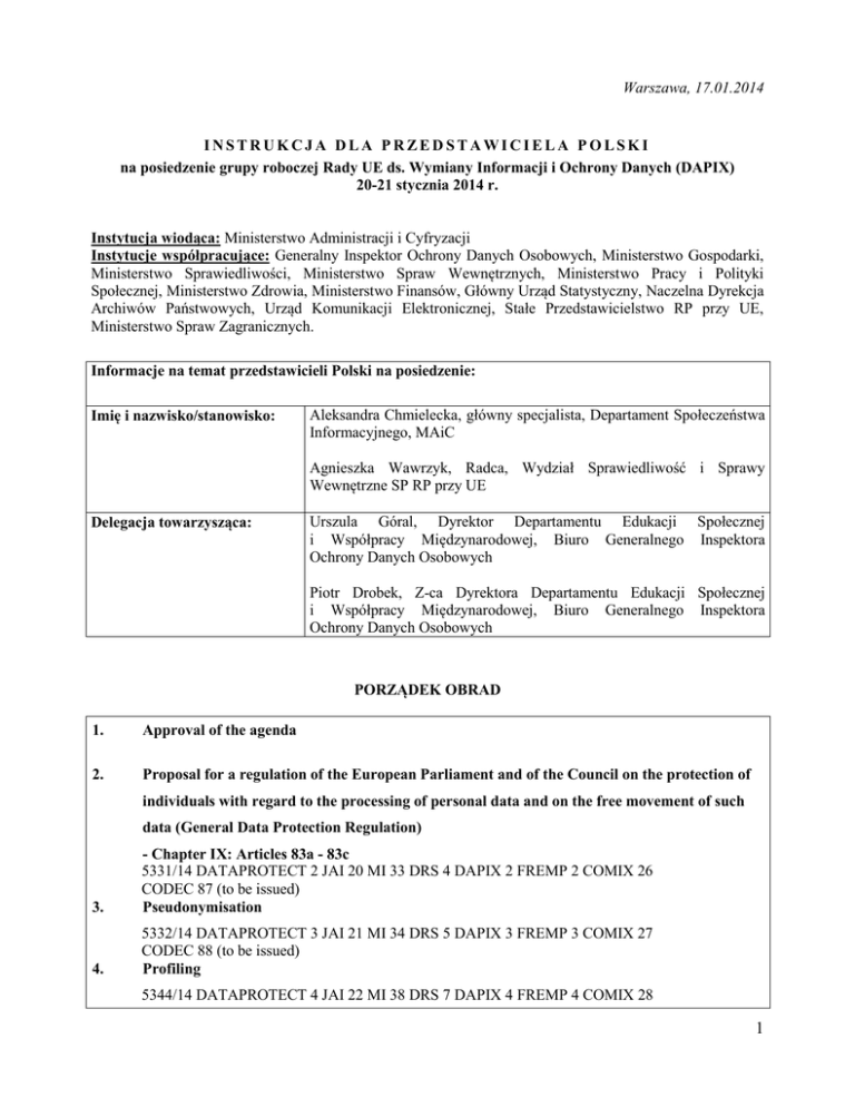 Warszawa, 17.01.2014 INSTRUKCJA DLA PRZEDSTAWICIELA POLSKI na posiedzenie grupy roboczej Rady UE ds. Wymiany Informacji i Ochrony Danych (DAPIX) 20-21 stycznia 2014 r. Instytucja wiodąca: Ministerstwo Administracji i Cyfryzacji Instytucje współpracujące: Generalny Inspektor Ochrony Danych Osobowych, Ministerstwo Gospodarki, Ministerstwo Sprawiedliwości, Ministerstwo Spraw Wewnętrznych, Ministerstwo Pracy i Polityki Społecznej, Ministerstwo Zdrowia, Ministerstwo Finansów, Główny Urząd Statystyczny, Naczelna Dyrekcja Archiwów Państwowych, Urząd Komunikacji Elektronicznej, Stałe Przedstawicielstwo RP przy UE, Ministerstwo Spraw Zagranicznych. Informacje na temat przedstawicieli Polski na posiedzenie: Imię i nazwisko/stanowisko: Aleksandra Chmielecka, główny specjalista, Departament Społeczeństwa Informacyjnego, MAiC Agnieszka Wawrzyk, Radca, Wydział Sprawiedliwość i Sprawy Wewnętrzne SP RP przy UE Delegacja towarzysząca: Urszula Góral, Dyrektor Departamentu Edukacji Społecznej i Współpracy Międzynarodowej, Biuro Generalnego Inspektora Ochrony Danych Osobowych Piotr Drobek, Z-ca Dyrektora Departamentu Edukacji Społecznej i Współpracy Międzynarodowej, Biuro Generalnego Inspektora Ochrony Danych Osobowych PORZĄDEK OBRAD 1. Approval of the agenda 2. Proposal for a regulation of the European Parliament and of the Council on the protection of individuals with regard to the processing of personal data and on the free movement of such data (General Data Protection Regulation) 3. - Chapter IX: Articles 83a - 83c 5331/14 DATAPROTECT 2 JAI 20 MI 33 DRS 4 DAPIX 2 FREMP 2 COMIX 26 CODEC 87 (to be issued) Pseudonymisation 4. 5332/14 DATAPROTECT 3 JAI 21 MI 34 DRS 5 DAPIX 3 FREMP 3 COMIX 27 CODEC 88 (to be issued) Profiling 5344/14 DATAPROTECT 4 JAI 22 MI 38 DRS 7 DAPIX 4 FREMP 4 COMIX 28 1 5. CODEC 91 (to be issued) Controller and Processor 6. 5345/14 DATAPROTECT 5 JAI 23 MI 39 DRS 8 DAPIX 5 FREMP 5 COMIX 29 CODEC 92 Any other business Stanowisko Polski do zaprezentowania podczas posiedzenia: Uwaga ogólna: Ze względu na zbyt małą ilość czasu na analizę i konsultacje międzyresortowe i społeczne Polska jest zmuszona zgłosić zastrzeżenie analityczne do przepisów i dokumentów przedstawionych przez PREZ. Wprowadzone zmiany są poważne, dotyczą najważniejszych w naszej opinii aspektów rozporządzenia (przede wszystkim profilowanie) i mają ogromne znaczenie w kontekście dalszych prac. Sa to kwestie wymagające ustaleń na poziomie politycznym a przedstawianie przepisów z tak krótkim wyprzedzeniem uniemożliwia podjęcie takich ustaleń. Apelujemy, żeby PREZ przedstawiała materiały do dyskusji z większym wyprzedzeniem niż na 2 dni robocze przed posiedzeniem. Umożliwi nam to lepsze przygotowywanie się do posiedzeń i prezentowanie stanowiska, które będzie w większym stopniu przemyślane, skonsultowane i uzgodnione na poziomie politycznym. Taka formuła pracy pozwoli nam na podjęcie wielu ustaleń na poziomie grupy roboczej, tak aby umożliwić ich przyjęcie na poziomie COREPER i Rady. Z niepokojem przyjmujemy także ponowne otwieranie niektórych zagadnień które w odczuciu Polski były już odpowiednio przedyskutowane. Proposal for a regulation of the European Parliament and of the Council on the protection of individuals with regard to the processing of personal data and on the free movement of such data (General Data Protection Regulation) - Chapter IX: Articles 83a - 83c 5331/14 DATAPROTECT 2 JAI 20 MI 33 DRS 4 DAPIX 2 FREMP 2 COMIX 26 CODEC 87 PL popiera wyszczególnienie celu archiwalnego przetwarzania danych, za czym od początku się opowiadaliśmy. Nie sprzeciwiamy się jednakowemu potraktowaniu celu historycznego z celem naukowym, jest to ciekawa koncepcja wymagająca rozważenia, jednakże kwestia ta wymaga dodatkowego przemyślenia. W tym zakresie zgłaszamy zastrzeżenie analityczne do art. 83c. Motyw (125a) i art. 83a ust. 1 lit. b) – przedstawiciel PL podziękuje za uwzględnienie naszej uwagi. Polska popiera doprecyzowanie, że prawo do poprawienia danych w przypadku przetwarzania danych do celów archiwalnych powinno obejmować jedynie możliwość uzupełnienia poprzez przedkładanie nowych materiałów („supplementary statements”) . Dla zasady bowiem, w opinii PL dane osobowe przetwarzane do celów archiwalnych nie powinny być zmieniane. Motyw (125a) i art. 83a - Nie jest jasne doprecyzowanie „general public interest” – w ocenie PL rola archiwów nie ogranicza się jedynie do realizacji interesu publicznego, ale i realizacji celów indywidualnych (np. gromadzenie dokumentacji dot. danej osoby, która może być następnie wykorzystana przez tą osobę np. w celu potwierdzenia uprawnień, jak. np. prawa do świadczenia emerytalnego). Mamy więc wątpliwość, czy takie doprecyzowanie interesu ogólnego, które realizują archiwa nie będzie wykluczać ww. aspektu istnienia archiwów. 2 Nie jest jasna zmiana konstrukcji przepisów art. 83a i art. 83c ze sformułowania „shall not apply” na sformułowanie „Member State law may”. Jak rozumiemy, podobna zmiana nie nastąpiła w art. 83b (przetwarzanie danych do celów statystycznych), co powoduje brak konsekwencji w podejściu do przetwarzania danych w trzech różnych celach. Wolelibyśmy jednolitej konstrukcji we wszystkich trzech artykułach (83a, 83b i 83c) i w większym stopniu opowiadamy się za zapewnieniem jednolitości w stosowaniu wyłączeń we wszystkich PCz. W przypadku pozostawienia wyłączeń do uregulowania w prawie krajowym uważamy, że powinny być to wyłączenia obligatoryjne. W związku z tym sugerujemy zamianę w art. 83a ust. 1 i w art. 83 c ust.3 słowa may na shall i zastosowanie we wszystkich trzech artykułach konstrukcji „Member State law shall (…) provide for derogations” W obydwu artykułach popieramy usunięcie wyłączenia dla art. 15, co odpowiada wcześniej zgłaszanym przez PL uwagom. Prawo dostępu uznajemy za jedno z