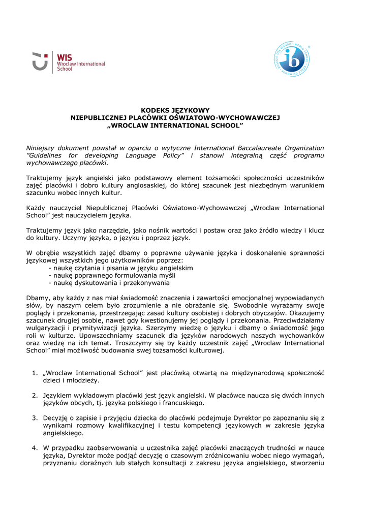 KODEKS JĘZYKOWY NIEPUBLICZNEJ PLACÓWKI OŚWIATOWO-WYCHOWAWCZEJ „WROCLAW INTERNATIONAL SCHOOL” Niniejszy dokument powstał w oparciu o wytyczne International Baccalaureate Organization ”Guidelines for developing Language Policy” i stanowi integralną część programu wychowawczego placówki. Traktujemy język angielski jako podstawowy element tożsamości społeczności uczestników zajęć placówki i dobro kultury anglosaskiej, do której szacunek jest niezbędnym warunkiem szacunku wobec innych kultur. Każdy nauczyciel Niepublicznej Placówki Oświatowo-Wychowawczej „Wroclaw International School” jest nauczycielem języka. Traktujemy język jako narzędzie, jako nośnik wartości i postaw oraz jako źródło wiedzy i klucz do kultury. Uczymy języka, o języku i poprzez język. W obrębie wszystkich zajęć dbamy o poprawne używanie języka i doskonalenie sprawności językowej wszystkich jego użytkowników poprzez: - naukę czytania i pisania w języku angielskim - naukę poprawnego formułowania myśli - naukę dyskutowania i przekonywania Dbamy, aby każdy z nas miał świadomość znaczenia i zawartości emocjonalnej wypowiadanych słów, by naszym celem było zrozumienie a nie obrażanie się. Swobodnie wyrażamy swoje poglądy i przekonania, przestrzegając zasad kultury osobistej i dobrych obyczajów. Okazujemy szacunek drugiej osobie, nawet gdy kwestionujemy jej poglądy i przekonania. Przeciwdziałamy wulgaryzacji i prymitywizacji języka. Szerzymy wiedzę o języku i dbamy o świadomość jego roli w kulturze. Upowszechniamy szacunek dla języków narodowych naszych wychowanków oraz wiedzę na ich temat. Troszczymy się by każdy uczestnik zajęć „Wroclaw International School” miał możliwość budowania swej tożsamości kulturowej. 1. „Wroclaw International School” jest placówką otwartą na międzynarodową społeczność dzieci i młodzieży. 2. Językiem wykładowym placówki jest język angielski. W placówce naucza się dwóch innych języków obcych, tj. języka polskiego i francuskiego. 3. Decyzję o zapisie i przyjęciu dziecka do placówki podejmuje Dyrektor po zapoznaniu się z wynikami rozmowy kwalifikacyjnej i testu kompetencji językowych w zakresie języka angielskiego. 4. W przypadku zaobserwowania u uczestnika zajęć placówki znaczących trudności w nauce języka, Dyrektor może podjąć decyzję o czasowym zróżnicowaniu wobec niego wymagań, przyznaniu doraźnych lub stałych konsultacji z zakresu języka angielskiego, stworzeniu możliwości uczestniczenia angielskiego. w dodatkowych zajęciach wyrównawczych z języka 5. Placówka realizuje naukę dwóch dodatkowych języków obcych – polskiego i francuskiego. 6. Ogólną liczbę zajęć z języka angielskiego i pozostałych języków określa Dyrektor placówki. 7. Nauczaniem języka angielskiego objęte są wszystkie grupy i poziomy placówki w ilości godzin określonej w tabeli nr 1. 8. Nauczanie języka angielskiego realizowane jest w ramach zajęć stałych placówki. 9. W placówce „Wroclaw International School” funkcjonuje anglojęzyczna biblioteka szkolna, której zadaniem jest udostępnianie uczestnikom zajęć placówki książek i innych źródeł informacji. Tabela nr 1: Rozkład godzin nauczania języków we „Wroclaw International School” na rok 2015/16 Grupa i wiek uczestnika zajęć PYP 1 (3) PYP 2 (4) PYP 3 (5) PYP 4 (6) PYP 5 (7) PYP 6 (8) PYP 7 (9) PYP 8 (10) MYP 1 (11) MYP 2 (12) MYP 3 (13) MYP 4 (14) MYP 5 (15) Język angielski 22 22 23 26 26 26 26 26 24 24 24 24 24 Konsultacje z j. angielskiego wg wg wg wg wg wg wg wg wg wg wg wg wg potrzeb potrzeb potrzeb potrzeb potrzeb potrzeb potrzeb potrzeb potrzeb potrzeb potrzeb potrzeb potrzeb Zajęcia wyrównawcze z języka angielskiego wg potrzeb wg potrzeb wg potrzeb wg potrzeb wg potrzeb wg potrzeb wg potrzeb wg potrzeb wg potrzeb wg potrzeb wg potrzeb wg potrzeb wg potrzeb Język polski Język francuski 2 2 2 2 2 2 2 2 4 4 4 4 4 4 4 4 4 4 Niniejszy „Kodeks językowy” wchodzi w życie z dniem 1.09.2015. (aktualizacja).