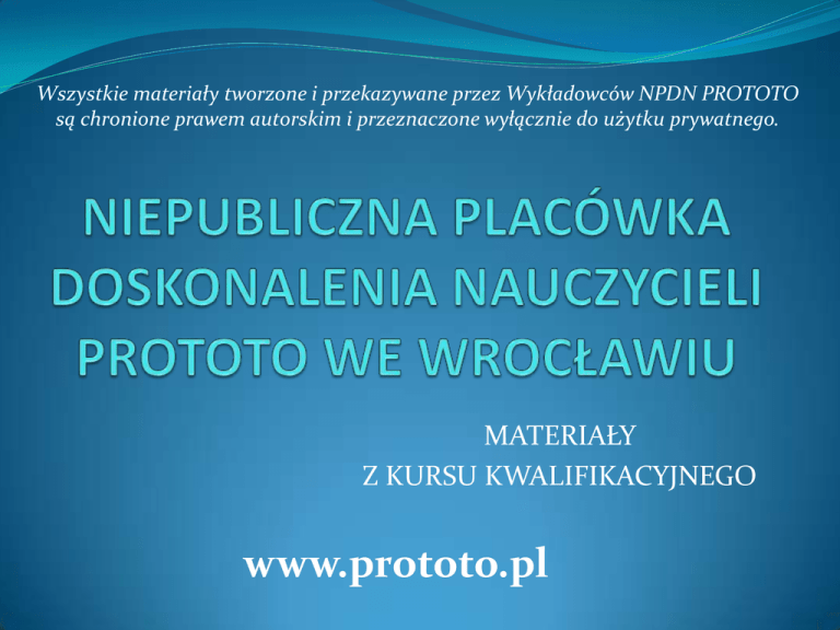 Wszystkie materiały tworzone i przekazywane przez Wykładowców NPDN PROTOTO są chronione prawem autorskim i przeznaczone wyłącznie do użytku prywatnego. MATERIAŁY Z KURSU KWALIFIKACYJNEGO www.prototo.pl PSYCHOLOGIA ROZWOJOWA WPROWADZENIE CZ. 1 Przedmiot i zadania psychologii rozwojowej Rozwój i istota zmian Metody badawcze Niepubliczna Placówka Doskonalenia Nauczycieli „PROTOTO” – J. Gadowicz PRZEDMIOT I ZADANIA PSYCHOLOGII ROZWOJOWEJ Niepubliczna Placówka Doskonalenia Nauczycieli „PROTOTO” – J. Gadowicz Psychologia rozwojowa - to dziedzina psychologii zajmująca się genezą zjawisk, funkcji i czynności psychicznych. Możemy wyróżnić psychologię Niepubliczna Placówka Doskonalenia Nauczycieli „PROTOTO” – J. Gadowicz filogenetyczną - rozwój gatunków bada pochodzenie i rozwój procesów psychicznych istot żywych od najprostszych organizmów aż do powstania człowieka psychologia antropogenetyczna – rozwój historyczny człowieka; psychologię ontogenetyczną - rozwój indywidualny człowieka w toku jego życia osobniczego - przedmiot zainteresowania psychologii rozwoju. CELEM PSYCHOLOGII ROZWOJOWEJ JEST: poznawanie, Niepubliczna Placówka Doskonalenia Nauczycieli „PROTOTO” – J. Gadowicz zrozumienie i przedstawianie procesu rozwoju człowieka w różnych okresach jego życia wskazywanie realnych możliwości kształtowania, doskonalenia, samodoskonalenia i przekształcania własnych „sił rozwojowych” człowieka ZWIĄZKI PSYCHOLOGII ROZWOJOWEJ Z INNYMI DZIAŁAMI PSYCHOLOGII: a) wychowawczą b) społeczną c) różnic indywidualnych d) kliniczną Niepubliczna Placówka Doskonalenia Nauczycieli „PROTOTO” – J. Gadowicz Rozwój - długotrwały i ukierunkowany proces zmian w procesach fizycznych i psychicznych zachodzących w ciągu całego życia, w którym można się organizmu pod różnym względem. Najważniejsze cechy rozwoju to: kierunkowość – zmiany konsekwentnie prowadzą do określonego stanu końcowego postępowość – każda kolejna faza odznacza się wyższością w stosunku do poprzedniej Niepubliczna Placówka Doskonalenia Nauczycieli „PROTOTO” – J. Gadowicz wyodrębnić kolejne etapy świadczące o różnicowaniu Cechy rozwoju psychicznego człowieka: Zmiany rozwojowe są nieustanne, ciągłe i dynamiczne ponieważ świat zewnętrzny i człowiek ciągle się zmienia, Zmiany rozwojowe w znacznym stopniu są zdeterminowane czynnikami środowiskowo – kulturowymi Niepubliczna Placówka Doskonalenia Nauczycieli „PROTOTO” – J. Gadowicz Istota rozwoju: ZMIANA - czyli uwzględnienie perspektywy czasowej; a obecnym danego obiektu zaobserwowana po upływie pewnego czasu. Jednak nie każda zmiana oznacza rozwój! Niepubliczna Placówka Doskonalenia Nauczycieli „PROTOTO” – J. Gadowicz Definicja zmiany: różnica między stanem poprzednim OBSZARY ZMIAN Poziom społeczny: zmiany relacji osoba – otoczenie. Poziom osobowościowy: zmiany osobowości. Poziom poznawczy: zmiany struktur umysłowych. Poziom behawioralny: zmiany zachowania. Niepubliczna Placówka Doskonalenia Nauczycieli „PROTOTO” – J. Gadowicz W ONTOGENEZIE CZŁOWIEKA WYRÓŻNIA SIĘ TRZY ETAPY: - prenatalny - postnatalny - perinatalny Niepubliczna Placówka Doskonalenia Nauczycieli „PROTOTO” – J. Gadowicz USYSTEMATYZOWANIE ROZWOJU GRECY Wiosna, czyli okres stawania się człowiekiem – 0 – 20 lat Lato, czyli człowiek młody – 20 – 40 lat Jesień, czyli człowiek w pełni dojrzały – 40 – 60 lat Zima, czyli człowiek stary, cofający się – 60 – 80 lat Niepubliczna Placówka Doskonalenia Nauczycieli „PROTOTO” – J. Gadowicz CHIŃCZYCY Młodość – do 20 lat Wiek zawierania małżeństw – do 30 lat Wiek poznawania własnych błędów – do 40 lat Wiek pełnienia urzędów społecznych – do 50 lat Końcowy okres twórczego życia – do 60 l. Wiek upragniony – do 70 lat Starość – od 70 lat PERIODYZACJA ROZWOJU Niepubliczna Placówka Doskonalenia Nauczycieli „PROTOTO” – J. Gadowicz 1. Okres prenatalny: 0-9 m.ż. -------- Narodziny-------2. Okres niemowlęcy: od narodzin do 1 r.ż. w tym okres noworodkowy: od narodzin do 1 m.ż. 3. Okres poniemowlęcy: od 1 r.ż. do 3 r.ż. 4. Wczesne dzieciństwo: 2- 3 r.ż. do 6- 7 r.ż. 5. Średnie dzieciństwo: 6- 7 r.ż. do 11- 12 r.ż. 6. Okres dorastania: 11- 12 r.ż. do 17- 20 r.ż. 7. Wczesna dorosłość: 17- 18- 20 r.ż. do 40 - 45 r.ż. 8. Średnia dorosłość: 40 - 45 r.ż. do 60 - 65 r.ż. 9. Późna dorosłość: 60 - 65 r.ż. do ---------------Śmierć--------- WSKAŹNIKIEM ROZWOJU ONTOGENETYCZNEGO CZŁOWIEKA SĄ: - zmiany ilościowe –wzrost danej cechy/zespołu cech - jakościowe dana funkcja lub czynność psychiczna nie tylko wzrasta i rozszerza swój zasięg lecz przekształca się w do nowego wyższego poziomu albo nowej właściwości Niepubliczna Placówka Doskonalenia Nauczycieli „PROTOTO” – J. Gadowicz somatycznych i psychicznych INNA KLASYFIKACJA ZMIAN - zmiany wielkości– charakter ilościowy - zmiany proporcji - charakter ilościowo –jakościowy - zmiany związane z zanikaniem starych właściwości - zmiany związane z nabywaniem nowych właściwości Niepubliczna Placówka Doskonalenia Nauczycieli „PROTOTO” – J. Gadowicz RODZAJE ZMIAN ROZWOJOWYCH: uniwersalne- zależne od wieku i występujące u każdego przedstawiciela wspólne - dla rozwijających się razem członków pewnej grupy, którą może stanowić albo określona kultura, albo pewne pokolenie należące do danej kultury; indywidualne - wywołane czynnikami oddziałującymi tylko na daną jednostkę. Niepubliczna Placówka Doskonalenia Nauczycieli „PROTOTO” – J. Gadowicz gatunku homo sapiens; CECHY ZMIAN ROZWOJOWYCH Tempo –szybkość z jaką dokonują się zmiany Rytm – stopień regularności zachodzenia zmian Cykle rozwoju. Fazy: progres, plateau, regres, kryzys itd. Niepubliczna Placówka Doskonalenia Nauczycieli „PROTOTO” – J. Gadowicz MODEL L