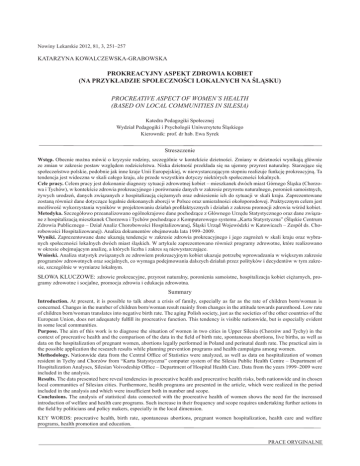 Nowiny Lekarskie 2012, 81, 3, 251–257 KATARZYNA KOWALCZEWSKA-GRABOWSKA PROKREACYJNY ASPEKT ZDROWIA KOBIET (NA PRZYKŁADZIE SPOŁECZNOŚCI LOKALNYCH NA ŚLĄSKU) PROCREATIVE ASPECT OF WOMEN’S HEALTH (BASED ON LOCAL COMMUNITIES IN SILESIA) Katedra Pedagogiki Społecznej Wydział Pedagogiki i Psychologii Uniwersytetu Śląskiego Kierownik: prof. dr hab. Ewa Syrek Streszczenie Wstęp. Obecnie można mówić o kryzysie rodziny, szczególnie w kontekście dzietności. Zmiany w dzietności wynikają głównie ze zmian w zakresie postaw względem rodzicielstwa. Niska dzietność przekłada się na ujemny przyrost naturalny. Starzejące się społeczeństwo polskie, podobnie jak inne kraje Unii Europejskiej, w niewystarczającym stopniu realizuje funkcję prokreacyjną. Ta tendencja jest widoczna w skali całego kraju, ale przede wszystkim dotyczy niektórych społeczności lokalnych. Cele pracy. Celem pracy jest dokonanie diagnozy sytuacji zdrowotnej kobiet – mieszkanek dwóch miast Górnego Śląska (Chorzowa i Tychów), w kontekście zdrowia prokreacyjnego i porównanie danych w zakresie przyrostu naturalnego, poronień samoistnych, żywych urodzeń, danych związanych z hospitalizacją ciężarnych oraz odniesienie ich do sytuacji w skali kraju. Zaprezentowane zostaną również dane dotyczące legalnie dokonanych aborcji w Polsce oraz umieralności okołoporodowej. Praktycznym celem jest możliwość wykorzystania wyników w projektowaniu działań profilaktycznych i działań z zakresu promocji zdrowia wśród kobiet. Metodyka. Szczegółowo przeanalizowano ogólnokrajowe dane pochodzące z Głównego Urzędu Statystycznego oraz dane związane z hospitalizacją mieszkanek Chorzowa i Tychów pochodzące z Komputerowego systemu „Karta Statystyczna” (Śląskie Centrum Zdrowia Publicznego – Dział Analiz Chorobowości Hospitalizowanej, Śląski Urząd Wojewódzki w Katowicach – Zespół ds. Chorobowości Hospitalizowanej). Analiza dokumentów obejmowała lata 1999–2009. Wyniki. Zaprezentowane dane ukazują tendencje w zakresie zdrowia prokreacyjnego i jego zagrożeń w skali kraju oraz wybranych społeczności lokalnych dwóch miast śląskich. W artykule zaprezentowano również programy zdrowotne, które realizowano w okresie obejmującym analizę, a których liczba i zakres są niewystarczające. Wnioski. Analiza statystyk związanych ze zdrowiem prokreacyjnym kobiet ukazuje potrzebę wprowadzania w większym zakresie programów zdrowotnych oraz socjalnych, co wymaga podejmowania dalszych działań przez polityków i decydentów w tym zakresie, szczególnie w wymiarze lokalnym. SŁOWA KLUCZOWE: zdrowie prokreacyjne, przyrost naturalny, poronienia samoistne, hospitalizacja kobiet ciężarnych, programy zdrowotne i socjalne, promocja zdrowia i edukacja zdrowotna. Summary Introduction. At present, it is possible to talk about a crisis of family, especially as far as the rate of children born/woman is concerned. Changes in the number of children born/woman result mainly from changes in the attitude towards parenthood. Low rate of children born/woman translates into negative birth rate. The aging Polish society, just as the societies of the other countries of the European Union, does not adequately fulfill its procreative function. This tendency is visible nationwide, but is especially evident in some local communities. Purpose. The aim of this work is to diagnose the situation of women in two cities in Upper Silesia (Chorzów and Tychy) in the context of procreative health and the comparison of the data in the field of birth rate, spontaneous abortions, live births, as well as data on the hospitalization of pregnant women, abortions legally performed in Poland and perinatal death rate. The practical aim is the possible application the research results while planning prevention programs and health campaigns among women. Methodology. Nationwide data from the Central Office of Statistics were analyzed, as well as data on hospitalization of women resident in Tychy and Chorzów from “Karta Statystyczna” computer system of the Silesia Public Health Centre – Department of Hospitalization Analyses, Silesian Voivodeship Office – Department of Hospital Health Care. Data from the years 1999–2009 were included in the analysis. Results. The data presented here reveal tendencies in procreative health and procreative health risks, both nationwide and in chosen local communities of Silesian cities. Furthermore, health programs are presented in the article, which were realized in the period included in the analysis and which were insufficient both in number and scope. Conclusions. The analysis of statistical data connected with the procreative health of women shows the need for the increased introduction of welfare and health care programs. Such increase in their frequency and scope requires undertaking further actions in the field by politicians and policy makers, especially in the local dimension. KEY WORDS: procreative health, birth rate, spontaneous abortions, pregnant women hospitalization, health care and welfare programs, health promotion and education. PRACE ORYGINALNE 252 Katarzyna Kowalczewska-Grabowska Wstęp W literaturze przedmiotu opisywane są dwa terminy: zdrowie seksualne oraz prokreacyjne. Zdrowie seksualne jest „integracją biologicznych, emocjonalnych, intelektualnych i społecznych aspektów życia seksualnego, ważnych dla pozytywnego rozwoju osobowości, komunikacji i miłości”[1]. Termin ten wprowadziła w 1975 roku Światowa Organizacja Zdrowia. Zdrowiem prokreacyjnym nazywany jest „stan pełnego dobrostanu (well – being) w aspekcie fizycznym, psychicznym i społecznym, a nie wyłącznie brak choroby lub niedomagań związanych z układem rozrodczym oraz jego funkcjami i procesami we wszystkich okresach życia”[1]. Zmiany polityczno-ekonomiczne i społeczne przebiegające w Polsce od 1989 roku wywierają ogromny wpływ na społeczeństwo polskie. Trud