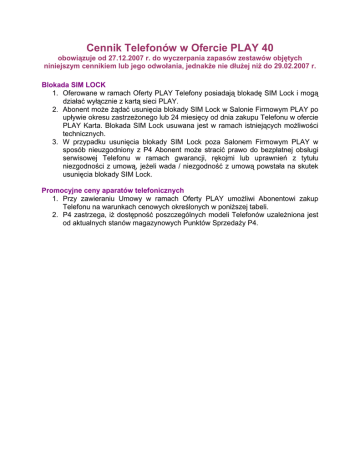Cennik Telefonów w Ofercie PLAY 40 obowiązuje od 27.12.2007 r. do wyczerpania zapasów zestawów objętych niniejszym cennikiem lub jego odwołania, jednakże nie dłużej niż do 29.02.2007 r. Blokada SIM LOCK 1. Oferowane w ramach Oferty PLAY Telefony posiadają blokadę SIM Lock i mogą działać wyłącznie z kartą sieci PLAY. 2. Abonent może żądać usunięcia blokady SIM Lock w Salonie Firmowym PLAY po upływie okresu zastrzeżonego lub 24 miesięcy od dnia zakupu Telefonu w ofercie PLAY Karta. Blokada SIM Lock usuwana jest w ramach istniejących możliwości technicznych. 3. W przypadku usunięcia blokady SIM Lock poza Salonem Firmowym PLAY w sposób nieuzgodniony z P4 Abonent może stracić prawo do bezpłatnej obsługi serwisowej Telefonu w ramach gwarancji, rękojmi lub uprawnień z tytułu niezgodności z umową, jeżeli wada / niezgodność z umową powstała na skutek usunięcia blokady SIM Lock. Promocyjne ceny aparatów telefonicznych 1. Przy zawieraniu Umowy w ramach Oferty PLAY umożliwi Abonentowi zakup Telefonu na warunkach cenowych określonych w poniższej tabeli. 2. P4 zastrzega, iż dostępność poszczególnych modeli Telefonów uzależniona jest od aktualnych stanów magazynowych Punktów Sprzedaży P4. Producent LGElectronics Model PLAY Abonament przy zawarciuumowy na czas określony - 24 miesiące KU250 wraz z kartą pamięci 512MB KU311 wraz z kartą pamięci 512MB KU990 wraz z kartąpamięci 1GB K3 wrazz kartą pamięci 1GB V3xx Motorola wrazz kartą pamięci 1GB i zestawem słuchawkowymBluetooth HT820 V6 maxx Nokia Samsung SonyEricsson Toshiba wrazz kartą pamięci 1GB Z8 wraz z kartą pamięci 512MB 6151 wraz z kartą pamięci 512MB 6288 wraz z kartą pamięci 512MB E90 wraz z kartą pamięci 512MB E51 wrazz kartą pamięci 1GB N76 wrazz kartą pamięci 1GB F500 wrazz kartą pamięci 1GB J400 SGH - L760 wrazz kartą pamięci 1GB SGH-U700 wrazz kartą pamięci 1GB SGH - Z170 wraz z kartą pamięci 512MB SGH-Z370 wraz z kartą pamięci 512MB SGH-Z630 wraz z kartą pamięci 512MB SGH-i600 wrazz kartą pamięci 1GB K800i wrazz kartą pamięci 1GB P1 wrazz kartą pamięci 1GB K530i wrazz kartą pamięci 1GB W880i wrazz kartą pamięci 1GB G500 TS705 Opłata za telefony podana jest w złotych i zawiera podatek VAT. Oferta telefonów o ograniczonej dostępności: 0,03 PLN 29PLN 1299 PLN 279 PLN 499 PLN 349 PLN 899 PN 0,03 PLN 299 PLN 2399 PLN 599 PLN 1399 PLN 1169 PLN 99PLN 29PLN 549 PLN 0,03 PLN 0,03 PLN 279 PLN 899 PLN 349 PLN 1299 PLN 119 PLN 199 PLN 349 PLN 0,03 PLN PLAY Abonament Producent Model przy zawarciu umowy na czas określony - 24 miesiące 40 LG Electronics Nokia Samsung KU800 wraz z kartą pamięci 512MB N73 music edition wraz z kartą pamięci 2GB SGH-Z400 wraz z kartą pamięci 1GB Opłata za telefony podana jest w złotych i zawiera podatek VAT. 0,03 PLN 1 299 PLN 79 PLN