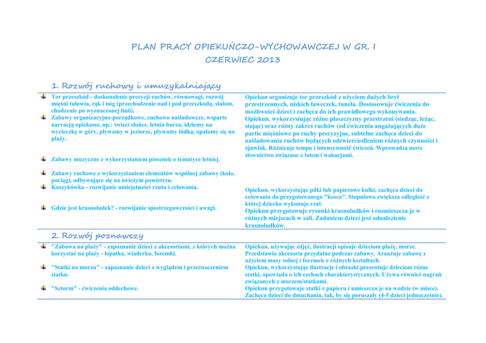PLAN PRACY OPIEKUŃCZO-WYCHOWAWCZEJ W GR. I CZERWIEC 2013 1. Rozwój ruchowy i umuzykalniający Tor przeszkód - doskonalenie precyzji ruchów, równowagi, rozwój mięśni tułowia, rąk i nóg (przechodzenie nad i pod przeszkodą, slalom, chodzenie po wyznaczonej linii). Zabawy organizacyjno-porządkowe, ruchowo naśladowcze, wsparte narracją opiekuna, np.: świeci słońce, letnia burza, idziemy na wycieczkę w góry, pływamy w jeziorze, pływamy łódką, opalamy się na plaży. Zabawy muzyczne z wykorzystaniem piosenek o tematyce letniej. Zabawy ruchowe z wykorzystaniem elementów wspólnej zabawy (koło, pociąg), odbywające się na świeżym powietrzu. Koszykówka - rozwijanie umiejętności rzutu i celowania. Gdzie jest krasnoludek? - rozwijanie spostrzegawczości i uwagi. Opiekun organizuje tor przeszkód z użyciem dużych brył przestrzennych, niskich ławeczek, tunelu. Dostosowuje ćwiczenia do możliwości dzieci i zachęca do ich prawidłowego wykonywania. Opiekun, wykorzystując różne płaszczyzny przestrzeni (siedząc, leżąc, stojąc) oraz różny zakres ruchów (od ćwiczenia angażujących duże partie mięśniowe po ruchy precyzyjne, subtelne zachęca dzieci do naśladowania ruchów będących odzwierciedleniem różnych czynności i zjawisk. Różnicuje tempo i intensywność ćwiczeń. Wprowadza nowe słownictwo związane z latem i wakacjami. Opiekun, wykorzystując piłki lub papierowe kulki, zachęca dzieci do celowania do przygotowanego "kosza". Stopniowo zwiększa odległość z której dziecko wykonuje rzut. Opiekun przygotowuje rysunki krasnoludków i rozmieszcza je w różnych miejscach w sali. Zadaniem dzieci jest odnalezienie krasnoludków. 2. Rozwój poznawczy "Zabawa na plaży" - zapoznanie dzieci z akcesoriami, z których można korzystać na plaży - łopatka, wiaderko, foremki. "Statki na morzu" - zapoznanie dzieci z wyglądem i przeznaczeniem statku. "Sztorm" - ćwiczenia oddechowe. Opiekun, używając zdjęć, ilustracji opisuje dzieciom plażę, morze. Przedstawia akcesoria przydatne podczas zabawy. Aranżuje zabawę z użyciem masy solnej i foremek o różnych kształtach. Opiekun, wykorzystując ilustracje i obrazki prezentuje dzieciom różne statki, opowiada o ich cechach charakterystycznych. Używa również nagrań związanych z morzem/statkami. Opiekun przygotowuje statki z papieru i umieszcza je na wodzie (w misce). Zachęca dzieci do dmuchania, tak, by się poruszały (4-5 dzieci jednocześnie). "Morskie stworzenia" - ryba, rak, żółw, foka - przedstawienie dzieciom zwierząt morskich. "Kózka Zuzka" - zapoznanie dzieci z wierszem H. Ożogowskiej teatrzyk. Opiekun, wykorzystując dostępne pomoce - wiersze, piosenki, obrazki, każdego dnia tygodnia prezentuje dzieciom jedno zwierze. Opisuje jego wygląd, sposób poruszania się. Opiekun prezentuje teatrzyk sylwet/korzysta z flanelografu, przedstawiając treść wiersza. Omawia postacie, które w nim występują oraz sytuacje, które miały w nim miejsce. 3. Zabawy manipulacyjno-konstrukcyjne "Co znajdziemy nad morzem" - rozwijanie zmysłu dotyku. "Jedno dla mnie, jedno dla Ciebie" - ćwiczenie koordynacji ruchowej i precyzji ruchów rąk. Klocki miękkie, twarde, o zróżnicowanej wielkości i strukturze rozwijanie myślenia i koncentracji uwagi poprzez różnicowanie tematów – budowanie wież, mostów, domków, pociągów. Puzzle i układanki – stymulowanie procesów spostrzegania, analizy i syntezy wzrokowej, uwagi oraz koordynacji wzrokowo-ruchowej. Opiekun przygotowuje pojemnik wypełniony piaskiem/kaszą manną, w której umieszcza muszelki/kamyki/drobne przedmioty. Zachęca dzieci do poszukiwania przedmiotów rączkami. Opiekun przygotowuje 2 małe pojemniki/słoiczki, do których dziecko wrzuca naprzemiennie niewielkie przedmioty (guziki, kulki). Dla starszych dzieci można wprowadzić dzielenie przedmiotów na kolory (np. czerwony i żółty). Opiekunka towarzyszy dziecku podczas zabawy na dywanie, nakierowuje dziecko na budowanie określonego typu budowli, wspomaga dziecko i opisuje werbalnie przebieg zabawy. Opiekunka umożliwia swobodną manipulację zabawką, modeluje prawidłową zabawę. Stawia przed dzieckiem zadania wymagające wykorzystanie ruchów precyzyjnych, złożenia części w całość. 4. Usprawnianie samoobsługi / rozwój społeczny Doskonalenie nawyku wspólnej, zgodnej zabawy – zaangażowanie w zabawy grupowe, zwracanie uwagi na innych uczestników zabawy, prawidłowe i bezpieczne korzystanie z zabawek. Doskonalenie umiejętności prawidłowego reagowania na polecenia i prośby opiekuna. Doskonalenie umiejętności bezpiecznej zabawy na świeżym powietrzu. Kontynuacja wspomagania nauki samodzielności w piciu-z kubka, posługiwaniu się łyżką. Opiekunka zachęca dzieci do wspólnej zabawy i skupienia się na zabawach angażujących grupę. Prowadzi zabawy w sposób atrakcyjny, wesoły, przyciągający uwagę dziecka i zachęcający do udziału w niej. Opiekunka podczas zabaw swobodnych zwraca szczególną uwagę na sposób zabawy dziecka, modeluje prawidłowe używanie zabawki i zachęca do ich używania w sposób bardziej prawidłowy i celowy. Opiekunka pomaga przy jedzeniu i piciu, daje możliwość samodzielnych prób podczas posiłków. Opracowanie: Beata Chojnacka – psycholog, Grażyna Dudzińska, opiekun, Żłobek nr 1
