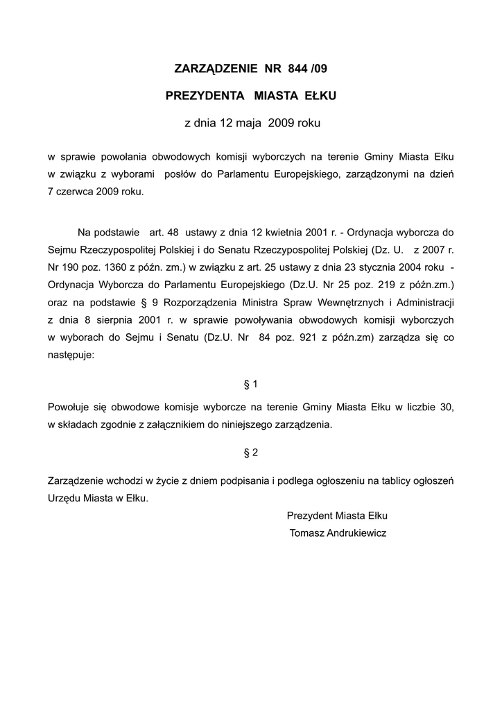 ZARZĄDZENIE NR 844 /09 PREZYDENTA MIASTA EŁKU z dnia 12 maja 2009 roku w sprawie powołania obwodowych komisji wyborczych na terenie Gminy Miasta Ełku w związku z wyborami posłów do Parlamentu Europejskiego, zarządzonymi na dzień 7 czerwca 2009 roku. Na podstawie art. 48 ustawy z dnia 12 kwietnia 2001 r. - Ordynacja wyborcza do Sejmu Rzeczypospolitej Polskiej i do Senatu Rzeczypospolitej Polskiej (Dz. U. z 2007 r. Nr 190 poz. 1360 z późn. zm.) w związku z art. 25 ustawy z dnia 23 stycznia 2004 roku Ordynacja Wyborcza do Parlamentu Europejskiego (Dz.U. Nr 25 poz. 219 z późn.zm.) oraz na podstawie § 9 Rozporządzenia Ministra Spraw Wewnętrznych i Administracji z dnia 8 sierpnia 2001 r. w sprawie powoływania obwodowych komisji wyborczych w wyborach do Sejmu i Senatu (Dz.U. Nr 84 poz. 921 z późn.zm) zarządza się co następuje: §1 Powołuje się obwodowe komisje wyborcze na terenie Gminy Miasta Ełku w liczbie 30, w składach zgodnie z załącznikiem do niniejszego zarządzenia. §2 Zarządzenie wchodzi w życie z dniem podpisania i podlega ogłoszeniu na tablicy ogłoszeń Urzędu Miasta w Ełku. Prezydent Miasta Ełku Tomasz Andrukiewicz Załącznik do Zarządzenia Nr 844/09 Prezydenta Miasta Ełku z dnia 12 maja 2009 roku Składy obwodowych komisji wyborczych na terenie Gminy Miasta Ełku w wyborach posłów do Parlamentu Europejskiego wyznaczonych na dzień 7 czerwca 2009 roku Obwodowa Komisja Wyborcza Nr 1 z siedzibą w Specjalnym Ośrodku Szkolno-Wychowawczym, ul. Grajewska 16A 1. Magdalena Puciłowska 2. Adam Ramotowski 3. Katarzyna Chmielewska 4. Henryk Kalinowski 5. Karol Kwiatkowski 6. Agnieszka Olechnowicz 7. Grzegorz Czerepko 8. Urszula Samocik 9. Daniel Rogowski 10. Elżbieta Komar 11. Zbigniew Dąbrowski Obwodowa Komisja Wyborcza Nr 2 z siedzibą w Szkole Podstawowej Nr 5, ul. Popiełuszki 6 1. Sławomir Kalisz 2. Piotr Górski 3. Krzysztof Mścichowski 4. Jan Brzoziewski 5. Adam Łukaszewicz 6. Marta Galicka 7. Agata Sokołowska 8. Zdzisław Banachowski 9. Teresa Mączak 10. Maria Witanowska Obwodowa Komisja Wyborcza Nr 3 z siedzibą w Szkole Podstawowej Nr 5, ul. Popiełuszki 6 1. Tadeusz Korsak 2. Dominika Reja 3. Piotr Jaczyński 4. Wojciech Szewczyk 5. Dariusz Święciński 6. Iwona Chmiel 7. Jakub Nowikowski 8. Piotr Penkiewicz 9. Stanisław Puciłowski 10. Monika Karwowska 11. Wioletta Pawluczyk Obwodowa Komisja Wyborcza Nr 4 z siedzibą w Szkole Podstawowej Nr 7, ul. Kilińskiego 48 1. Andrzej Krych 2. Janusz Kłosek 3. Jolanta Dulęba 4. Kamil Galiński 5. Daniel Piotr Kryłowicz 6. Paweł Andruszkiewicz 7. Brygida Duchnowska 8. Anna Wanielewska 9. Małgorzata Sobolewska 10. Ewa Stanisława Foltyńska 11. Barbara Klejps Obwodowa Komisja Wyborcza Nr 5 z siedzibą w Szkole Podstawowej Nr 7, ul. Kilińskiego 48 1. Elżbieta Puciłowska 2. Ewa Cudnoch-Ramotowska 3. Katarzyna Kupka 4. Danuta Kalinowska 5. Lucyna Kruszyńska 6. Iwona Anna Ożarek 7. Marta Kuczyńska 8. Emilia Wasilewska 9. Renata Lach 10. Beata Odolecka 11. Paweł Górski Obwodowa Komisja Wyborcza Nr 6 z siedzibą w Zespole Szkół Nr 3, ul. Koszykowa 1 1. Joanna Agnieszka Kalisz 2. Joanna Gowgiel 3. Elżbieta Diana Kruszko 4. Anna Dolistowska 5. Jakub Kwiatkowski 6. Maria Teresa Milewska 7. Magda Akielewicz 8. Renata Skowrońska 9. Julita Odolecka 10. Barbara Dąbrowska Obwodowa Komisja Wyborcza Nr 7 z siedzibą w Świetlicy Międzyzakładowej Spółdzielni Mieszkaniowej, ul. Kilińskiego 40 1. Jadwiga Gorlo 2. Krystyna Kapuścińska 3. Mariusz Rowek 4. Natalia Gietek 5. Justyna Kwiatkowska 6. Joanna Sałek 7. Barbara Karpińska 8. Joanna Zawistowska 9. Radosław Radziewicz 10. Ilona Sondej Obwodowa Komisja Wyborcza Nr 8 z siedzibą w Zespole Szkół Samorządowych, ul. Suwalska 15 1. Celina Korsak 2. Ewa Babińska 3. Elżbieta Szmurło 4. Eugenia Dębkowska 5. Joanna Frankiewicz 6. Katarzyna Jarząbek 7. Bożena Nowikowska 8. Sylwia Kozłowska 9. Bratysław Daniun 10. Janina Daniun 11. Marta Herbszt Obwodowa Komisja Wyborcza Nr 9 z siedzibą w Powiatowym Urzędzie Pracy, ul. Suwalska 38 1. Anna Małgorzata Rehle 2. Andrzej Matysiak 3. Krzysztof Kowalko 4. Aleksandra Szelążek 5. Wioleta Grabowska 6. Jan Soroko 7. Grażyna Szematowicz 8. Wojciech Kozłowski 9. Ewa Rencewicz 10. Marek Ostrowski 11. Kamil Pietrulewicz Obwodowa Komisja Wyborcza Nr 10 z siedzibą w Gimnazjum Nr 3, ul. Piwnika Ponurego 1 1. Jolanta Gutowska 2. Anna Żabińska 3. Leonida Biczyk 4. Agnieszka Szulińska 5. Emilia Szorc 6. Emilia Tarabuła 7. Mariusz Młodzianowski 8. Marek Dobosz 9. Adrianna Nitkowska 10. Jarosław Bartoszewicz Obwodowa Komisja Wyborcza Nr 11 z siedzibą w Szkole Podstawowej Nr 9, ul. Piwnika Ponurego 1 1. Grażyna Krysiuk 2. Witold Zaniewski 3. Anna Zdanowicz 4. Joanna Izabela Wocial 5. Arkadiusz Osiecki 6. Dariusz Mrówka 7. Karol Młodzianowski 8. Dariusz Pyczkowski 9. Barbara Urbanek Obwodowa Komisja Wyborcza Nr 12 z siedzibą w Szkole Policealnej, ul. K. A. Bahrkego 2B 1. Iwona Ewa Cybul 2. Cezary Mariusz Rytelewski 3. Małgorzata Piktel 4. Marta Ciurzyńska 5. Marianna Lesiewicz 6. Katarzyna Olszewska 7. Barbara Kulesza 8. Dawid Maciorowski 9. Danuta Dzierżyk 10. Cezary Domitrz Obwodowa Komisja Wyborcza Nr 13 z siedzibą w Zespole Szkół Nr 5, ul. Sikorskiego 5 1. Anastazja Górniak 2. Jarosław Kruszko 3. Halina Perzanowska 4. Jerzy Chorąży 5. Regina Przekop 6. Wacława Olszewska 7. Małgorzata Kacprzyk 8. Emilia Kalinowska 9. Barbara Gawronik 10. Katarzyna Kurczewska Obwodowa Komisja Wyborcza Nr 14 z siedzibą w Szkole Podstawowej Nr 3, ul. Grodzieńska 1 1. Halina Romanowska 2. Wanda Gawrysiak 3. Ewelina Ciach 4. Iwona Zalewska 5. Anna Jaśkiewicz 6. Wioletta Katarzyna Łapińska 7. Emil Kalinowski 8. Małgorzata Łask 9. Roman Gorczyca Obwodowa Komisja Wyborcza Nr 15 z siedzibą w Zespole Szkół Nr 6, ul. Kajki 4 1. Henryk Klimko 2. Małgorzata Kruszko 3. Iwona Duńkowska 4. Stanisław Grygo 5. Jacek Krupski 6. Marek Sabasiński 7. Alicja Jagielska 8. Agnieszka Januszewska 9. Ewe
