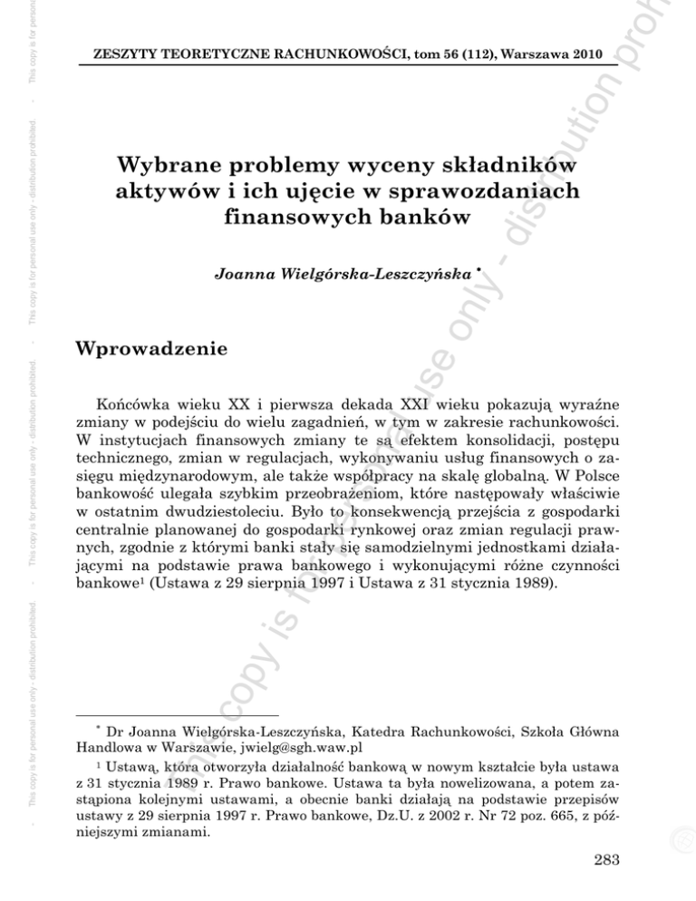 ibu tio np roh This copy is for person - on ly - dis tr Wybrane problemy wyceny składników aktywów i ich ujęcie w sprawozdaniach finansowych banków Joanna Wielgórska-Leszczyńska lu se Wprowadzenie is c op y is for pe rso na Końcówka wieku XX i pierwsza dekada XXI wieku pokazują wyraźne zmiany w podejściu do wielu zagadnień, w tym w zakresie rachunkowości. W instytucjach finansowych zmiany te są efektem konsolidacji, postępu technicznego, zmian w regulacjach, wykonywaniu usług finansowych o zasięgu międzynarodowym, ale także współpracy na skalę globalną. W Polsce bankowość ulegała szybkim przeobrażeniom, które następowały właściwie w ostatnim dwudziestoleciu. Było to konsekwencją przejścia z gospodarki centralnie planowanej do gospodarki rynkowej oraz zmian regulacji prawnych, zgodnie z którymi banki stały się samodzielnymi jednostkami działającymi na podstawie prawa bankowego i wykonującymi różne czynności bankowe1 (Ustawa z 29 sierpnia 1997 i Ustawa z 31 stycznia 1989). Dr Joanna Wielgórska-Leszczyńska, Katedra Rachunkowości, Szkoła Główna Handlowa w Warszawie, [email protected] 1 Ustawą, która otworzyła działalność bankową w nowym kształcie była ustawa z 31 stycznia 1989 r. Prawo bankowe. Ustawa ta była nowelizowana, a potem zastąpiona kolejnymi ustawami, a obecnie banki działają na podstawie przepisów ustawy z 29 sierpnia 1997 r. Prawo bankowe, Dz.U. z 2002 r. Nr 72 poz. 665, z późniejszymi zmianami. Th This copy is for personal use only - distribution prohibited. - This copy is for personal use only - distribution prohibited. - This copy is for personal use only - distribution prohibited. - ZESZYTY TEORETYCZNE RACHUNKOWOŚCI, tom 56 (112), Warszawa 2010 283 ibu tio np roh dis tr on ly - This copy is for person - lu se 1. Informacje dostarczane przez rachunkowość y is for pe rso na Rachunkowość udostępnia szczegółową i wszechstronną informację o działalności jednostki gospodarczej. Informacja ta jest bardzo specyficzna, pod względem formy i treści. Znajomość rachunkowości pozwala jednak na określenie związków z innymi kategoriami ekonomicznymi, a także na racjonalne uporządkowanie wiedzy, czyli materiału informacyjnego o działalności wykonywanej przez daną jednostkę. Nie można wszakże patrzeć na te dane tylko z punktu widzenia teoretycznego, należy to czynić również pod kątem praktyki, czyli ich użyteczności dla interesariuszy (którymi w bankach są przede wszystkim depozytariusze, kredytobiorcy, akcjonariusze, organy regulacyjne) przy podejmowaniu decyzji. Rachunkowość ujmuje w księgach rachunkowych, a następnie ujawnia w sprawozdaniach finansowych, dane is c op 2 Na początku jednak banki stosowały przepisy zarządzenia Prezesa Narodowego Banku Polskiego z dnia 10 lutego 1983 r. w sprawie jednolitych zasad rachunkowości bankowej. Przepisy te zastąpiono dopiero od 1 stycznia 1991 r. także zarządzeniem Prezesa Narodowego Banku Polskiego w sprawie jednolitych zasad rachunkowości bankowej. Te dwa zarządzenia wydano na podstawie delegacji z ustawy o Narodowym Banku Polskim. Następne zmiany zostały wprowadzone również zarządzeniem Prezesa Narodowego Banku Polskiego w sprawie szczególnych zasad rachunkowości banków i sporządzania informacji dodatkowej, wydanym na podstawie delegacji z ustawy o rachunkowości, która po kolejnych nowelizacjach przekazała prawo do wydawania aktów wykonawczych dotyczących szczególnych zasad rachunkowości banków z rąk prezesa NBP w ręce ministra właściwego do spraw finansów publicznych. Obecnie obowiązuje Rozporządzenie Ministra Finansów z 29 sierpnia 2008 r. w sprawie szczególnych zasad rachunkowości banków. Th This copy is for personal use only - distribution prohibited. - This copy is for personal use only - distribution prohibited. - This copy is for personal use only - distribution prohibited. W ślad za zmianami w zakresie wykonywania czynności bankowych zmieniały się regulacje dotyczące prowadzenia rachunkowości banku2 (Zarządzenie, 1983, Zarządzenie 1991, Zarządzenie 1995, Rozporządzenie 2008). Celem opracowania jest zaprezentowanie wybranych kwestii dotyczących wyceny niektórych składników aktywów oraz wykazywania ich w sprawozdaniach finansowych banków na podstawie przeprowadzonej analizy sprawozdań finansowych banków, a ponadto wskazanie na potrzebę modyfikacji w najbliższej perspektywie informacji wykazywanych przez banki. Mając na uwadze wymagania MSSF dotyczące ujawnień, należy zwrócić uwagę na szczególne znaczenie jasności i przejrzystości udostępnianych informacji w każdych warunkach, zwłaszcza w czasie kryzysu na rynkach finansowych. Przyjęte w opracowaniu metody badawcze opierają się na studiach literaturowych, przeglądzie aktów prawnych, analizie sprawozdań finansowych banków oraz wnioskowaniu. 284 ibu tio np roh dis tr on ly - se lu na rso pe for y is op is c Th This copy is for person This copy is for personal use only - distribution prohibited. This copy is for personal use only - distribution prohibited. This copy is for personal use only - distribution prohibited. - liczbowe o stanie składników aktywów i źródłach ich finansowania, strumieniach przepływów oraz uzyskanych korzyściach i poniesionych kosztach. Te dane są uzupełniane informacjami opisowymi. Pokazują one stan i strukturę majątku na ściśle określony moment czasowy lub za odpowiedni okres. Z punktu widzenia odbiorców informacji finansowej o działalności banku, niezmiernie ważne są dane o należnościach i depozytach oraz kapitale własnym, gdyż to one decydują o kondycji finansowej i płynności banku. Mając na uwadze fakt, że rachunkowość banku pozwala na dostarczenie danych o działalności banku w postaci sprawozdań finansowych, przeprowadzono analizę sprawozdań dwunastu banków (wymienionych w tabeli 1), których akcje są notowane na Giełdzie Papierów Wartościow