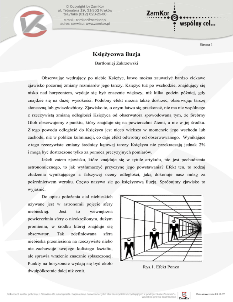 Strona 1 KsięŜycowa iluzja Bartłomiej Zakrzewski Obserwując wędrujący po niebie KsięŜyc, łatwo moŜna zauwaŜyć bardzo ciekawe zjawisko pozornej zmiany rozmiarów jego tarczy. KsięŜyc tuŜ po wschodzie, znajdujący się nisko nad horyzontem, wydaje się być znacznie większy, niŜ kilka godzin później, gdy znajdzie się na duŜej wysokości. Podobny efekt moŜna takŜe dostrzec, obserwując tarczę słoneczną lub gwiazdozbiory. Zjawisko to, o czym łatwo się przekonać, nie ma nic wspólnego z rzeczywistą zmianą odległości KsięŜyca od obserwatora spowodowaną tym, Ŝe Srebrny Glob obserwujemy z punktu, który znajduje się na powierzchni Ziemi, a nie w jej środku. Z tego powodu odległość do KsięŜyca jest nieco większa w momencie jego wschodu lub zachodu, niŜ w pobliŜu kulminacji, co daje efekt odwrotny od obserwowanego. Wynikające z tego rzeczywiste zmiany średnicy kątowej tarczy KsięŜyca nie przekraczają jednak 2% i mogą być dostrzeŜone tylko za pomocą precyzyjnych pomiarów. JeŜeli zatem zjawisko, które znajduje się w tytule artykułu, nie jest pochodzenia astronomicznego, to jak wytłumaczyć przyczynę jego powstawania? Efekt ten, to rodzaj złudzenia wynikającego z fałszywej oceny odległości, jaką dokonuje nasz mózg za pośrednictwem wzroku. Często nazywa się go księŜycową iluzją. Spróbujmy zjawisko to wyjaśnić. Do opisu połoŜenia ciał niebieskich uŜywane jest w astronomii pojęcie sfery niebieskiej. Jest to wewnętrzna powierzchnia sfery o nieokreślonym, duŜym promieniu, w środku której znajduje się obserwator. Tak zdefiniowana sfera niebieska przeniesiona na rzeczywiste niebo nie zachowuje swojego kulistego kształtu, ale sprawia wraŜenie znacznie spłaszczonej. Punkty na horyzoncie wydają się być około Rys.1. Efekt Ponzo dwuipółkrotnie dalej niŜ zenit. Data utworzenia:03.10.07 Strona 2 MoŜna powiedzieć, Ŝe mózg zastępuje sferyczną czaszę powierzchnią, przypominającą odwróconą miskę. KsięŜyc, a takŜe Słońce i gwiazdozbiory, są obserwowane na takim właśnie zdeformowanym sklepieniu niebieskim. W celu wyjaśnienia efektu księŜycowej iluzji moŜna posłuŜyć się tzw. złudzeniem Ponzo, w wyniku którego przedmioty bardziej odległe są subiektywnie dostrzegane jako większe. Efekt ten ilustruje rys. 1, na którym spośród trzech jednakowych figurek największa wydaje się ta, która stoi najgłębiej w tunelu. Podobnie jest w przypadku KsięŜyca. Spłaszczony kształt sklepienia niebieskiego umieszcza tarczę KsięŜyca w (pozornie) róŜnych odległościach, a złudzenie Ponzo powoduje, Ŝe tarcza Srebrnego Globu wydaje się tym większa, im znajduje się niŜej nad horyzontem. Efekt ten staje się wyraźniejszy, gdy w pobliŜu tarczy KsięŜyca moŜemy dostrzec odległe drzewa lub budynki. Aby przekonać się, Ŝe opisany efekt jest tylko złudzeniem, wystarczy znaleźć łatwy sposób na oszacowanie rozmiarów kątowych KsięŜyca. Średnia kątowa jego tarczy wynosi około 0,5 stopnia, co jest w przybliŜeniu równe połowie szerokości końcówki małego palca oglądanego przy wyciągniętej ręce (rys. 2.). Porównując te rozmiary ze średnicą KsięŜyca, znajdującego się Rys.2. Prosty sposób oceny rozmiarów kątowych tarczy KsięŜyca. na róŜnych wysokościach nad horyzontem, bardzo łatwo moŜna się o tym przekonać. Dysponując aparatem fotograficznym, moŜna wykonać zdjęcia KsięŜyca na róŜnych wysokościach i na nich porównywać rozmiary tarczy Srebrnego Globu (rys. 3.). Data utworzenia:03.10.07 Strona 3 Rys. 3. Fotograficzne obserwacje KsięŜyca eliminują efekt Ponzo. Źródło: NASA Credit & Copyright: Shay Stephens Data utworzenia:03.10.07