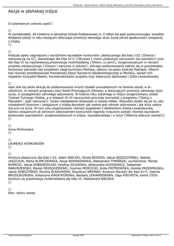 Płońszczak - Gazeta lokalna - Płońsk, Raciąż, Baboszewo, Czerwińsk, Dzierzążnia, Joniec, Naruszewo Akcja w płońskiej trójce O szlachetnym zdrowiu apel W poniedziałek, 26 kwietnia w płońskiej Szkole Podstawowej nr 3 odbył się apel podsumowujący wszelkie działania szkoły w roku bieżącym dotyczące promocji zdrowego stylu życia wśród społeczności związanej z trójką. Podczas apelu nagrodzono i wyróżniono laureatów konkursów: plastycznego dla klas I-III Owoce i warzywa są na 5, literackiego dla klas IV-V Wywiad z moim ulubionym warzywem lub owocem oraz dla klas VI na najciekawszą prezentację multimedialną Wiem, co jem, zorganizowanych w ramach projektu edukacyjnego Owoce i warzywa w szkole, którego podsumowanie odbyło się w poniedziałek. Honorowy patronat nad projektem objął burmistrz Płońska, obecny na apelu Andrzej Pietrasik. Obecni byli również przedstawiciele Powiatowej Stacji Sanitarno-Epidemiologicznej w Płońsku, wśród nich inspektor Krzysztof Bielski. Koordynatorkami projektu były Katarzyna Jatkowska i Zofia Lewandowska. Apel stał się także okazją do podsumowania innych działań prowadzonych na terenie szkoły w br. szkolnym, w ramach programu sieci Szkół Promujących Zdrowie, a dotyczących promocji zdrowego stylu życia, w szczególności zdrowego odżywiania. W trakcie roku szkolnego w trójce zorganizowany został Tydzień Żytniego Chleba, a w klasach IV-VI nauczyciele przyrody korzystali z programu Gotuj z Pascalem - jedz warzywa. Dzieci nieodpłatnie dostawały w szkole mleko. Wszystko działo się po to, aby uświadomić dzieciom i związanym z trójką dorosłym jak ważne jest zdrowe odżywianie i jak duży wpływ ma ono na życie. W tym celu organizowano również pogadanki z dietetykiem Anetą Lewandowską. Oprócz związanych ze zdrowym odżywianiem konkursów nagrody wręczone zostały również laureatom konkursów poprzednich, przeprowadzonych w trójce: recytatorskiego i o tytuł Mistrza dobrych manier. Anna Piórkowska LAUREACI KONKURSÓW Konkurs plastyczny dla klas I-III: Adam BIELSKI, Nicola BOSZKO, Jakub GOSZCZYŃSKI, Natalia JASZCZUR, Marta KLIMCZEWSKA, Alicja NOWAKOWSKA, Aleksandra TYMIŃSKA; wyróżnienia: Michał BURECKI, Jakub DOBROSIELSKI, Ewelina GILEWSKA, Aleksandra KŁOSIEWICZ, Sebastian MARUSZEWSKI, Maciej MIODUSZEWSKI, Szymon MOŚCICKI, Anita PIOTROWSKA, Kamila PRZEDPEŁSKA, Jakub SOBCZYŃSKI, Paulina ŚLADOWSKA, Klaudiusz WRONKA. Konkurs literacki dla klas IV-V: Joanna BRUDZIKOWSKA, Katarzyna KWIATKOWSKA, Barbara LEWANDOWSKA, Olga PIECHOTA, Kamil ZYCH. Konkurs na prezentację multimedialną dla klas VI: Aleksandra BIELSKA. foto: zbiory szkoły http://www.plonszczak.pl Kreator PDF Utworzono 4 March, 2017, 03:12