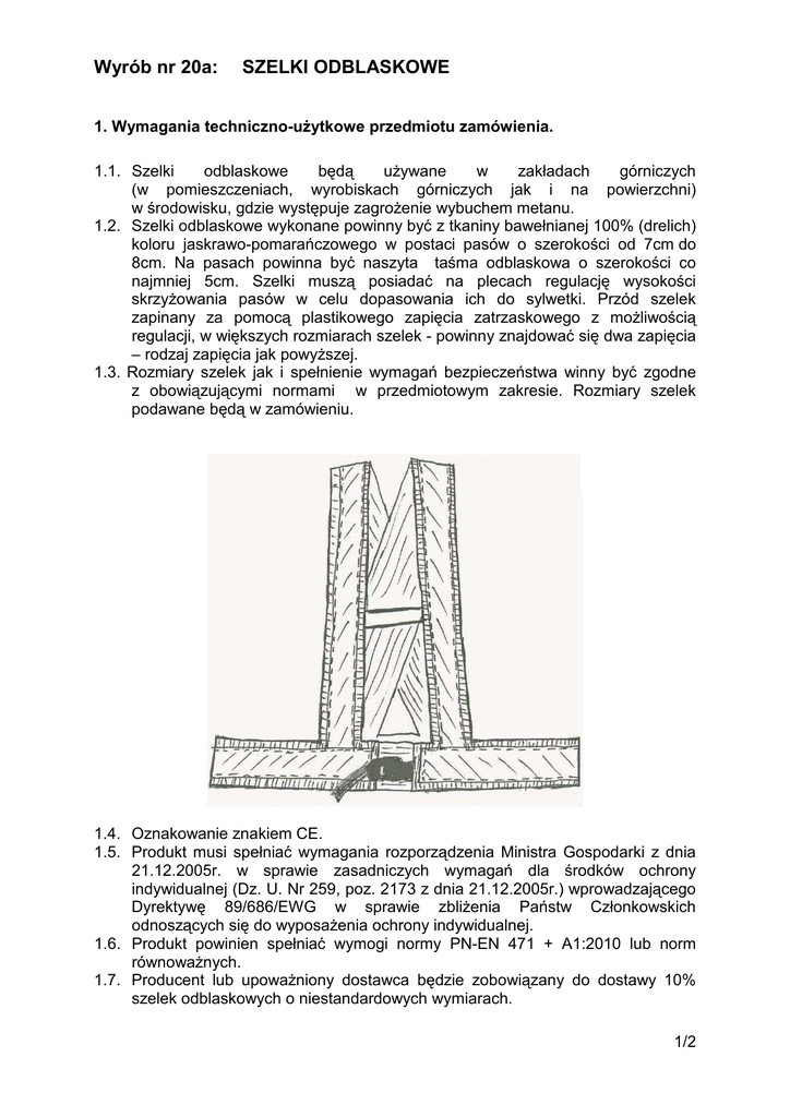 Wyrób nr 20a: SZELKI ODBLASKOWE 1. Wymagania techniczno-uŜytkowe przedmiotu zamówienia. 1.1. Szelki odblaskowe będą uŜywane w zakładach górniczych (w pomieszczeniach, wyrobiskach górniczych jak i na powierzchni) w środowisku, gdzie występuje zagroŜenie wybuchem metanu. 1.2. Szelki odblaskowe wykonane powinny być z tkaniny bawełnianej 100% (drelich) koloru jaskrawo-pomarańczowego w postaci pasów o szerokości od 7cm do 8cm. Na pasach powinna być naszyta taśma odblaskowa o szerokości co najmniej 5cm. Szelki muszą posiadać na plecach regulację wysokości skrzyŜowania pasów w celu dopasowania ich do sylwetki. Przód szelek zapinany za pomocą plastikowego zapięcia zatrzaskowego z moŜliwością regulacji, w większych rozmiarach szelek - powinny znajdować się dwa zapięcia – rodzaj zapięcia jak powyŜszej. 1.3. Rozmiary szelek jak i spełnienie wymagań bezpieczeństwa winny być zgodne z obowiązującymi normami w przedmiotowym zakresie. Rozmiary szelek podawane będą w zamówieniu. 1.4. Oznakowanie znakiem CE. 1.5. Produkt musi spełniać wymagania rozporządzenia Ministra Gospodarki z dnia 21.12.2005r. w sprawie zasadniczych wymagań dla środków ochrony indywidualnej (Dz. U. Nr 259, poz. 2173 z dnia 21.12.2005r.) wprowadzającego Dyrektywę 89/686/EWG w sprawie zbliŜenia Państw Członkowskich odnoszących się do wyposaŜenia ochrony indywidualnej. 1.6. Produkt powinien spełniać wymogi normy PN-EN 471 + A1:2010 lub norm równowaŜnych. 1.7. Producent lub upowaŜniony dostawca będzie zobowiązany do dostawy 10% szelek odblaskowych o niestandardowych wymiarach. 1/2 1.8. Dostarczane wyroby muszą być oznakowane zgodnie z obowiązującymi przepisami i normami na kaŜdym egzemplarzu w sposób widoczny, czytelny i odporny na zatarcie przez cały okres jego uŜytkowania. 1.9. Miejsce realizacji zamówienia: magazyny Zamawiającego wskazane w zamówieniach. 2. Wykaz dokumentów wymaganych przy składaniu oferty. 2.1. Deklaracja zgodności WE, w której, oprócz powołania się na obowiązujące przepisy i normy, ma być przywołany zapis z § 670 pkt. 2 rozporządzenia Ministra Gospodarki z dnia 28.06.2002r. w sprawie bezpieczeństwa i higieny pracy, prowadzenia ruchu oraz specjalistycznego zabezpieczenia przeciwpoŜarowego w podziemnych zakładach wraz z późniejszymi zmianami (deklaracja zgodności WE wystawiona przez Producenta lub upowaŜnionego przedstawiciela według obowiązujących przepisów prawa). 2.2. Certyfikat oceny typu WE, wydany przez notyfikowaną jednostkę certyfikującą. 2.3. Deklaracja Wykonawcy/Oferenta, Ŝe wyrób spełnia przedstawione przez Zamawiającego wymagania oraz jest zgodny z opisem wyrobu zawartym w „Katalogu opisowo-rysunkowym obuwia, odzieŜy, sprzętu i środków ochrony indywidualnej”. 2.4. Dokument potwierdzający właściwości antyelektrostatyczne gotowego wyrobu oraz jego przydatność do stosowania w górnictwie w polach niemetanowych i metanowych w wyrobiskach zaliczonych do stopni „a”, „b”, „c” niebezpieczeństwa wybuchu wydany przez jednostkę notyfikowaną lub akredytowaną jednostkę certyfikującą lub akredytowane laboratorium badawcze. 2.5. Dokument potwierdzający, Ŝe wyrób nie jest szkodliwy dla zdrowia, wydany przez Producenta. 2.6. Instrukcja uŜytkowania wyrobu zgodna z wymaganiami rozporządzenia Ministra Gospodarki z dnia 21.12.2005r. w sprawie zasadniczych wymagań dla środków ochrony indywidualnej (Dz. U. Nr 259, poz. 2173 z dnia 21.12.2005r.). 3. Wykaz dokumentów wymaganych przy pierwszej i kolejnych dostawach. 3.1. Wraz z pierwszą dostawą wyrobu na kopalnie producent lub upowaŜniony dostawca winien dołączyć: certyfikat oceny typu WE, instrukcję uŜytkowania, przechowywania i konserwacji odzieŜy, dokument wydany przez jednostkę notyfikowaną lub akredytowaną jednostkę certyfikującą lub akredytowane laboratorium badawcze potwierdzający, Ŝe oferowany wyrób jest antyelektrostatyczny i Ŝe moŜe być bezpiecznie stosowany w przestrzeniach zagroŜonych wybuchem, dokument potwierdzający, Ŝe wyrób nie jest szkodliwy dla zdrowia, wydany przez Producenta, a przy kaŜdej dostawie deklarację zgodności WE i świadectwo jakości. 2/2