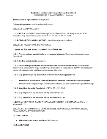 Kadzid o: Dostawa oleju nap dowego Eurodiesel OG OSZENIE O ZAMÓWIENIU - dostawy Zamieszczanie og oszenia: obowi zkowe. Og oszenie dotyczy: zamówienia publicznego. SEKCJA I: ZAMAWIAJ CY I. 1) NAZWA I ADRES: Zespó Obs ugi Szkó i Przedszkoli, ul. Targowa 4, 07-420 Kadzid o, woj. mazowieckie, tel. 0-29 7618143, faks 0-29 7618143. I. 2) RODZAJ ZAMAWIAJ CEGO: Administracja samorz dowa. SEKCJA II: PRZEDMIOT ZAMÓWIENIA II.1) OKRE LENIE PRZEDMIOTU ZAMÓWIENIA II.1.1) Nazwa nadana zamówieniu przez zamawiaj cego: Dostawa oleju nap dowego Eurodiesel. II.1.2) Rodzaj zamówienia: dostawy. II.1.3) Okre lenie przedmiotu oraz wielko ci lub zakresu zamówienia: Przedmiotem zamówienia jest dostawa oleju nap dowego Eurodiesel w ilo ci oko o 22 000l do autobusów szkolnych sukcesywnie wed ug potrzeb zamawiaj cego.. II.1.4) Czy przewiduje si udzielenie zamówie uzupe niaj cych: tak. Okre lenie przedmiotu oraz wielko ci lub zakresu zamówie uzupe niaj cych Dostawa oleju nap dowego Eurodiesel w zakresie do 20% zamówienia podstawowego II.1.5) Wspólny S ownik Zamówie (CPV): 23.12.12.00-3. II.1.6) Czy dopuszcza si z enie oferty cz ciowej: nie. II.1.7) Czy dopuszcza si z enie oferty wariantowej: nie. II.2) CZAS TRWANIA ZAMÓWIENIA LUB TERMIN WYKONANIA: Okres w miesi cach: 12. SEKCJA III: INFORMACJE O CHARAKTERZE PRAWNYM, EKONOMICZNYM, FINANSOWYM I TECHNICZNYM III.1) WADIUM Informacja na temat wadium: Nie dotyczy. III.2) ZALICZKI Czy przewiduje si udzielenie zaliczek na poczet wykonania zamówienia: nie III.3) WARUNKI UDZIA U W POST POWANIU ORAZ OPIS SPOSOBU DOKONYWANIA OCENY SPE NIANIA TYCH WARUNKÓW III.3.1) Uprawnienia do wykonywania okre lonej dzia alno ci lub czynno ci, je eli przepisy prawa nak adaj obowi zek ich posiadania Opis sposobu dokonywania oceny spe niania tego warunku Aktualna koncesja na dystrybucj paliw p ynnych. Wykonawca spe nia ten warunek je eli dysponuje aktualna koncesj na dystrybucje paliw p ynnych. III.3.2) Wiedza i do wiadczenie o Opis sposobu dokonywania oceny spe niania tego warunku Nie dotyczy III.3.3) Potencja techniczny o Opis sposobu dokonywania oceny spe niania tego warunku o Nie dotyczy III.3.4) Osoby zdolne do wykonania zamówienia Opis sposobu dokonywania oceny spe niania tego warunku Nie dotyczy III.3.5) Sytuacja ekonomiczna i finansowa o Opis sposobu dokonywania oceny spe niania tego warunku o Nie dotyczy III.4) INFORMACJA O O WIADCZENIACH LUB DOKUMENTACH, JAKIE MAJ DOSTARCZY WYKONAWCY W CELU POTWIERDZENIA SPE NIANIA WARUNKÓW UDZIA U W POST POWANIU ORAZ NIEPODLEGANIA WYKLUCZENIU NA PODSTAWIE ART. 24 UST. 1 USTAWY III.4.1) W zakresie wykazania spe niania przez wykonawc warunków, o których mowa w art. 22 ust. 1 ustawy, oprócz o wiadczenia o spe nieniu warunków udzia u w post powaniu, nale y przed : koncesj , zezwolenie lub licencj III.4.2) W zakresie potwierdzenia niepodlegania wykluczeniu na podstawie art. 24 ust. 1 ustawy, nale y przed : wiadczenie o braku podstaw do wykluczenia aktualne za wiadczenie w ciwego naczelnika urz du skarbowego potwierdzaj ce, e wykonawca nie zalega z op acaniem podatków lub za wiadczenie, e uzyska przewidziane prawem zwolnienie, odroczenie lub roz enie na raty zaleg ych p atno ci lub wstrzymanie w ca ci wykonania decyzji w ciwego organu - wystawione nie wcze niej ni 3 miesi ce przed up ywem terminu sk adania wniosków o dopuszczenie do udzia u w post powaniu o udzielenie zamówienia albo sk adania ofert aktualne za wiadczenie w ciwego oddzia u Zak adu Ubezpiecze Spo ecznych lub Kasy Rolniczego Ubezpieczenia Spo ecznego potwierdzaj ce, e wykonawca nie zalega z op acaniem sk adek na ubezpieczenie zdrowotne i spo eczne, lub potwierdzenie, e uzyska przewidziane prawem zwolnienie, odroczenie lub roz enie na raty zaleg ych p atno ci lub wstrzymanie w ca ci wykonania decyzji ciwego organu - wystawione nie wcze niej ni 3 miesi ce przed up ywem terminu sk adania wniosków o dopuszczenie do udzia u w post powaniu o udzielenie zamówienia albo sk adania ofert III.4.3) Dokumenty podmiotów zagranicznych Je eli wykonawca ma siedzib lub miejsce zamieszkania poza terytorium Rzeczypospolitej Polskiej, przedk ada: III.4.3.1) dokument wystawiony w kraju, w którym ma siedzib lub miejsce zamieszkania potwierdzaj cy, e: nie otwarto jego likwidacji ani nie og oszono upad ci - wystawiony nie wcze niej ni 6 miesi cy przed up ywem terminu sk adania wniosków o dopuszczenie do udzia u w post powaniu o udzielenie zamówienia albo sk adania ofert nie zalega z uiszczaniem podatków, op at, sk adek na ubezpieczenie spo eczne i zdrowotne albo e uzyska przewidziane prawem zwolnienie, odroczenie lub roz enie na raty zaleg ych p atno ci lub wstrzymanie w ca ci wykonania decyzji w ciwego organu - wystawiony nie wcze niej ni 3 miesi ce przed up ywem terminu sk adania wniosków o dopuszczenie do udzia u w post powaniu o udzielenie zamówienia albo sk adania ofert nie orzeczono wobec niego zakazu ubiegania si o zamówienie - wystawiony nie wcze niej ni 6 miesi cy przed up ywem terminu sk adania wniosków o dopuszczenie do udzia u w post powaniu o udzielenie zamówienia albo sk adania ofert III.4.3.2) za wiadczenie w ciwego organu s dowego lub administracyjnego miejsca zamieszkania albo zamieszkania osoby, której dokumenty dotycz , w zakresie okre lonym w art. 24 ust. 1 pkt 4-8 ustawy - wystawione nie wcze niej ni 6 miesi cy przed up ywem terminu sk adania wniosków o dopuszczenie do udzia u w post powaniu o udzielenie zamówienia albo sk adania ofert - albo o wiadczenie one przed notariuszem, w ciwym organem s dowym, administracyjnym albo organem samorz du zawodowego lub gospodarczego odpowiednio miejsca zamieszkania osoby lub kraju, w którym wykonawca ma siedzib lub miejsce zamieszkania, je eli w miejscu zamieszkania osoby lub w kraju, w którym wykonawca ma siedzib lub miejsce zamieszkania, nie wydaje si takiego za wiadczenia III.6) INNE DOKUMENTY Inne dokumenty niewymienione w pkt III.4) albo w pkt III.5) 1. O wiadczenie Wykonawcy, e spe nia warunki udzia u w post 