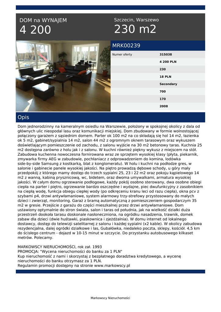 DOM na WYNAJEM 4 200 Szczecin, Warszewo 230 m2 MRK00239 Numer oferty 315038 4 200 PLN 230 18 PLN Secondary 700 170 2008 Opis Dom jednorodzinny na kameralnym osiedlu na Warszewie, położony w spokojnej okolicy z dala od głównych ulic nieopodal lasu oraz komunikacji miejskiej. Dom zbudowany w formie wolnostojącej połączony garażem z sąsiednim domem. Parter ok 100 m2 na co składają się hol 14 m2, łazienka ok 5 m2, gabinet/sypialnia 14 m2, salon 44 m2 z ogromnym oknem tarasowym oraz wykuszem doświetlającym pomieszczenie od zachodu, z salonu wyjście na 30 m2 betonowy taras. Kuchnia 25 m2 dostępna zarówno z holu jak i z salonu. W kuchni również piękny wykusz z miejscem na stół. Zabudowa kuchenna nowoczesna fornirowana wraz ze sprzętem wysokiej klasy (płyta, piekarnik, zmywarka firmy AEG w zabudowie, pochłaniacz z odprowadzeniem do komina, lodówka side-by-side Samsung z kostkarką, blat z konglomeratu). W holu i kuchni na podłodze gres, w salonie i gabinecie panele wysokiej jakości. Na piętro prowadzą dębowe schody, u góry mały przedpokój z którego mamy dostęp do trzech sypialni 25, 23 i 22 m2 oraz pokoju kąpielowego 14 m2 z wanną, kabiną prysznicową, wc, bidetem, oraz dwoma umywalkami, armatura wysokiej jakości. W całym domu ogrzewanie podłogowe, każdy pokój osobno sterowany, dwa osobne obiegi ciepła na parter i piętro, ogrzewanie bardzo oszczędne i wydajne, piec dwufunkcyjny z zasobnikiem na ciepłą wodę, funkcja obiegu ciepłej wody (po odkręceniu kranu leci od razu ciepła), okna pcv z szybami p4, drzwi antywłamaniowe, system alarmowy trzy-strefowy przystosowany do małych dzieci i zwierząt, monitoring. Garaż z bramą automatyczną z pomieszczeniem gospodarczym 35 m2 w gresie. Przejście z garażu do części mieszkalnej przez drzwi antywłamaniowe. Dom ustawiony optymalnie do stron świata, salon i taras od południa, jak na wielkość działki duża przestrzeń dookoła tarasu doskonale nasłoneczniona, na ogródku nasadzenia, trawnik, domek zabaw dla dzieci (dwie huśtawki, piaskownica i zjeżdżalnia). W domu internet od lokalnego dostawcy, dostęp do telewizji satelitarnej z salonu i każdej sypialni (x2 kable). W okolicy zabudowa rezydencjalna, dalej ogródki działkowe i las, Gubałówka, niedaleko poczta, sklepy, kościół. 4,5 km do ścisłego centrum - dojazd w 10-15 minut w szczycie. Do przystanku autobusowego kilkaset metrów. Polecamy. MARKOWSCY NIERUCHOMOŚCI, rok zał. 1993 PROMOCJA: "Wycena nieruchomości do banku za 1 PLN" Kup nieruchomość z nami i skorzystaj z bezpłatnego doradztwa kredytowego, a wycenę nieruchomości do banku otrzymasz za 1 PLN. Regulamin promocji dostępny na stronie www.markowscy.pl Markowscy Nieruchomości Marcin Markowski tel. +48 790 333 444 email: [email protected] Markowscy Nieruchomości Powered by TCPDF (www.tcpdf.org)