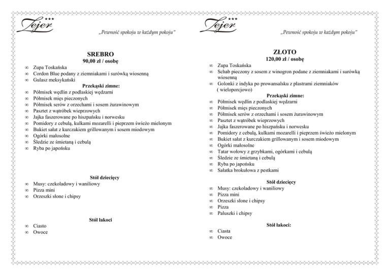„Pewność spokoju w każdym pokoju” „Pewność spokoju w każdym pokoju” ZŁOTO SREBRO • • • 90,00 zł / osobę • • • • • • • • • • Zupa Toskańska Cordon Blue podany z ziemniakami i surówką wiosenną Gulasz meksykański Przekąski zimne: Półmisek wędlin z podlaskiej wędzarni Półmisek mięs pieczonych Półmisek serów z orzechami i sosem żurawinowym Pasztet z wątróbek wieprzowych Jajka faszerowane po hiszpańsku i norwesku Pomidory z cebulą, kulkami mozarelli i pieprzem świeżo mielonym Bukiet sałat z kurczakiem grillowanym i sosem miodowym Ogórki małosolne Śledzie ze śmietaną i cebulą Ryba po japońsku • • • Stół dziecięcy Musy: czekoladowy i waniliowy Pizza mini Orzeszki słone i chipsy • • Ciasto Owoce • • 120,00 zł / osobę • • • • • • • • • • • • Zupa Toskańska Schab pieczony z sosem z winogron podane z ziemniakami i surówką wiosenną Golonki z indyka po prowansalsku z plastrami ziemniaków ( wieloporcjowo) Przekąski zimne: Półmisek wędlin z podlaskiej wędzarni Półmisek mięs pieczonych Półmisek serów z orzechami i sosem żurawinowym Pasztet z wątróbek wieprzowych Jajka faszerowane po hiszpańsku i norwesku Pomidory z cebulą, kulkami mozarelli i pieprzem świeżo mielonym Bukiet sałat z kurczakiem grillowanym i sosem miodowym Ogórki małosolne Tatar wołowy z grzybkami, ogórkami i cebulą Śledzie ze śmietaną i cebulą Ryba po japońsku Sałatka brokułowa z pestkami • • • • • Stół dziecięcy Musy: czekoladowy i waniliowy Pizza mini Orzeszki słone i chipsy Pizza Paluszki i chipsy • • Ciasta Owoce • Stół łakoci Stół łakoci: „Pewność spokoju w każdym pokoju” „Pewność spokoju w każdym pokoju” Menu dla dzieci Do wyboru: • Rosół z makaronem • Pomidorowa z makaronem • • • MENU Nugetsy z kurczaka z sosem pomidorowym z ziemniakami gotowanymi i sałatką wiosenną Pierś z kurczaka z grilla i ziemniakami gotowanymi z sałatką wiosenną Kotlet schabowy z ziemniakami gotowanymi i sałatką wiosenną KOMUNIA 2012 Dodatkowo można zamówić: • Szczupak faszerowany: 120,00 zł • Marcinek tradycyjny: 100,00 zł • Sękacz tradycyjny: 130,00 zł • Desery lodowe: 9zł /szt. MK Zejer Krzysztof Zejer, Marta Zejer spółka cywilna 16-070 Choroszcz, Barszczewo 2A: tel. (0-85) 719 27 72 www.zejer.pl [email protected] MK Zejer Krzysztof Zejer, Marta Zejer spółka cywilna 16-070 Choroszcz, Barszczewo 2A: tel. (0-85) 719 27 72 [email protected] www.zejer.pl