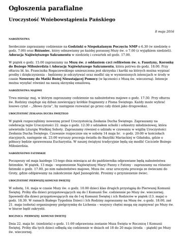 Ogłoszenia parafialne Uroczystość Wniebowstąpienia Pańskiego 8 maja 2016 NABOŻEŃSTWA Serdecznie zapraszamy codziennie na Godzinki o Niepokalanym Poczęciu NMP o 6.30 (w niedzielę o godz. 7.00) oraz Różaniec, który odmawiamy po każdej porannej Mszy św. o 7.00 (z wyjątkiem niedzieli). Adoracja Najświętszego Sakramentu w niedzielę i czwartek od godz. 17.00. W piątek o godz. 15.00 zapraszamy na Mszę św. z oddaniem czci relikwiom św. s. Faustyny, Koronkę do Bożego Miłosierdzia i Adorację Najświętszego Sakramentu, która potrwa do godz. 18.00. Przy ołtarzu bł. ks. Franciszka Rogaczewskiego umieszczona jest skrzynka i kartki na których można wypisać prośby i dziękczynienia – będziemy je odczytywać oraz modlić się w wymienionych intencjach w środy w czasie Nowenny do Matki Bożej Nieustającej Pomocy (w łączności z Mszą św. wieczorną). Intencje można wysyłać również na naszą skrzynkę emailową. NABOŻEŃSTWA MAJOWE Trwa miesiąc maj, w którym zapraszamy codziennie na nabożeństwa majowe o godz. 17:30. Przy ołtarzu św. Rodziny znajduje się dzban zawierający krótkie fragmenty z Pisma Świętego. Każdy może wybrać losowo cytat – „Słowo życia”, by następnie rozważać go przez cały dzień jako drogowskaz. UROCZYSTOŚĆ ZESŁANIA DUCHA ŚWIĘTEGO W piątek rozpoczęliśmy nowennę przed Uroczystością Zesłania Ducha Świętego. Zapraszamy na celebrację tejże Uroczystości 22. maja o godz. 12:30 z udziałem scholii i orkiestry młodzieżowej, która uświetniła Liturgię Wielkiej Soboty. Zapraszamy również o udziału w czuwaniu w wigilię Uroczystości Zesłania Ducha Świętego. Czuwanie rozpocznie się w sobotę 14 maja br. o godz. 20:00 w kościołach stacyjnych, następnie ok. 23.00 wyruszy procesja światła do Bazyliki Mariackiej w Gdańsku, gdzie o północy będzie sprawowana Eucharystia. W naszej świątyni tradycyjnie będą się modlić Czciciele Bożego Miłosierdzia. NABOŻEŃSTWO FATIMSKIE Począwszy od maja każdego 13-tego dnia miesiąca aż do października odprawiane będą nabożeństwa fatimskie. W piątek, 13 maja - wspomnienie Najświętszej Maryi Panny z Fatimy - zapraszamy na różaniec fatimski o godz. 17.00, po nim nabożeństwo majowe, Msza św. oraz uroczysta procesja ze świecami do Groty, gdzie odśpiewamy na zakończenie Apel Jasnogórski. Prosimy o przyniesienie świec. UROCZYSTOŚĆ PIERWSZEJ KOMUNII ŚWIĘTEJ W sobotę, 14. maja w czasie Mszy św. o godz. 10.00 dzieci klas drugich przystąpią do Pierwszej Komunii Świętej. Próby dla dzieci przygotowujących się do I Komunii Św. codziennie po Mszy św. wieczornej. Spowiedź dla dzieci przygotowujących się do I-ej Komunii Świętej i ich Rodziców w piątek (13. maja) o godz. 18.30. W ramach Białego Tygodnia Dzieci i Ich Rodziny zapraszamy na Mszę św. o godz. 18.00, zaś 21. maja (sobota) organizujemy pielgrzymkę do Lichenia – wszyscy chętni mogą się zapisywać po Mszy św. w biurze bądź zakrystii. ROCZNICA PIERWSZEJ KOMUNII ŚWIETEJ Dnia 22. maja br. (niedziela) o godz. 11:00 odprawiona zostanie Msza Święta w Rocznicę I Komunii Świętej. Próby dla tych dzieci odbędą się codziennie w dniach od 18 do 20 maja (środa - piątek) po Mszy św. wieczornej. WYSTAWA ,,CZŁOWIEK BLISKO BOGA” Zapraszamy do obejrzenia w naszym kościele wystawy ,,Człowiek blisko Boga”, papieskich obrazów autorstwa Waldemara Cieślaka, malarza amatora, pracownika Stoczni Remontowa Shipbuilding SA, który w czasie powrotu z uroczystości pogrzebowych św. Jana Pawła II w Rzymie postanowił stworzyć cykl portretów Papieża, aby w ten sposób oddać Jemu hołd. Prace te wzbogacone są fragmentami homilii naszego Św. Rodaka. Wystawa ta od 1 kwietnia 2015 roku była eksponowana w siedzibie Komisji Krajowej i Zarządu Regionu Gdańskiego, później w Bazylice Św. Brygidy w Gdańsku, w kościele pw. Św. Franciszka z Asyżu na Gdańskim Emaus; dalsza trasa to Kraków, Jaworzno, Krosno, Dębica i Białystok. SPOTKANIA Spotkanie Ministrantów w poniedziałek o godz. 16:45. Zespół młodzieżowy zaprasza na próby we wtorek o godz. 18:00. Wspólnota „Stolarnia” zaprasza we wtorek o godz. 19:30. Spotkanie Kandydatów na lektorów w środę o godz. 16:45. Wspólnota „Wieczernik” zaprasza w czwartek o godz. 19:30. Spotkanie Scholki dziecięcej w niedzielę o godz. 9:45. WYJAZDY WAKACYJNE W dniach 1-10 sierpnia br. organizujemy wyjazd dla dzieci do Gowidlina. Wśród atrakcji przewidziane są m.in.: wycieczki – niespodzianki, Aquapark, quady, rowery wodne, park linowy. Zgłoszenia i dodatkowe informacje u ks. Grzegorza. PIELGRZYMKA DO WILNA Zapraszamy także na autokarowa Pielgrzymkę do Wilna w dniach 21-24 czerwca. Szczegóły na plakacie przy wyjściu z kościoła oraz u ks. Błażeja. PIELGRZYMKA DO SWARZEWA Zapraszamy także na parafialną pielgrzymkę do Swarzewa 28 maja 2016 r. Koszt 40 zł. Zapisy po Mszy Św. PRASA KATOLICKA Zachęcamy do nabycia i czytania prasy katolickiej - w sposób szczególny nowego numeru „Gościa niedzielnego” oraz naszego parafialnego biuletynu. PODZIĘKOWANIA Składamy serdeczne podziękowania za wszelkie złożone ofiary, szczególnie za złożone dzisiaj na tacę na nasze potrzeby inwestycyjne i spłatę pozostałych zobowiązań oraz wpłacone na nasze konto parafialne w banku, a także złożone w ubiegłym tygodniu do puszki na rzecz Ukrainy. Do tej zbiórki wzywał Papież Franciszek. Dziś w całej Polsce odbywa się również zbiórka do puszki na pomoc dla ofiar trzęsienia ziemi w Ekwadorze. W przyszłą niedzielę zbiórka do puszki na obiady dla najuboższych uczniów naszej Parafii. Decyzją Konferencji Episkopatu Polski ofiary zebrane w polskich świątyniach na tacę 15. maja mają być przeznaczone na organizację Światowych Dni Młodzieży w Krakowie w 2016 r. Zakończyliśmy I etap remontu salek pod kościołem (w dwóch pomieszczeniach położyliśmy płytki, pomalowaliśmy ś
