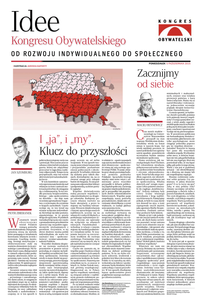Idee Kongresu Obywatelskiego O d r o z w o j u i n dy w i d u a l n e g o d o s p o ł e c z n e g o poniedziałek 5 października 2015 >ilustracja Janusza Kapusty Zacznijmy od siebie maciej Bennewicz I „ja”, i „my”. Klucz do przyszłości Jan szomburg Piotr Zbieranek W ostatnich latach obserwujemy wśród Polaków rosnącą potrzebę samodoskonalenia. Dużą popularnością cieszą się metody, które pomagają w świadomym kierowaniu własnym życiem i rozwojem. Coaching, mentoring, treningi motywacyjne i efektywnościowe stały się ważnym elementem życia prywatnego i zawodowego. Nie lubimy tracić czasu, dlatego nawet w ramach odpoczynku podejmujemy aktywności, które zapewniają nam rozwój. Niemal jak dzieci – bawimy się i uczymy jednocześnie. W opinii nauczycieli to zdecydowanie najlepsze połączenie. Szczęście oznacza więc dziś odczuwanie zadowolenia z obu ważnych dziedzin naszego życia – prywatnego i zawodowego. Nie dziwi zatem, że osiągnięcie satysfakcji wiąże się ze stałym dążeniem do rozwoju. Po skończonej pracy wkładamy buty do biegania, na uszy zakładamy słuchawki z audiobookiem i czujemy, że w ten sposób w pełni wykorzystujemy swój czas i potencjał. Wieczorem jeszcze zabawa z dziećmi lub wnukami, gazeta, której nie zdążyliśmy przeczytać w ciągu dnia, i zasłużony odpoczynek. Tempo życia przyspieszyło, więc ten wzrost aktywności jest naturalną koleją rzeczy. W tym kontekście samorozwój zapewnia nam kontrolę nad własnym życiem i zastrzyk motywacji potrzebny do zmagania się z codziennością. To też źródło poczucia bezpieczeństwa, którego – jako społeczeństwu na dorobku – nie daje nam wcześniej zgromadzone bogactwo, z czym mamy do czynienia w krajach zachodnich. Często wydaje się, że ten trend ma wymiar wyłącznie indywidualny. Krytykuje się takie postawy, argumentując, że to prosta droga do egotyzmu. W polskich warunkach łączą się one często z gromadzeniem przedmiotów i przeżyć (np. wyjazdów zagranicznych) utożsamianych z prestiżem. Oczywiście, w tej sferze dostrzec można polski indywidualizm, ale warto też zauważyć inny – społecznotwórczy – wymiar samodoskonalenia Polaków. Wszystkie działania skupione na rozwoju osobistych przymiotów w gruncie rzeczy powodują, że czujemy się ludźmi bardziej szczęśliwymi i bardziej spełnionymi. Jesteśmy wtedy w stanie dzielić się pozytywną energią, przezwyciężając niepewność egzystencjalną. Kiedy rozwijamy siebie, rozszerzamy nasz światopogląd, uczymy się nowych kompetencji, także społecznych, dajemy coś z siebie innym. Wiele naszych aktywności – ukierunkowanych na odczuwanie przyjemności i satysfakcji – podejmujemy wspólnie z innymi. Wspólne bieganie, nauka języków w grupie obcokrajowców, wolontariat – ich spoiwem jest bycie ze sobą, rozwijanie swoich pasji, uczenie się od siebie wzajemnie. W ten sposób tworzą się nowe relacje towarzyskie i przyjacielskie, pozbawione emocji politycznych i ideologicznych. To od ludzi, z którymi się stykamy przy takich okazjach, dowiadujemy się, na co zwracać uwagę przy zakupie butów do biegania. To oni podsuną nam odpowiednie lektury i podpowiedzą, na które portale zaglądać. Wspólne doświadczenia rodzą poczucie wspólnoty i odpowiedzialności za drugiego człowieka. Budujemy poczucie własnej wartości na bazie akceptacji, a przez to stajemy się bardziej tolerancyjni. Wreszcie dzięki relacjom z innymi, spoza kręgu naszych najbliższych, uczymy się na własnych i cudzych błędach, a podejmując najważniejsze życiowe decyzje, nie opieramy się wyłącznie na własnych emocjach. Paradoksalnie – wchodząc w relacje z innymi, stajemy się bardziej podmiotowi i świadomi siebie. Te wzajemnie korzyści są rzeczywistym środkiem do rozwoju osobistego. Powinniśmy więc otworzyć się na innych, aby w jak największej mierze czerpać z tego procesu. Często nie zauważa się, że wspólne pasje i budowa relacji z innymi ludźmi o tych samych zainteresowaniach są również pierwszym krokiem do budowy społeczności. Stanowią one remedium na to, co jeszcze w latach 70. Stefan Nowak nazywał „próżnią socjologiczną”. Diagnozował on, że Polacy, oprócz wspólnoty narodowej, są związani jedynie z najbliższym gronem rodzinnym; pomiędzy tymi poziomami występuje zaś wspomniana próżnia. Po 25 latach wolności widać już, że nie wypełnią jej organizacje pozarządowe – polska dusza narodowa odrzuca bowiem to, co sformalizowane. Możliwe, że to właśnie te – oparte na pasjach najczęściej niesformalizowane i dość efemeryczne – społeczności staną się osią rozwoju społecznego Polski. To pasje, niejako przy okazji, pozwalają budować pomosty pomiędzy Polakami – łączą ludzi, tworząc między nimi nowe więzi i, odmieniany przez wszystkie przypadki w debacie publicznej, kapitał społeczny. Zacierają się granice międzypokoleniowe, jak w przypadku tak popularnych zlotów rekonstruktorów historycznych. Wspólne pasje zaspokajają naszą potrzebę przynależności, dzięki nim odczuwamy identyfikację z czymś większym, co nadaje głębszy sens naszemu życiu. I tak dzięki potrzebie rozwoju osobistego wytwarza się nowa jakość, podglebie dla synergicznej współpracy na różnych polach. Chodzi tu przede wszystkim o zdobywanie kompetencji potrzebnych do przełamania wsobności i otwarcia się na drugiego człowieka. A stąd już tylko krok do tworzenia się bardziej dojrzałych – opartych na otwartości, zaufaniu i współpracy – klastrów i ekosystemów gospodarczych czy też lokalnych i regionalnych wspólnot obywatelskich. Wspólne działanie może stanowić remedium na słabość polskiego państwa. To tu, na styku różnych sektorów, środowisk i pokoleń, leży klucz do rozwoju Polski; to tu narodzą się idee, wykształcą się liderzy i podejmowane będą działania, które zadecydują o naszej przys