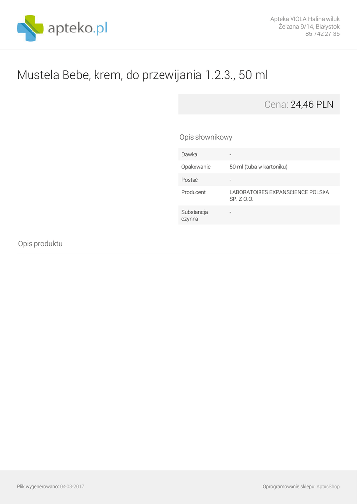 Apteka VIOLA Halina wiluk Żelazna 9/14, Białystok 85 742 27 35 Mustela Bebe, krem, do przewijania 1.2.3., 50 ml Cena: 24,46 PLN Opis słownikowy Dawka - Opakowanie 50 ml (tuba w kartoniku) Postać - Producent LABORATOIRES EXPANSCIENCE POLSKA SP. Z O.O. Substancja czynna - Opis produktu Plik wygenerowano: 04-03-2017 Powered by TCPDF (www.tcpdf.org) Oprogramowanie sklepu: AptusShop